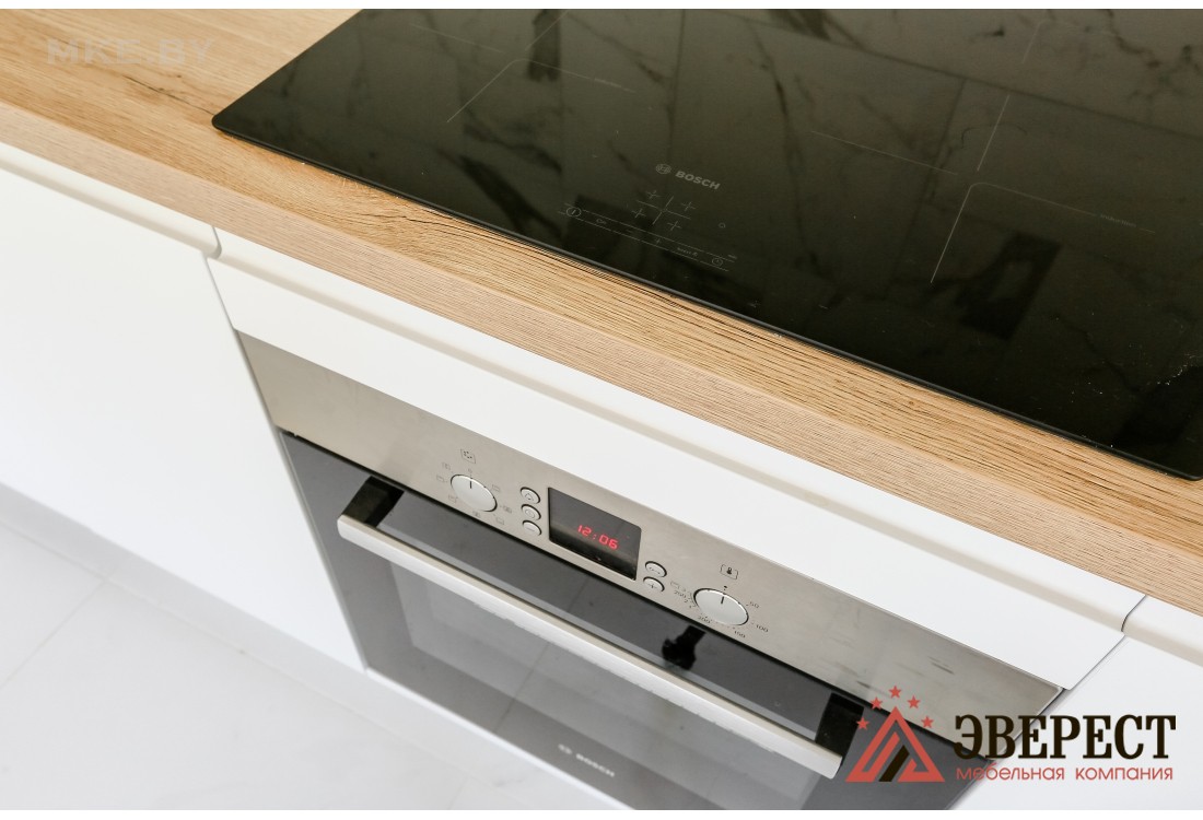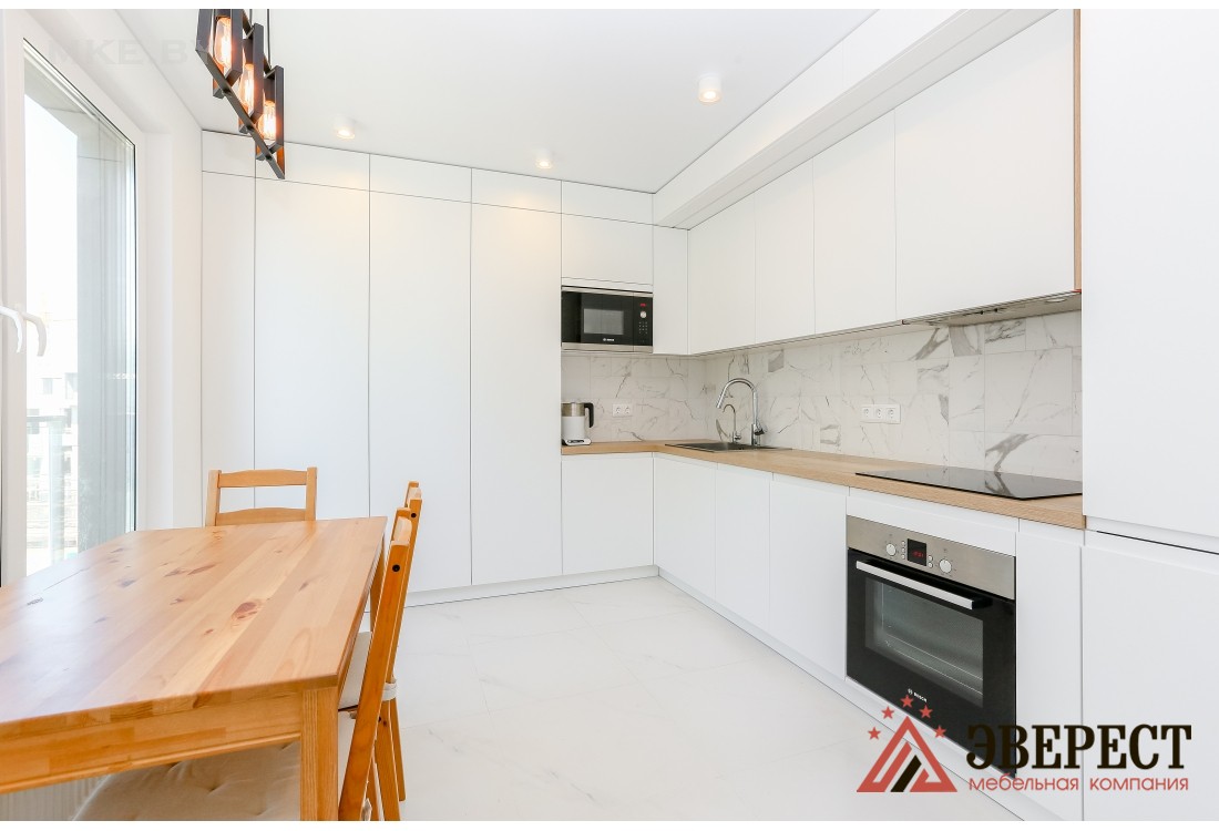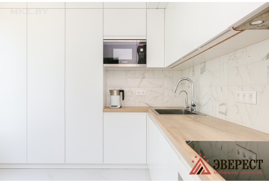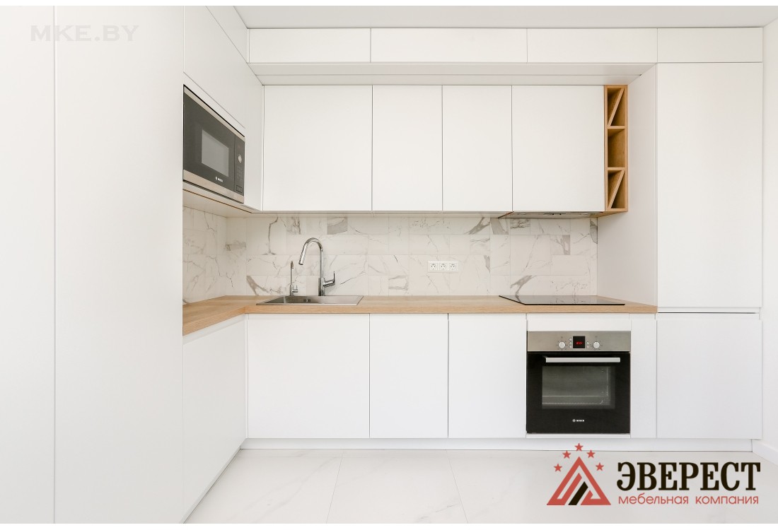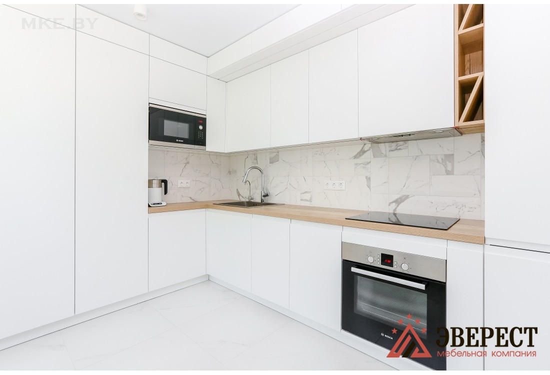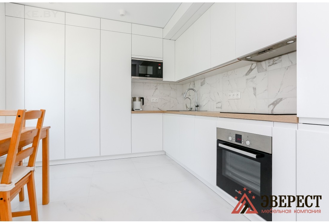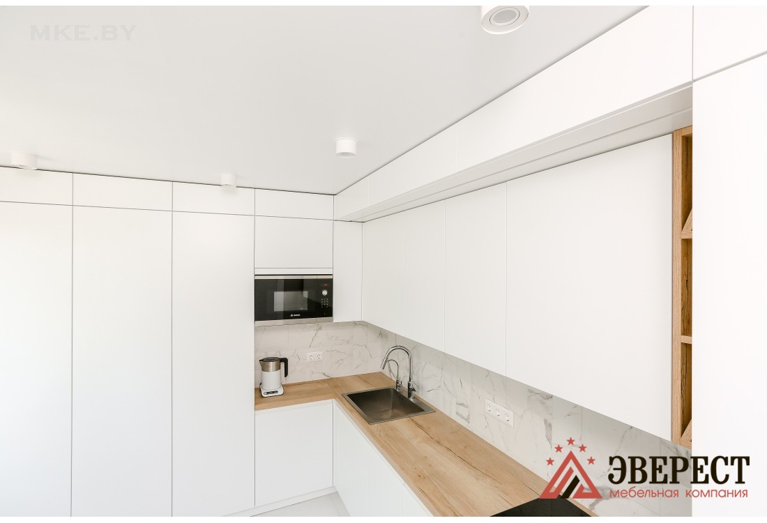 Утонченная угловая кухня с высокими фасада под потолок. Модель изготовлена из МДФ и исполнена в белом глянце. Верхние фасады оборудованы системой открытия Tip-on. Для удобства готовки рабочая зона освещается подсветкой. Конструкция имеет отсеки для кухонной техники.