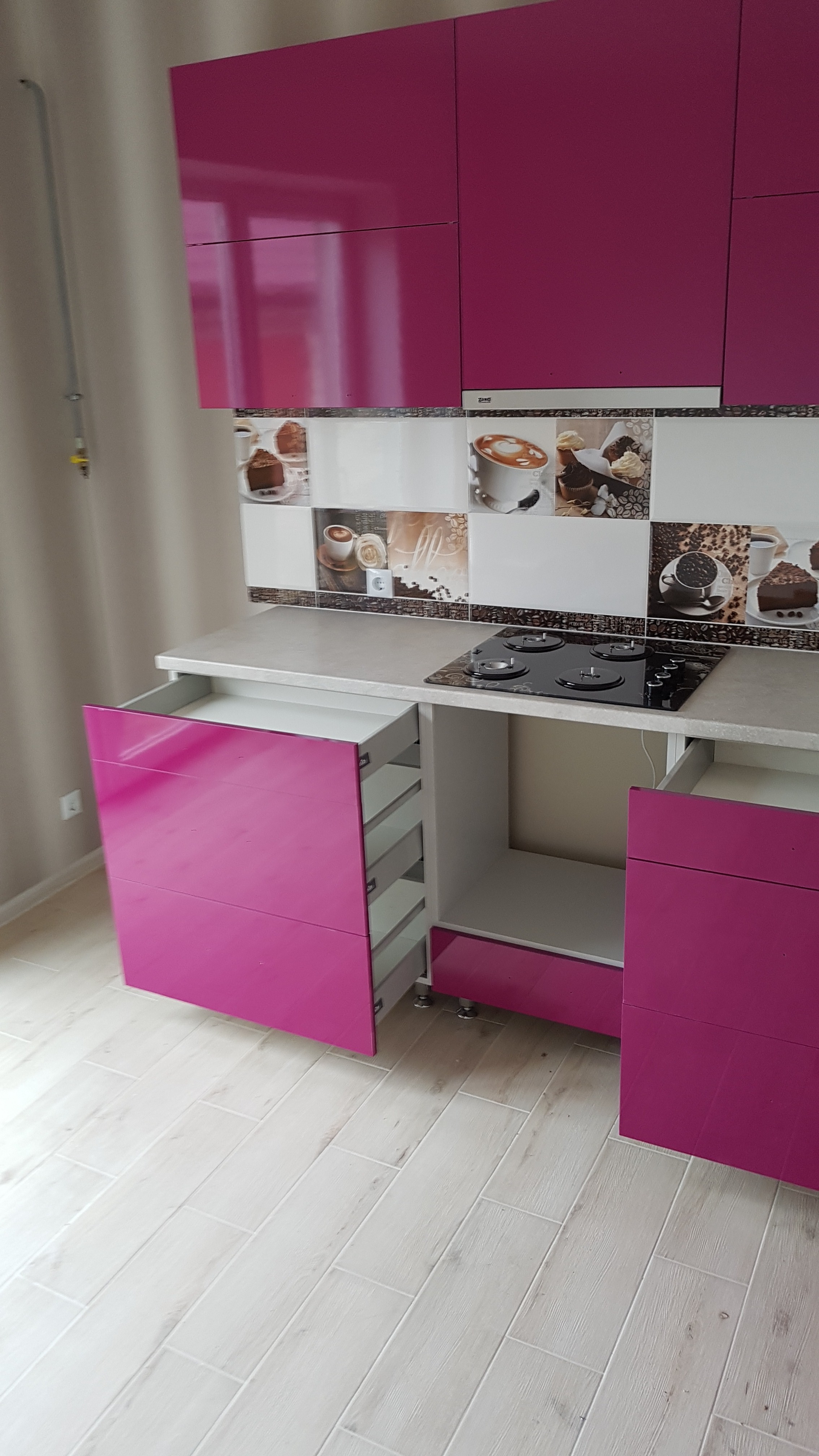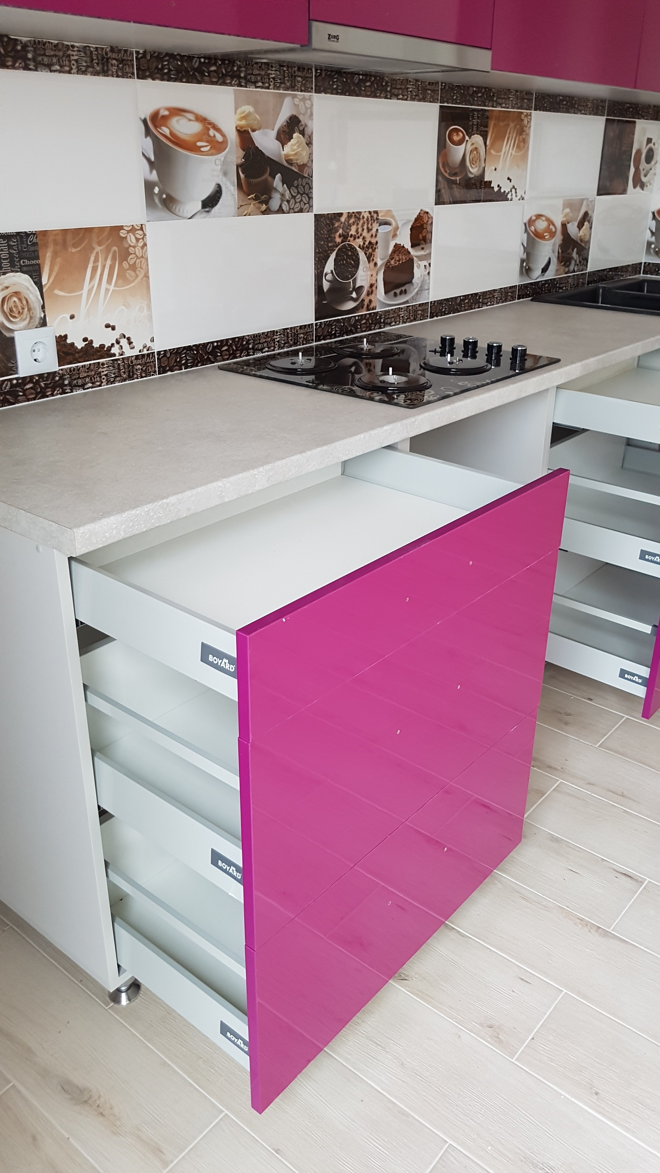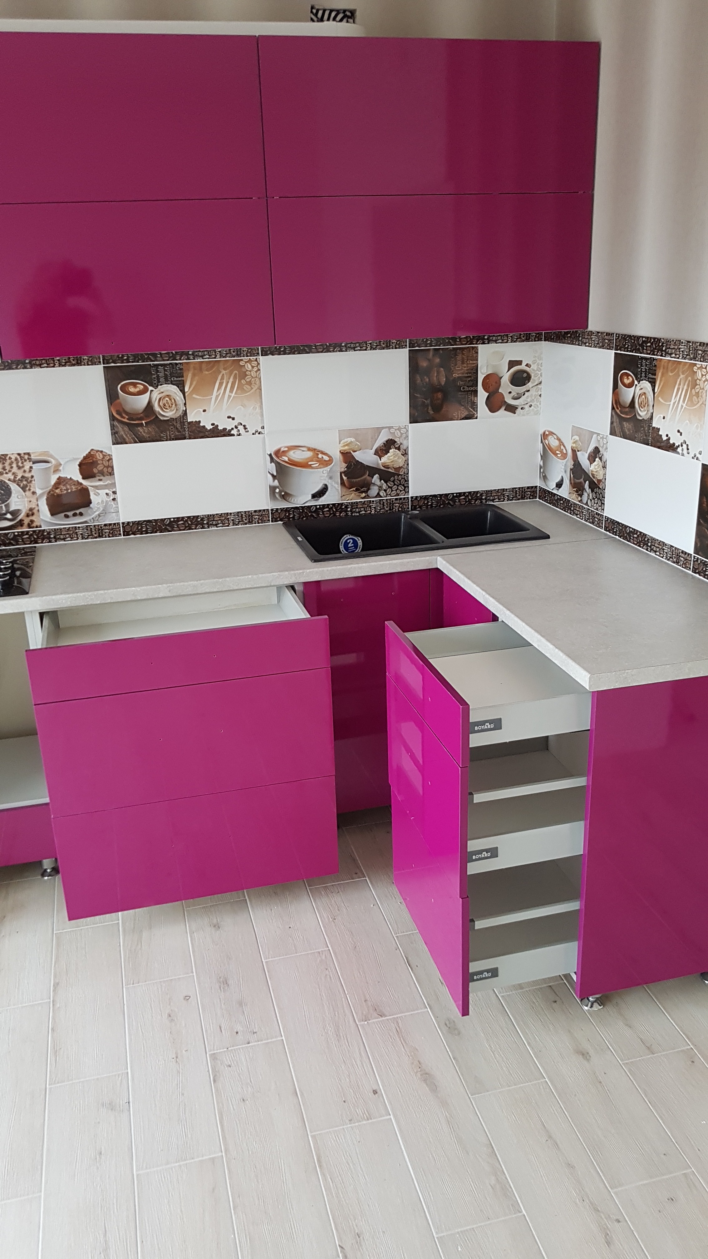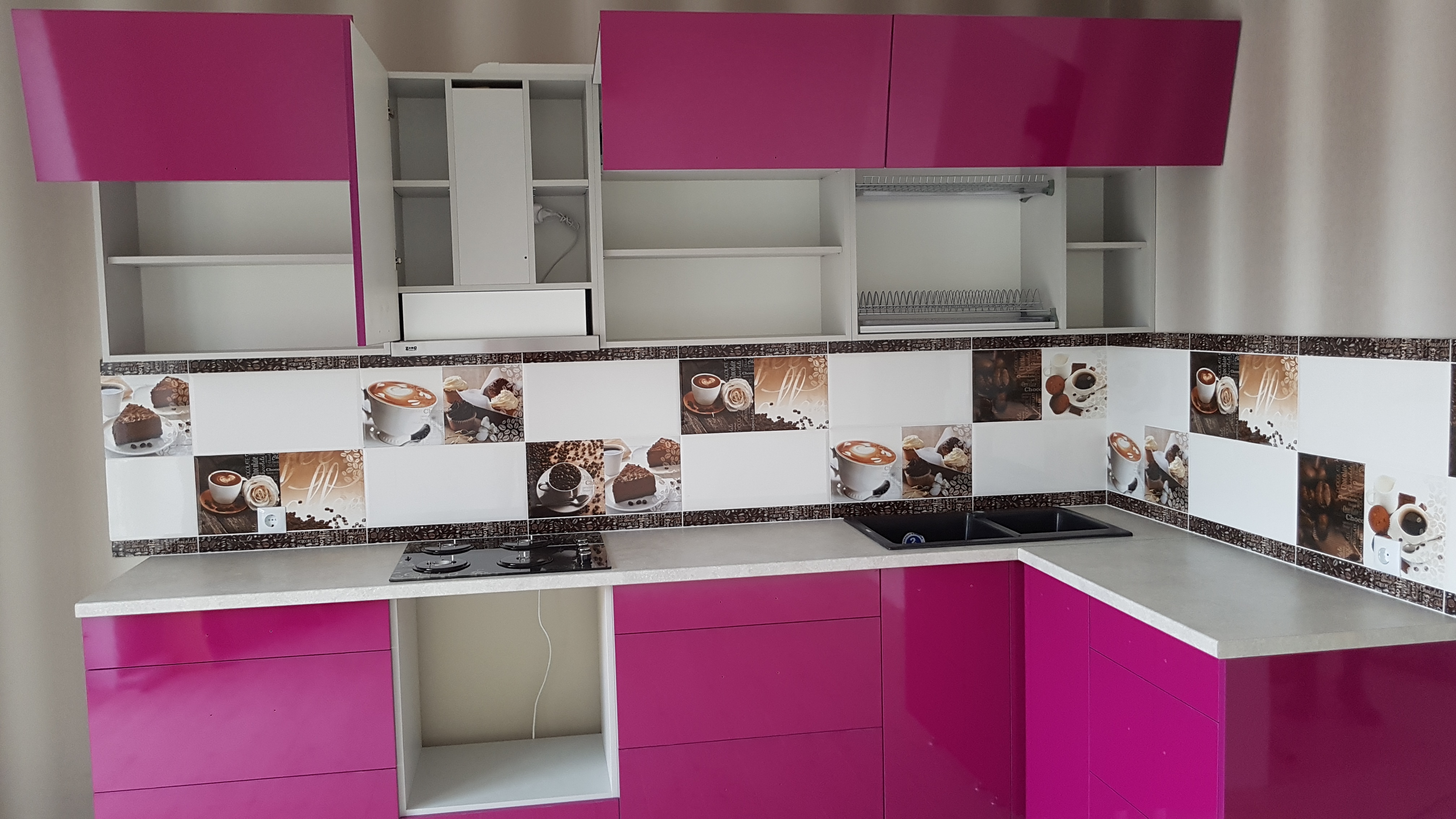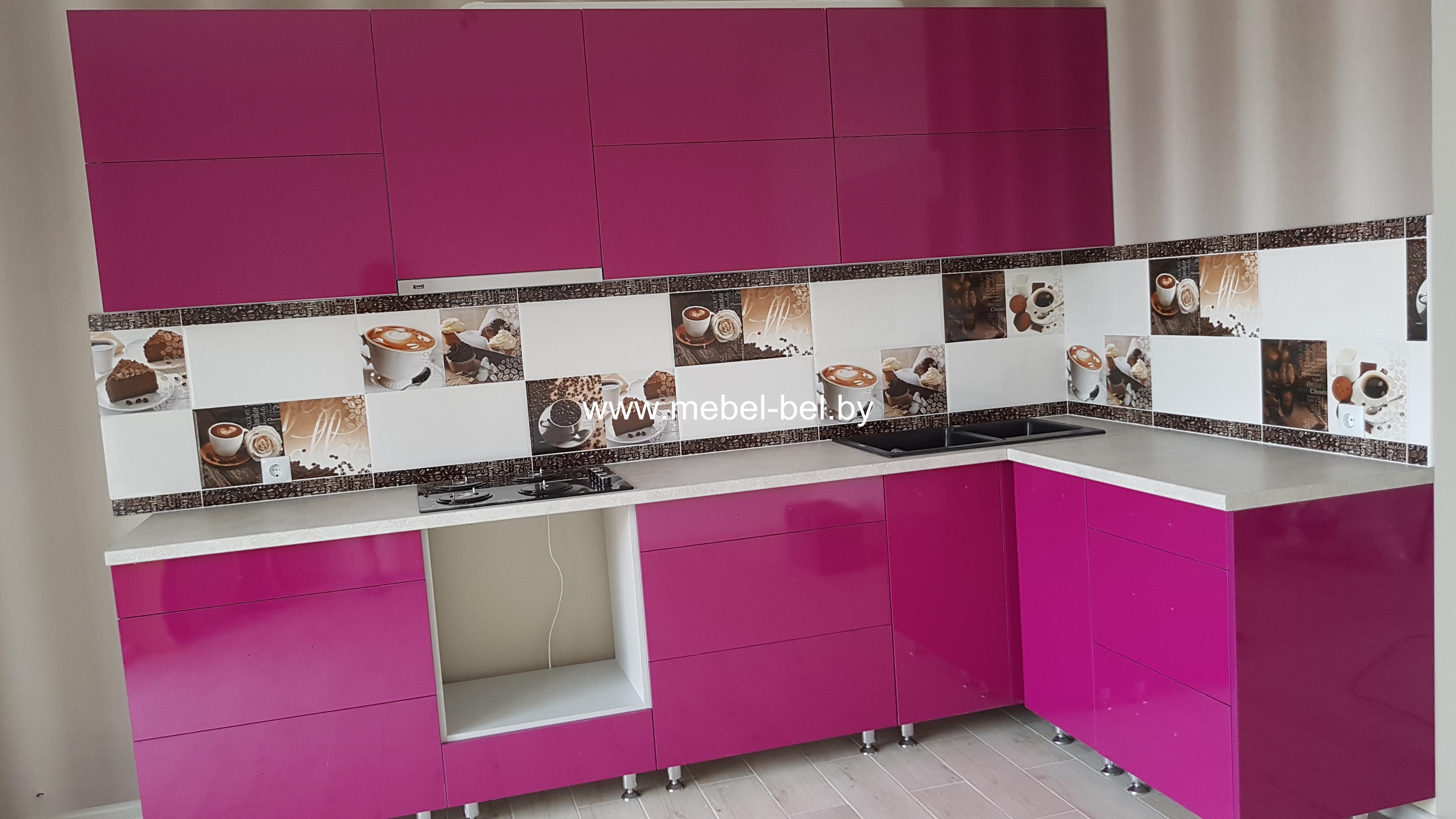 Для данной модели кухни характерны глянцевые переливы. Фасад выполнен в малиновом цвете, фурнитура в металлическом. Столешница выделяется за счет белого окраса. Есть ниша для встраиваемой техники.