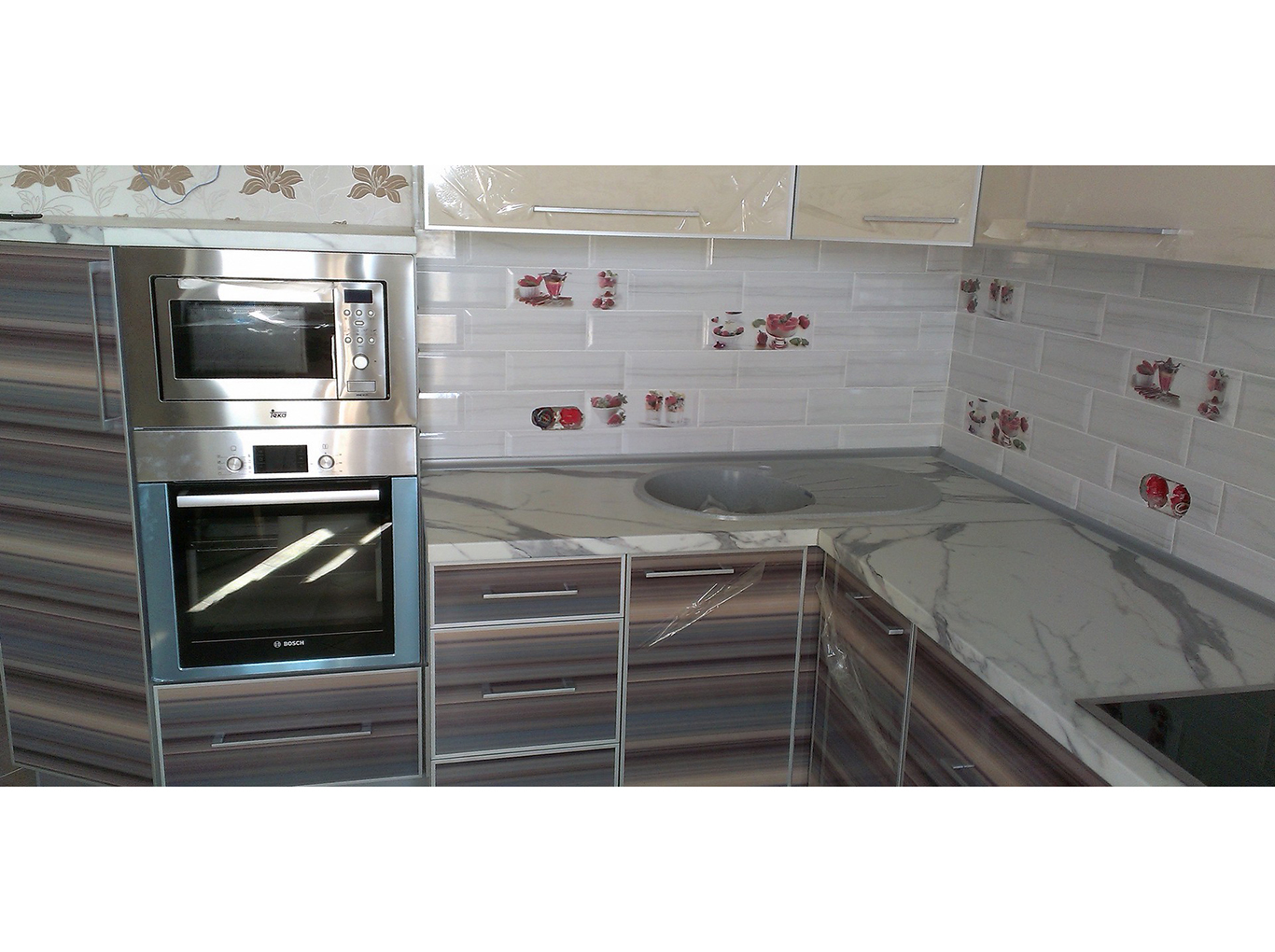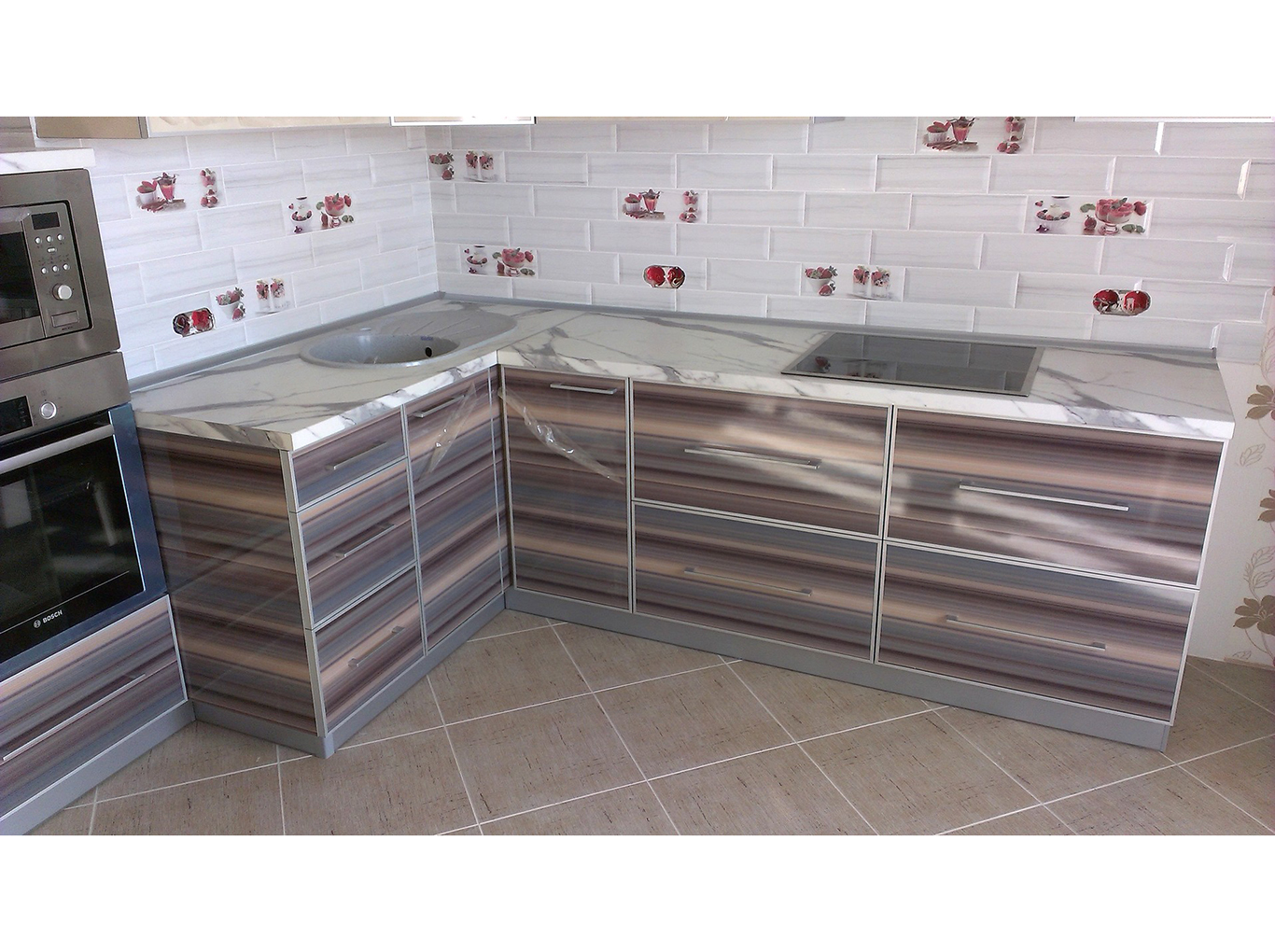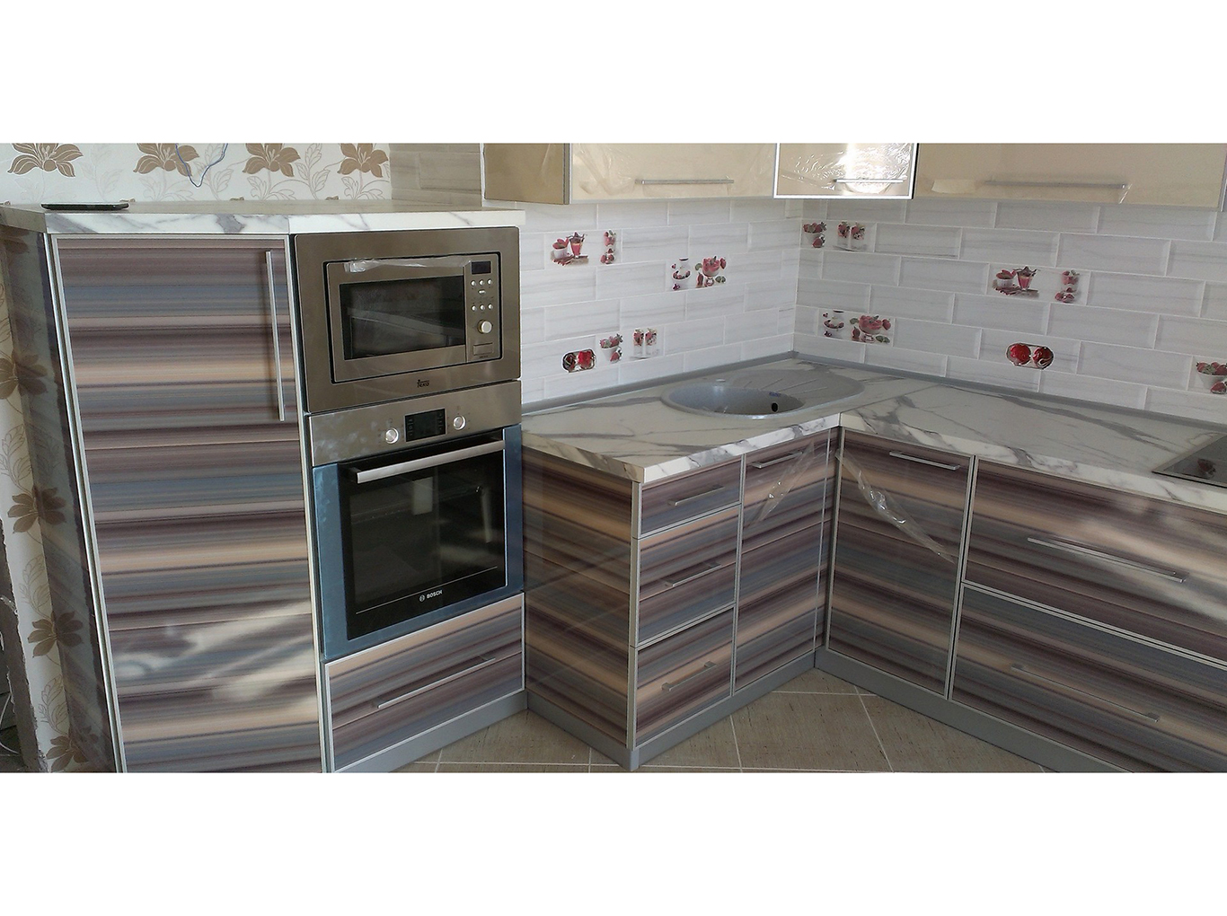Угловая глянецвая кухня «Зебрано – Кремовый» изготовлена в практичном дизайне с оформление фасадов верхних шкафчиков в кремовый цвет, с отделкой алюминиевыми планками. Комфортная столешница ламинирована в бело-сером обрамлении. Отличительной особенностью модели является отдельный модуль под встроенную технику.