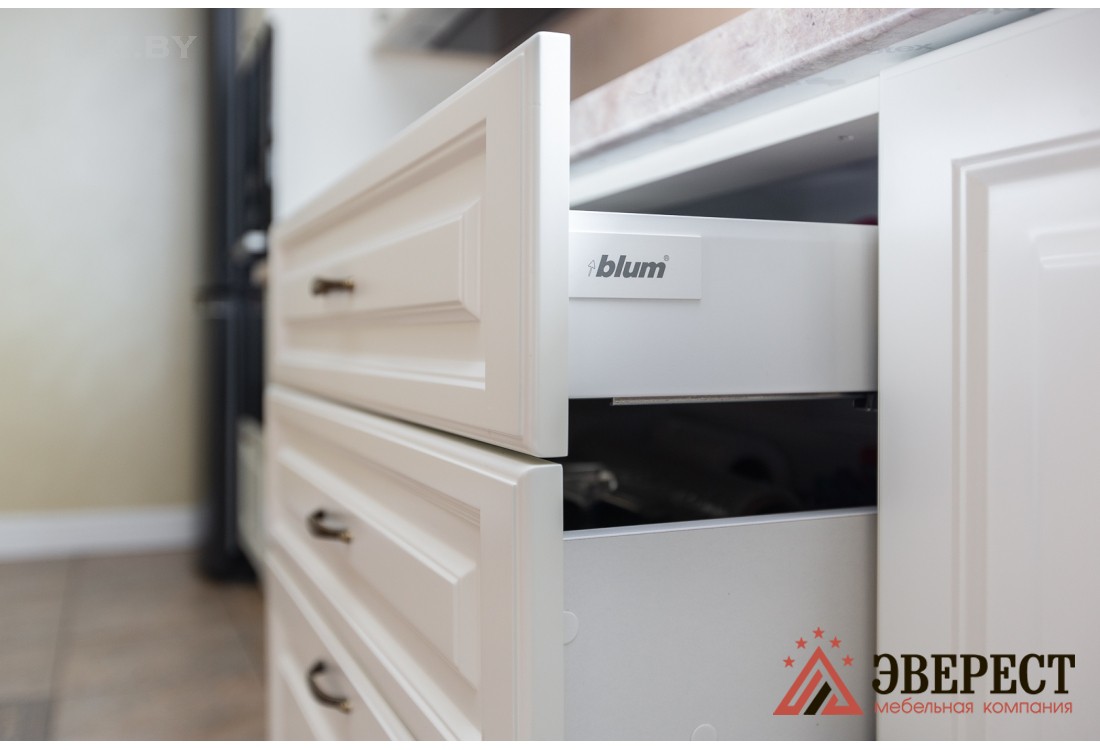 Угловая кухня с фрезерованными фасадами выполнена в классическом варианте и изготовлена из крашеного МДФ. МДФ - надежный и прочный материал, обладает высокой устойчивостью к влаге и перепадам температур. Модель оснащена нишами для холодильника, духового шкафа и плиты, а так же вместительны ящиками и шкафами для кухонных принадлежностей.