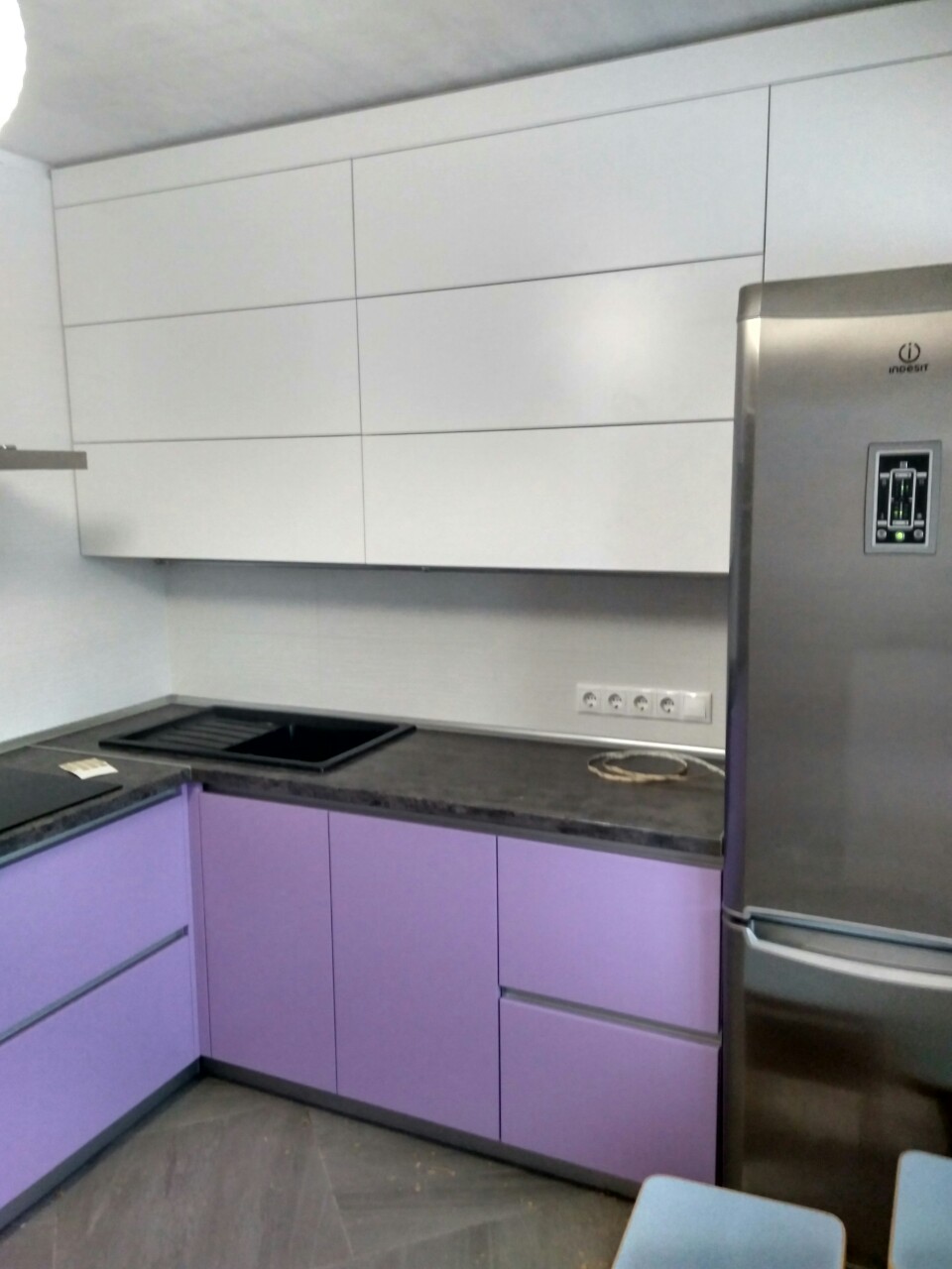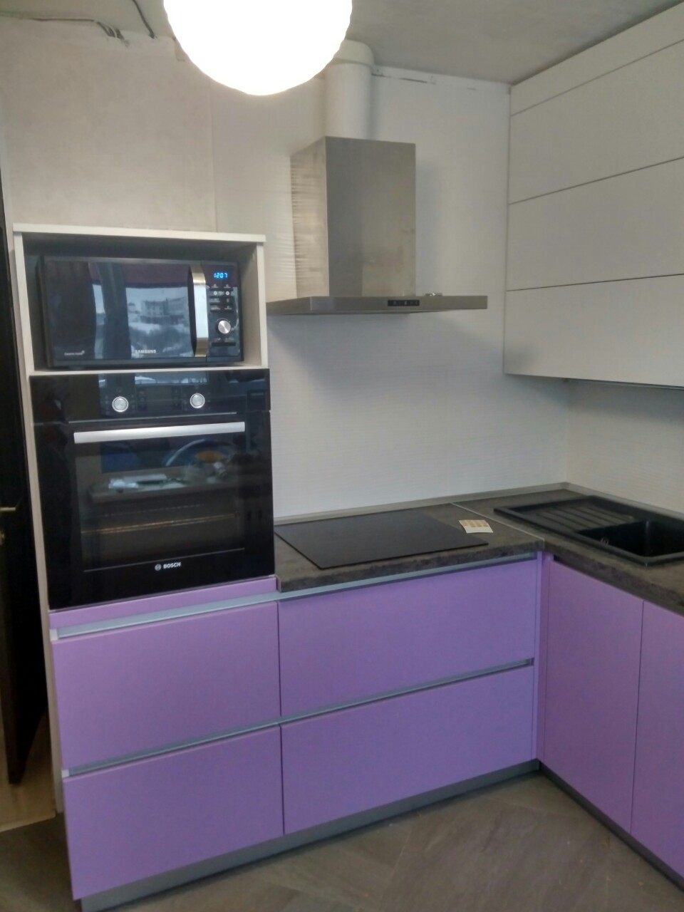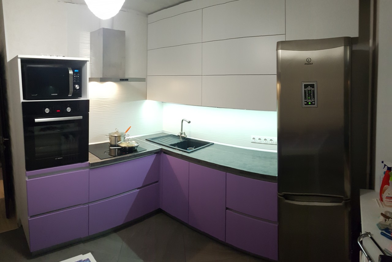 Современная угловая кухня представлена в комбинации белого и фиолетового цвета. Навесные модули оснащаются качественными подъемным механизмом, позволяющим легко и быстро открывать дверцы. В нижних шкафчиках используются современные интегрированные ручки. В гарнитуре предусмотрен модуль для встраиваемой техники: свч-печи и духового шкафа.