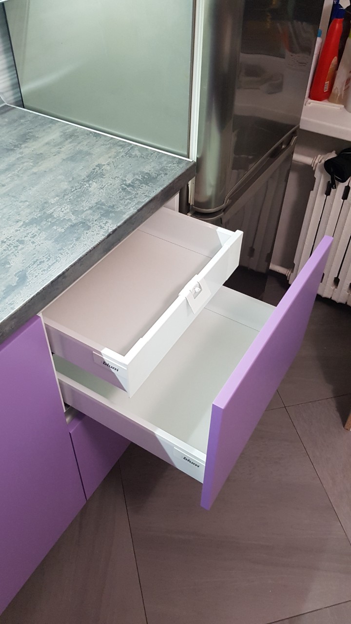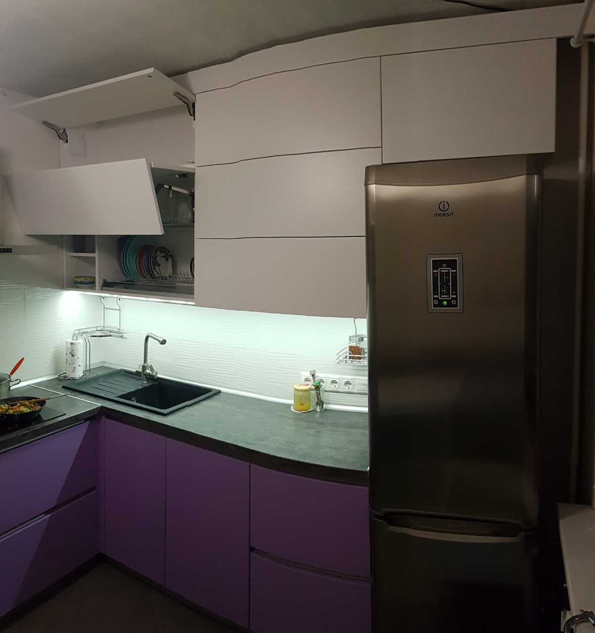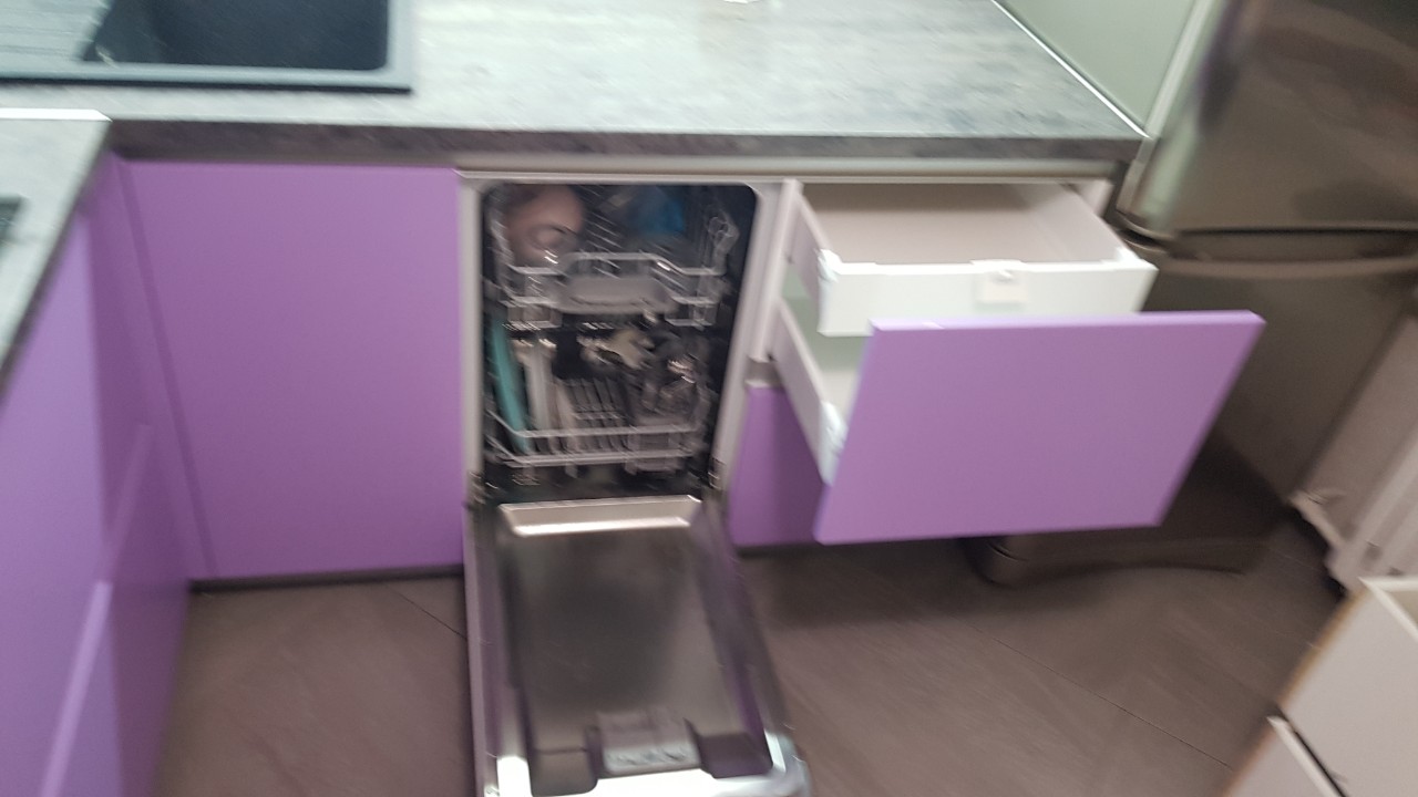 Современная угловая кухня представлена в комбинации белого и фиолетового цвета. Навесные модули оснащаются качественными подъемным механизмом, позволяющим легко и быстро открывать дверцы. В нижних шкафчиках используются современные интегрированные ручки. В гарнитуре предусмотрен модуль для встраиваемой техники: свч-печи и духового шкафа.