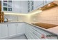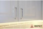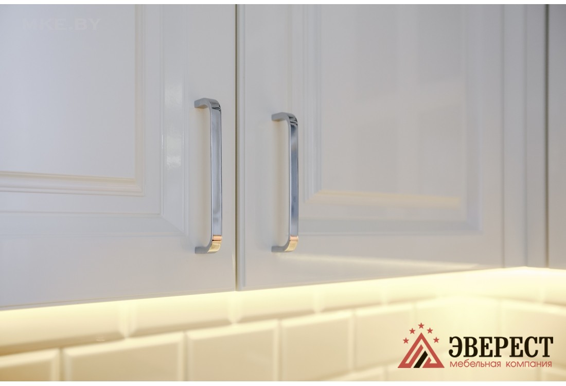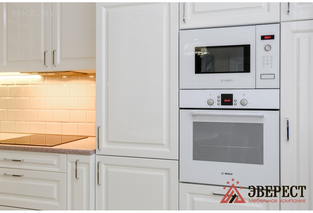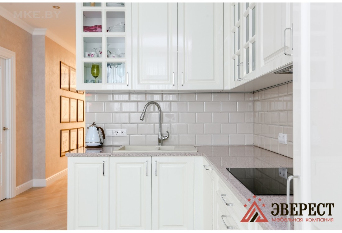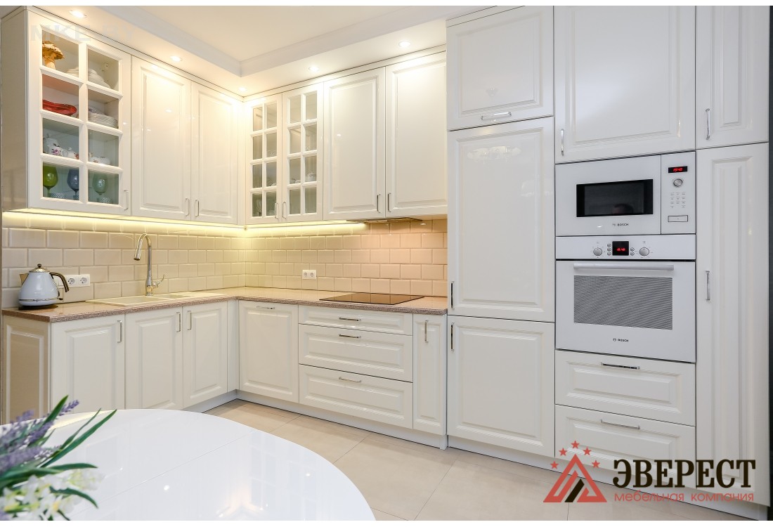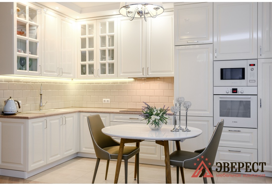 Угловая кухня представлена в классическом стиле. Фасады изготавливаются из крашенного в белом цвете МДФ. В верхних шкафах предусмотрена подсветка теплого цвета. В фасадах с витриной использовалось прозрачное стекло. Выдвижные и распашные механизмы европейского качества от компании Blum. В просторные пеналы встраивается разнообразная кухонная техника. Кухонный гарнитур сверху обрамляется стильным багетом.