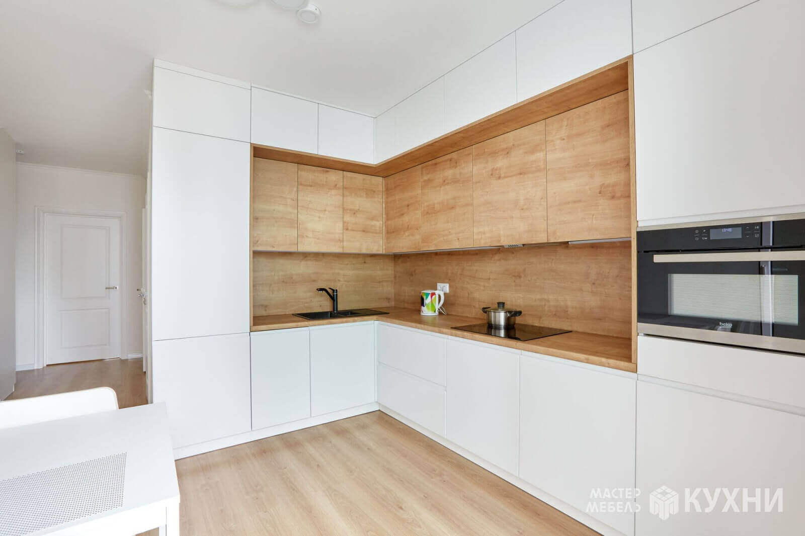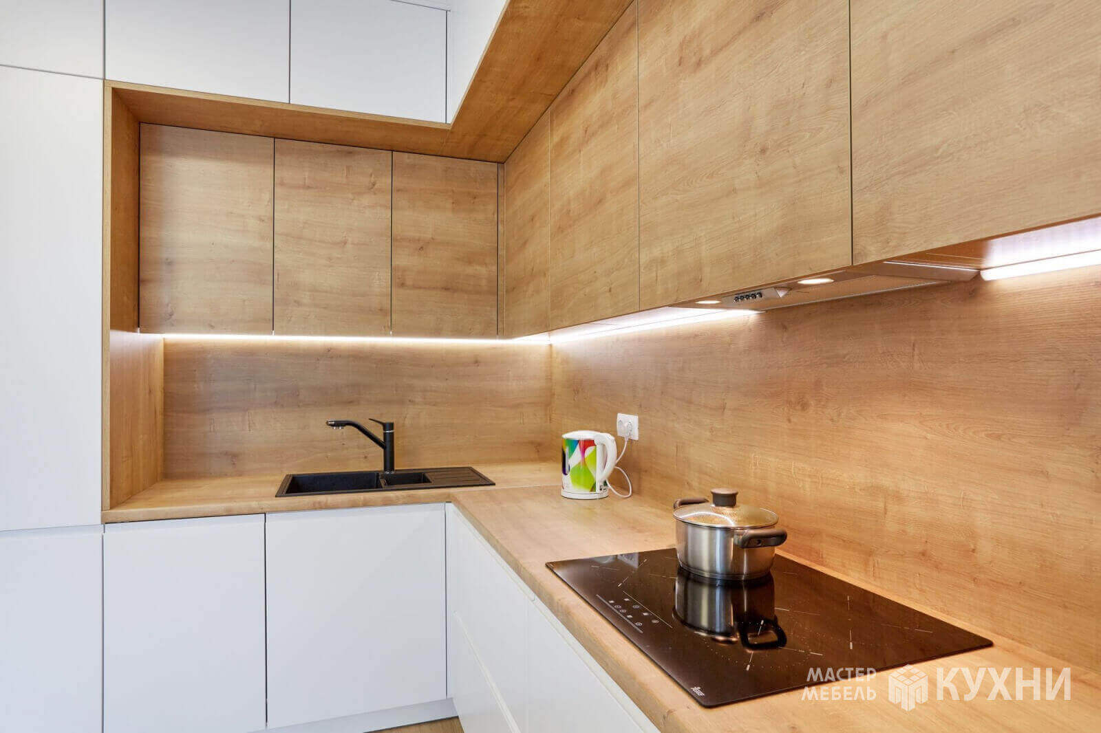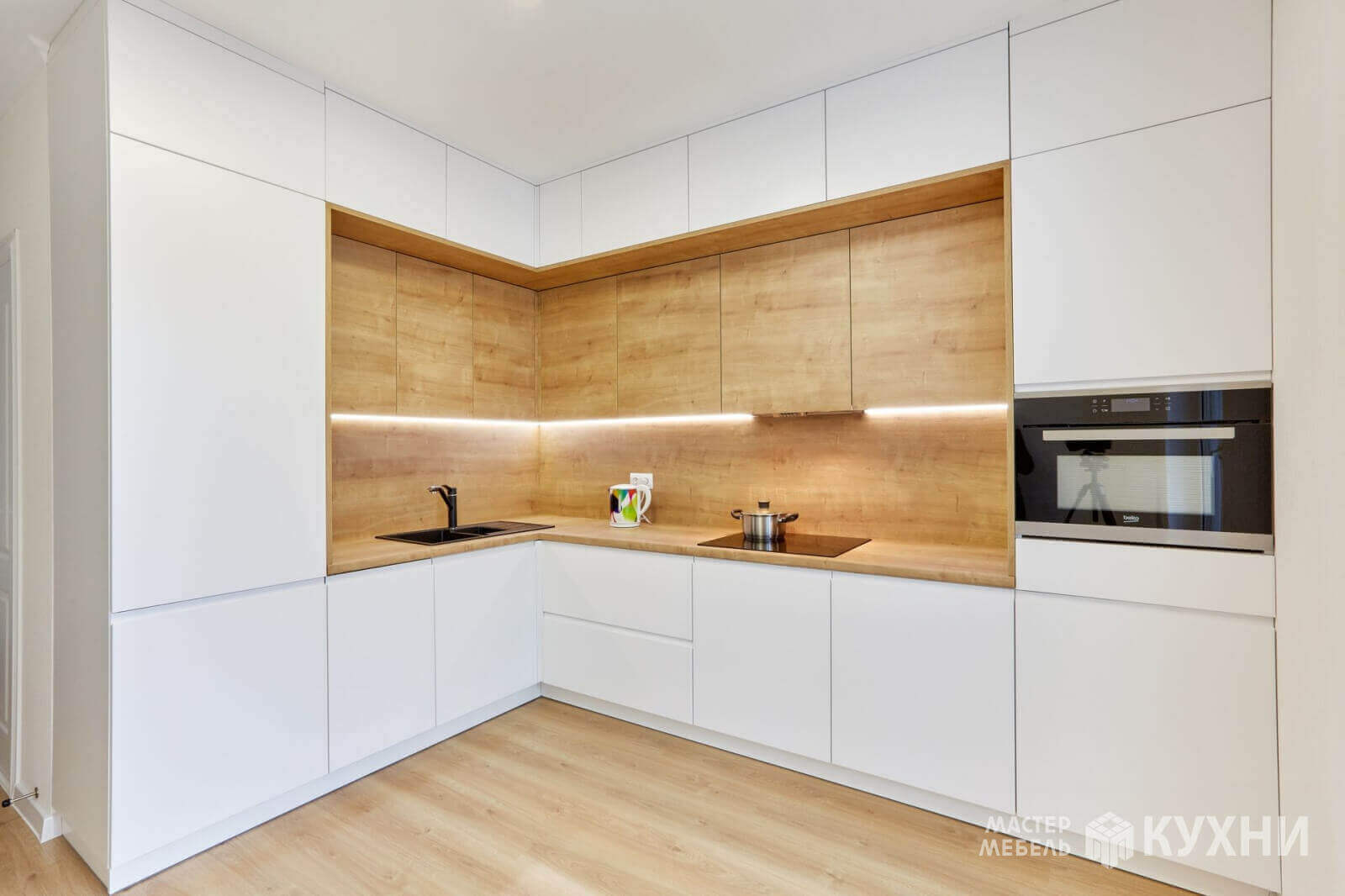 код 101840Встраиваемая угловая конструкция с белыми матовыми фасадами без ручек. Рабочая зона с подсветкой