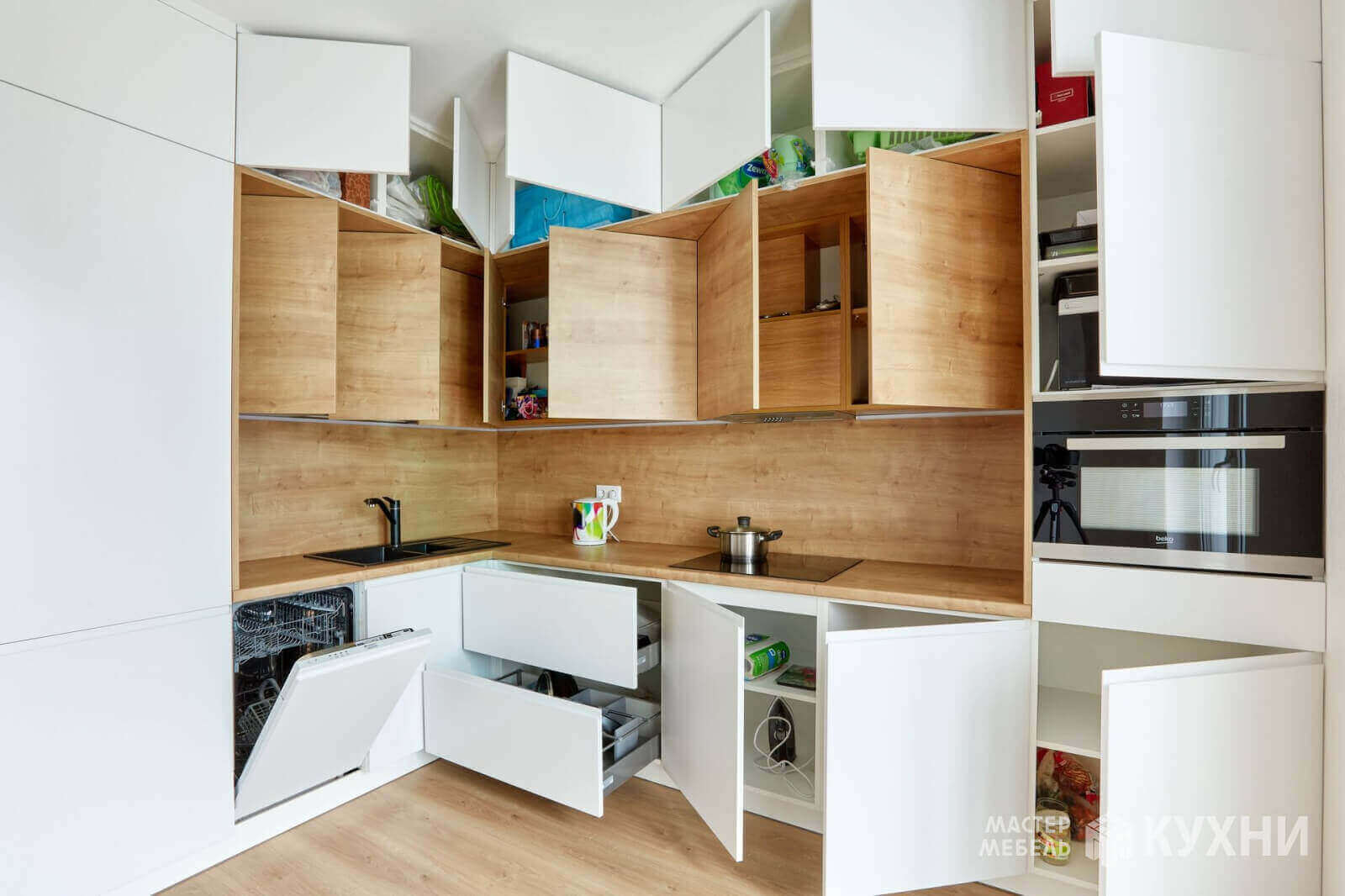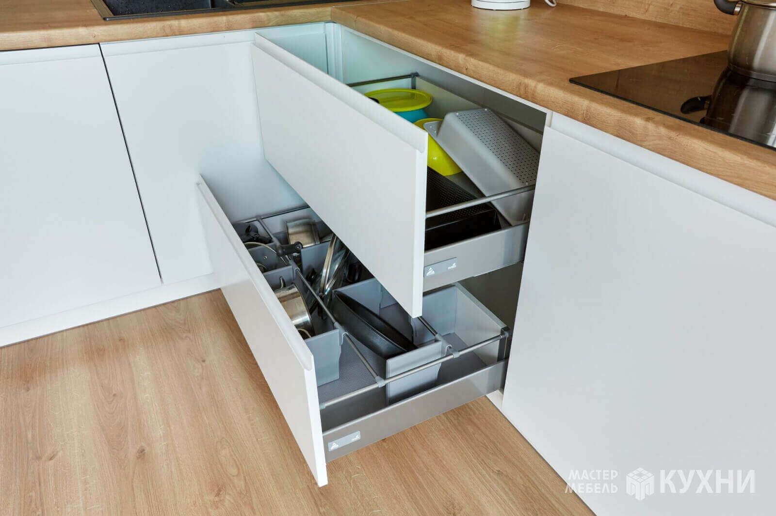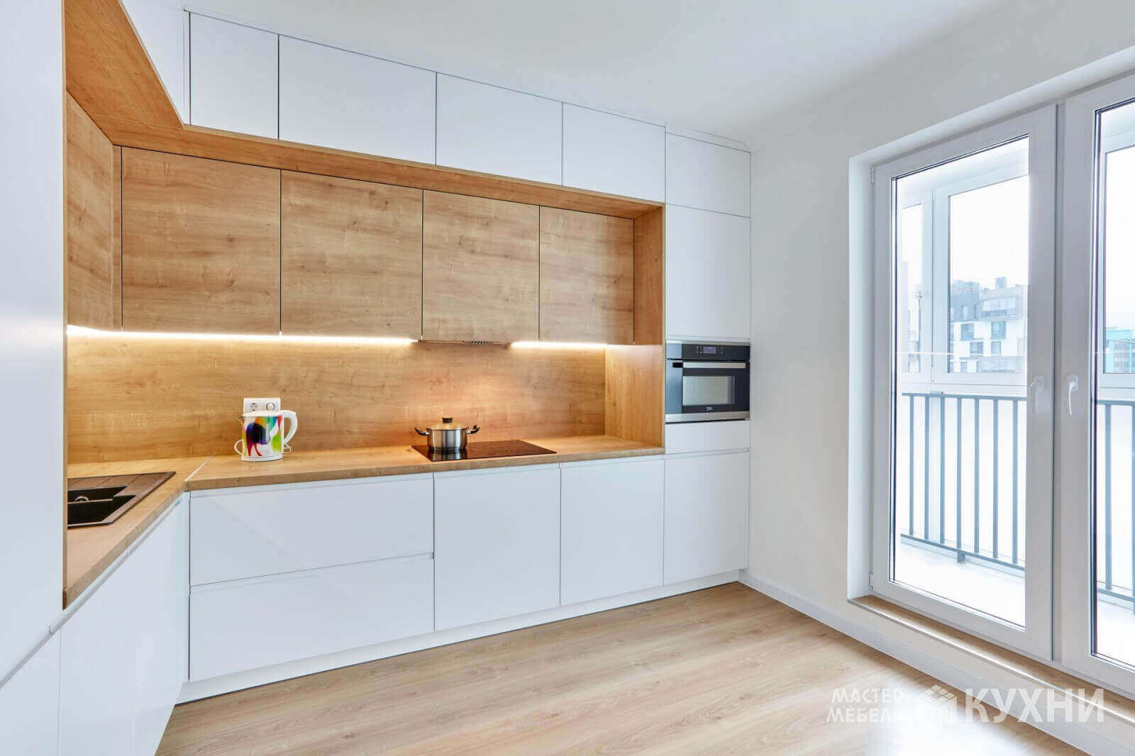 код 101840Встраиваемая угловая конструкция с белыми матовыми фасадами без ручек. Рабочая зона с подсветкой