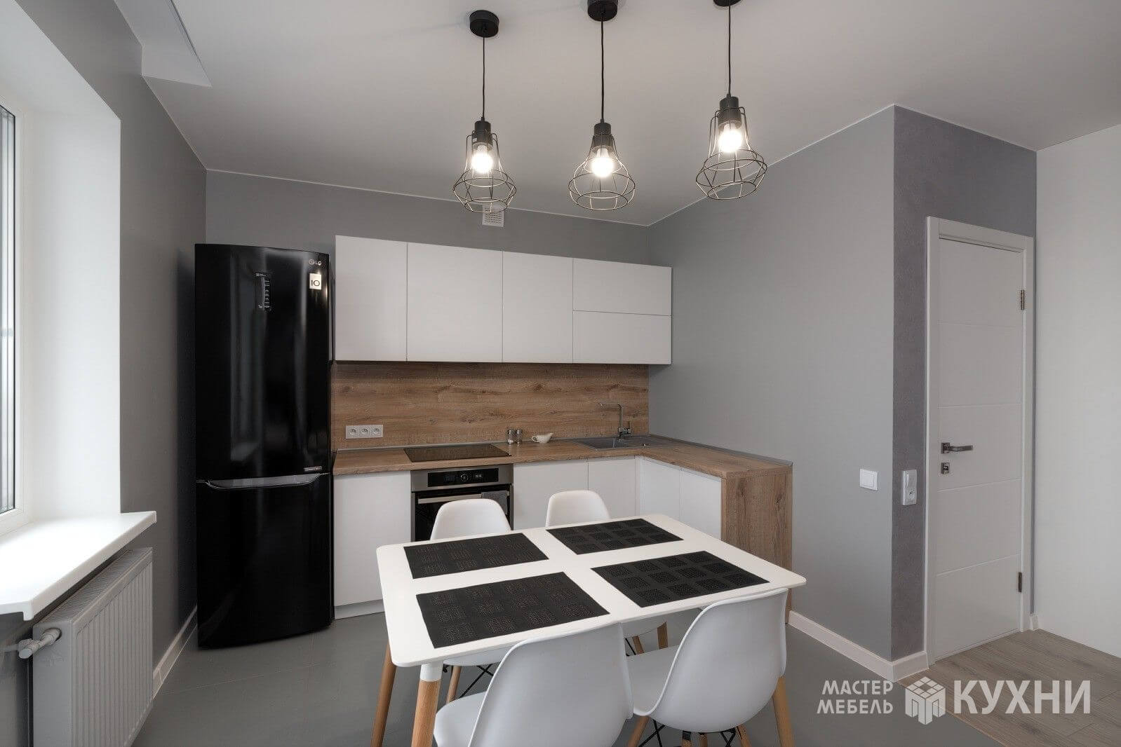 Темные и светлые фасады из пленочной МДФ. Ширина кухни 150 см.