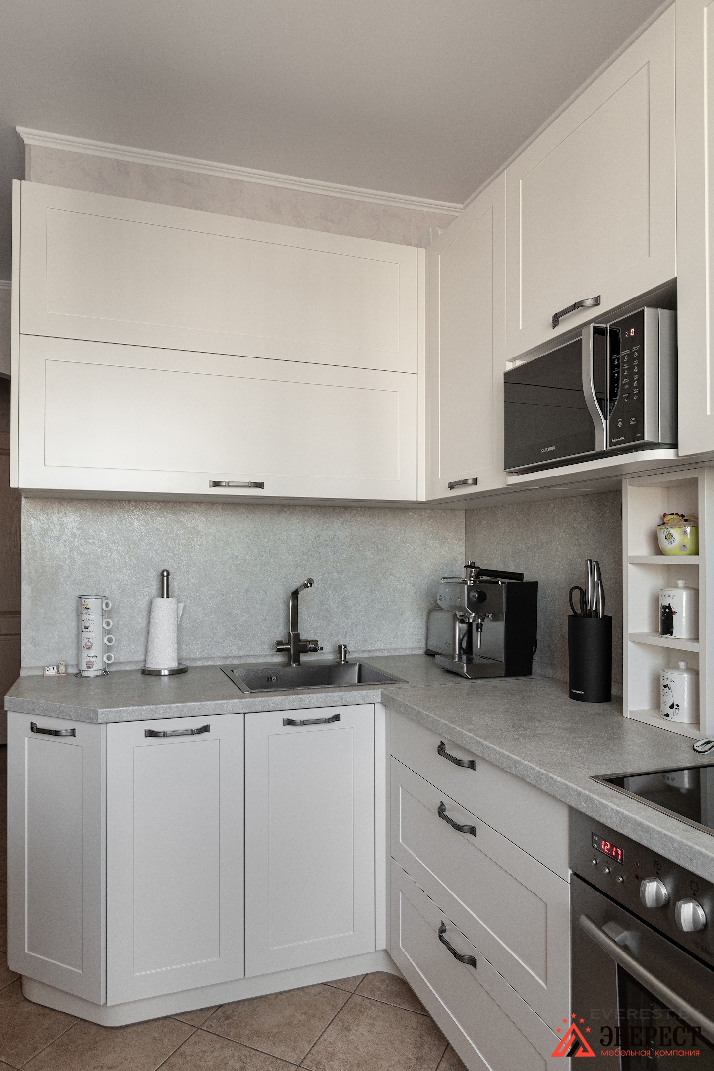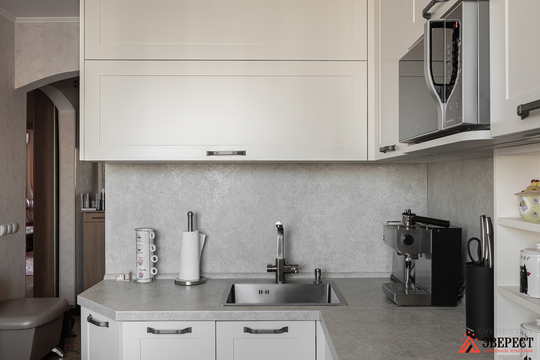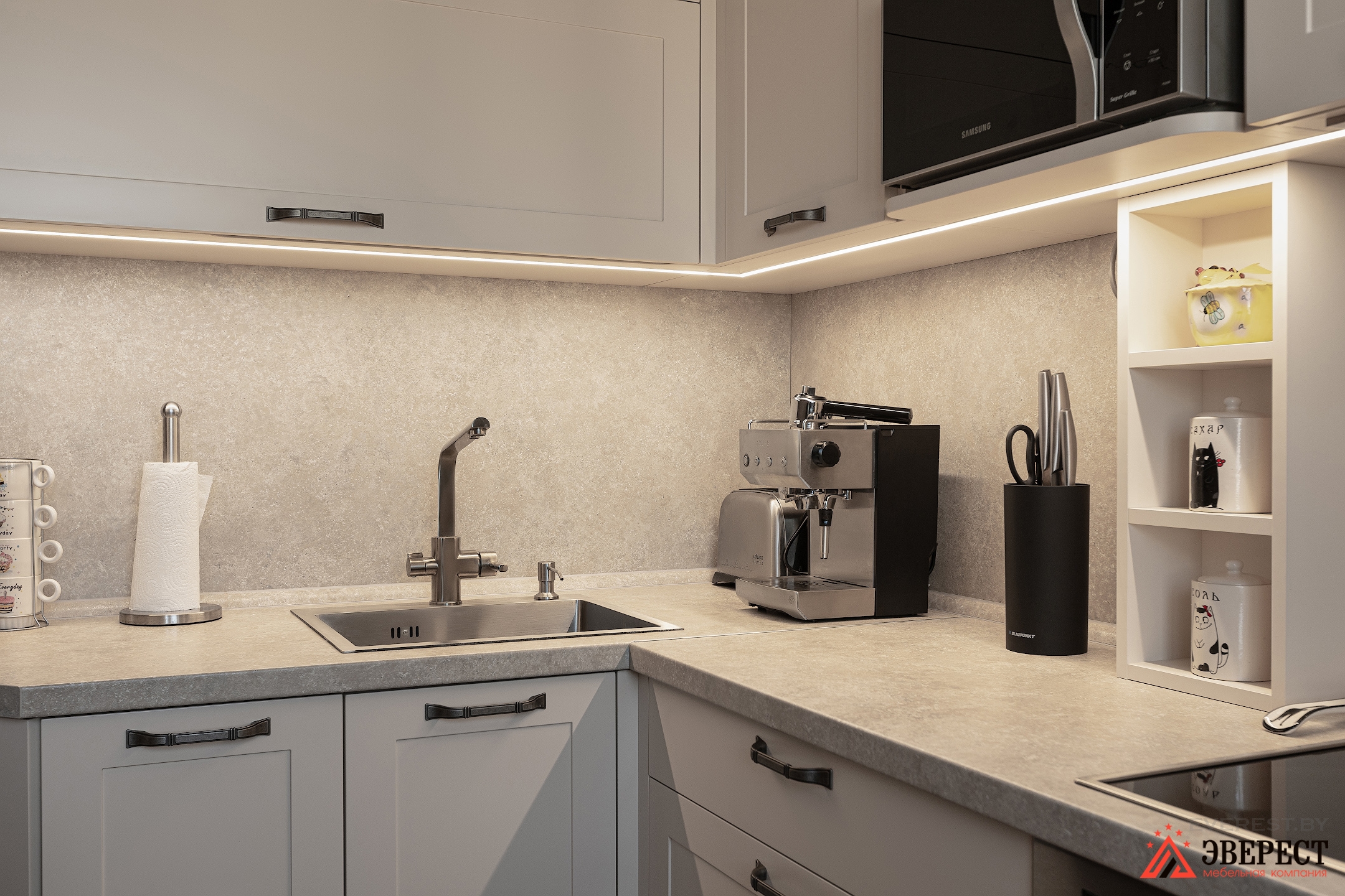 Фасады: МДФ крашеный. Фурнитура: BLUM с доводчиками. Столешница: постформинг. Врезная подсветка.