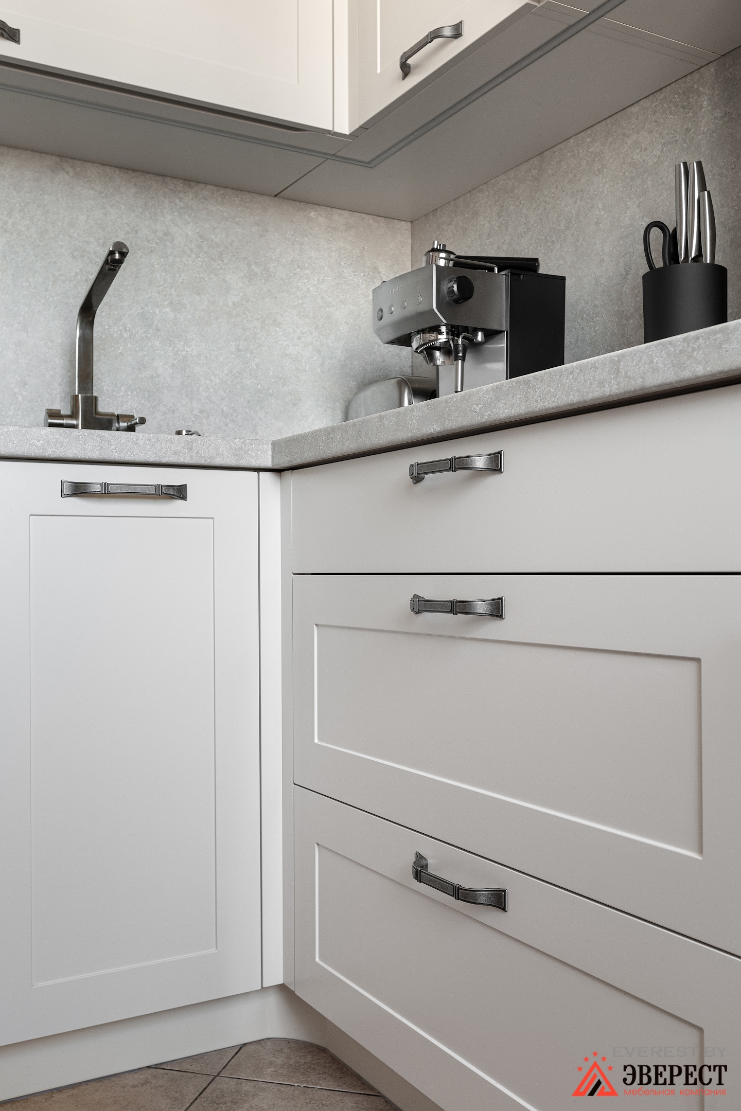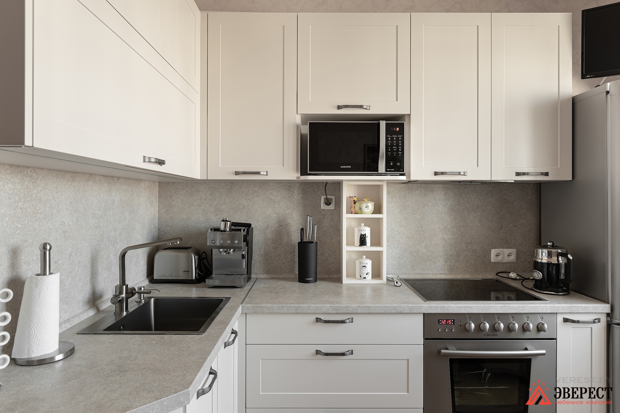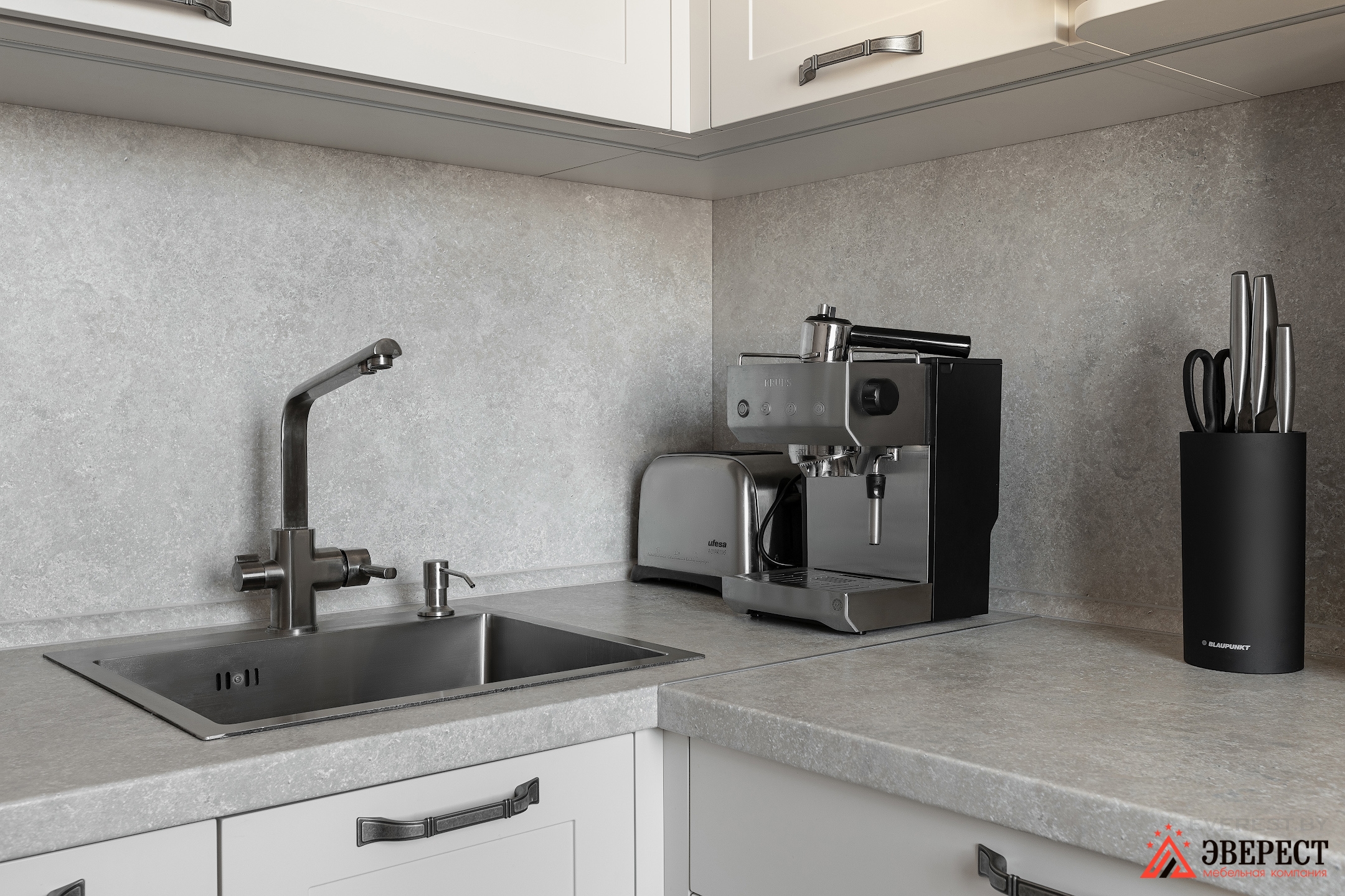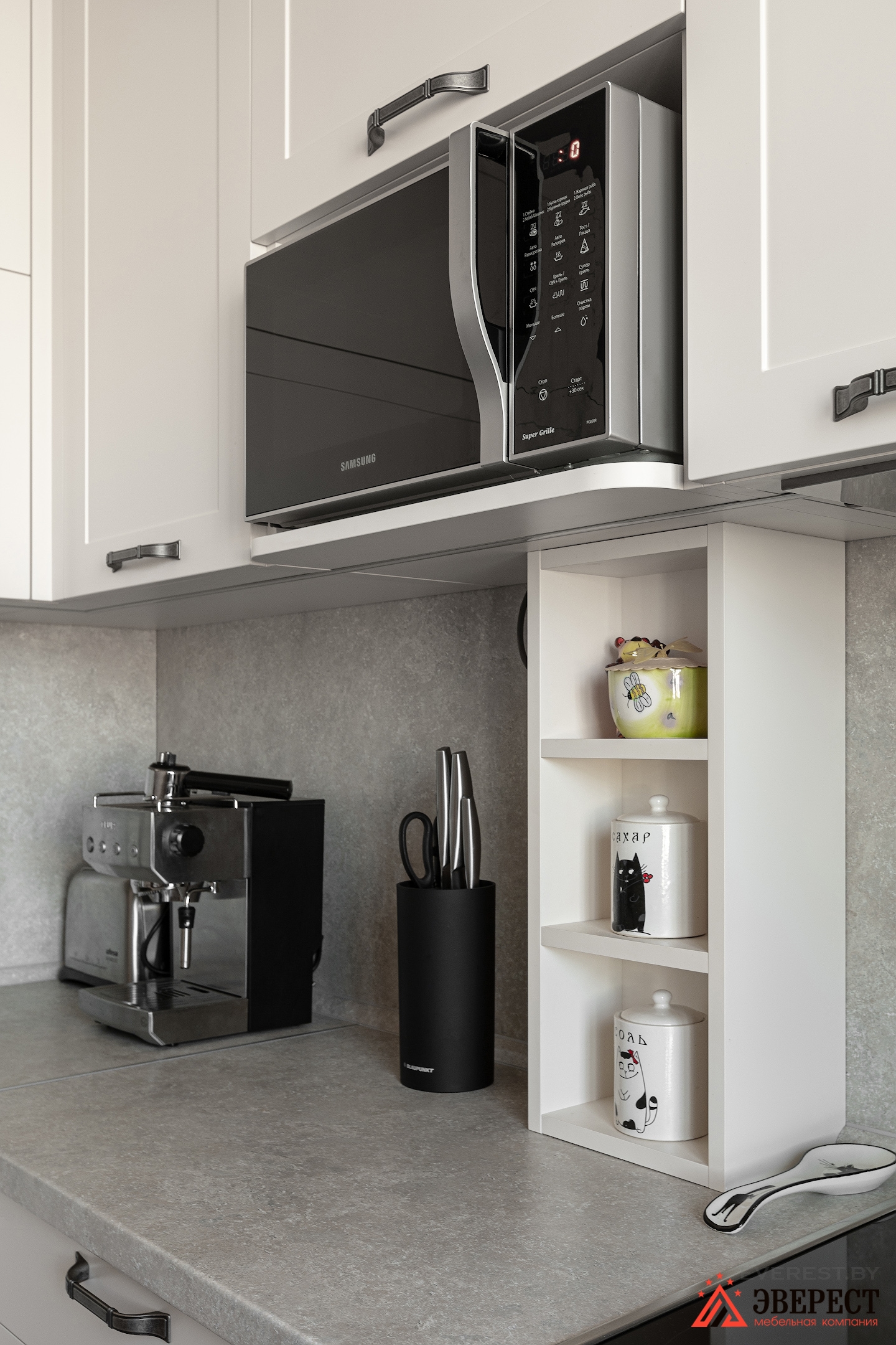 Фасады: МДФ крашеный. Фурнитура: BLUM с доводчиками. Столешница: постформинг. Врезная подсветка.
