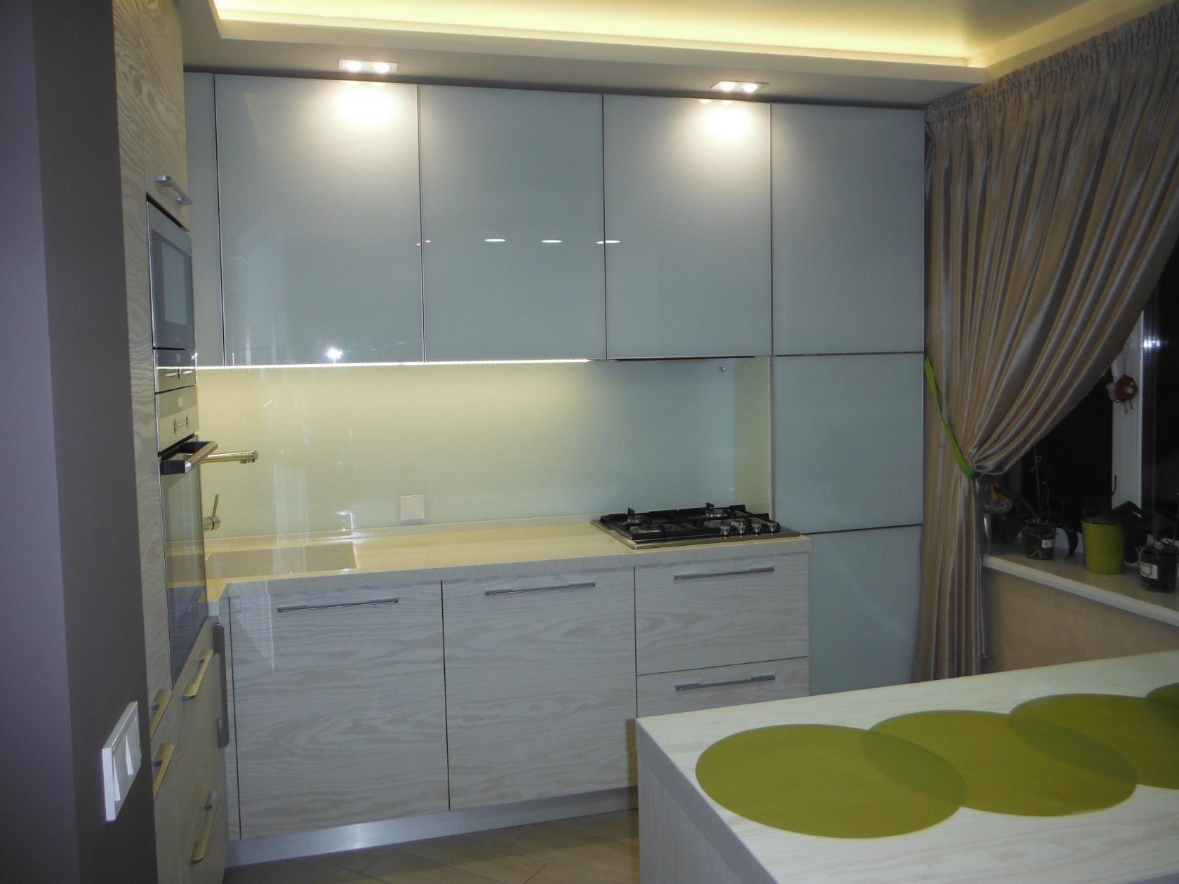 Светлый угловой кухонный гарнитур со шкафом для встроенного холодильника и духовки, кремовой столешницей. Г-образный верхний модуль отделан глянцевым белым лакобелем в металлических рамах без внешних ручек. Наполовину встроенный шкаф и низ в фасаде со светлой древесной фактурой и длинными хромированными ручками. Оборудована ниша для встроенной вытяжки, подсветка рабочей поверхности. Цоколь - серебристый металлик.