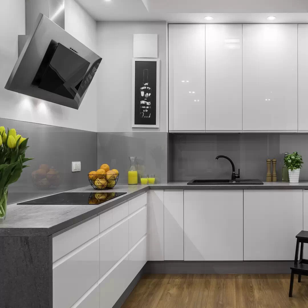 Фасады без ручек. Столешница и фартук в едином стиле. Удобное рабочее пространство.