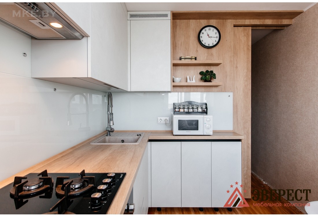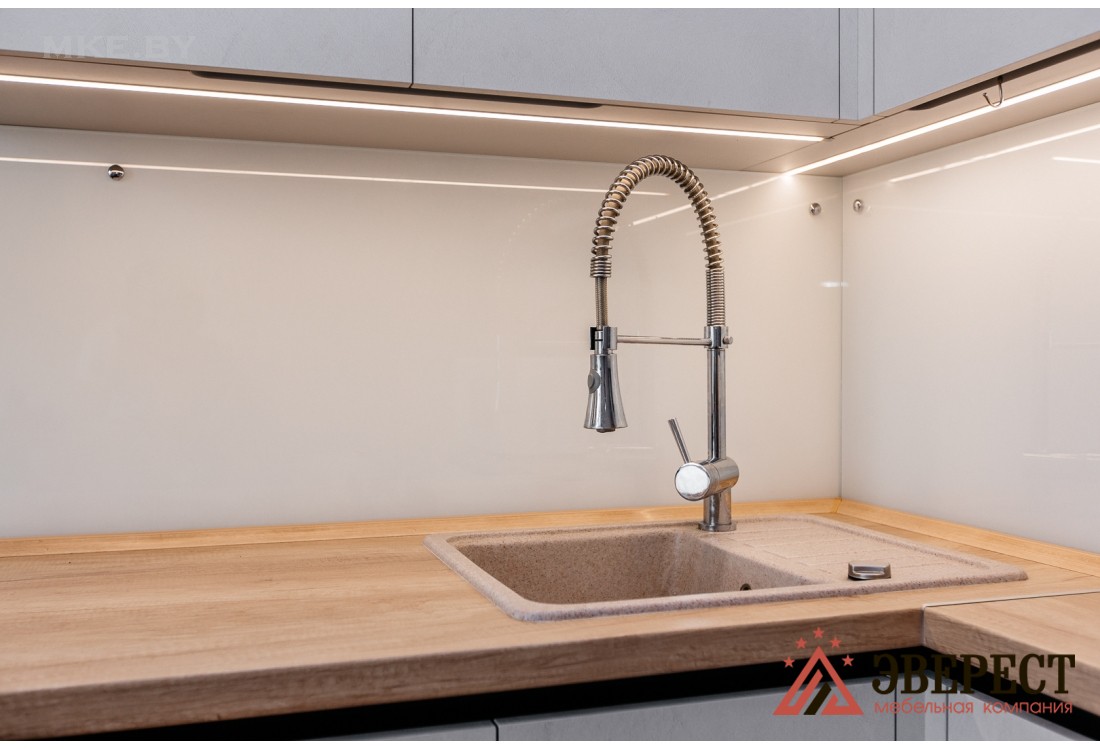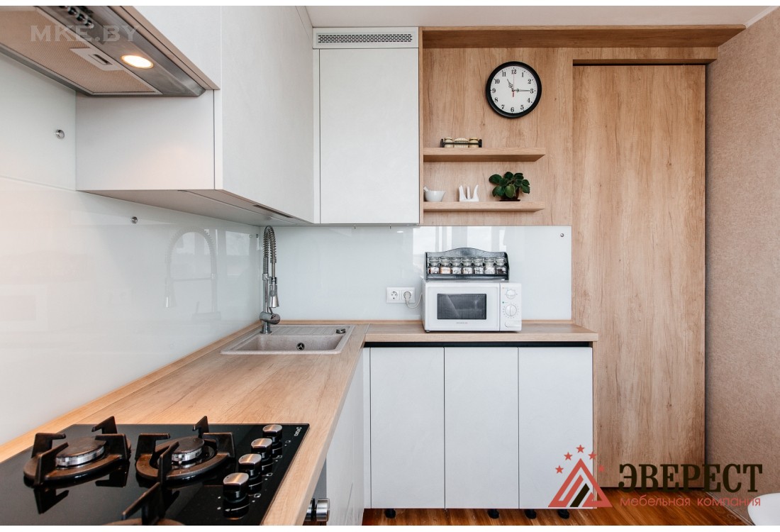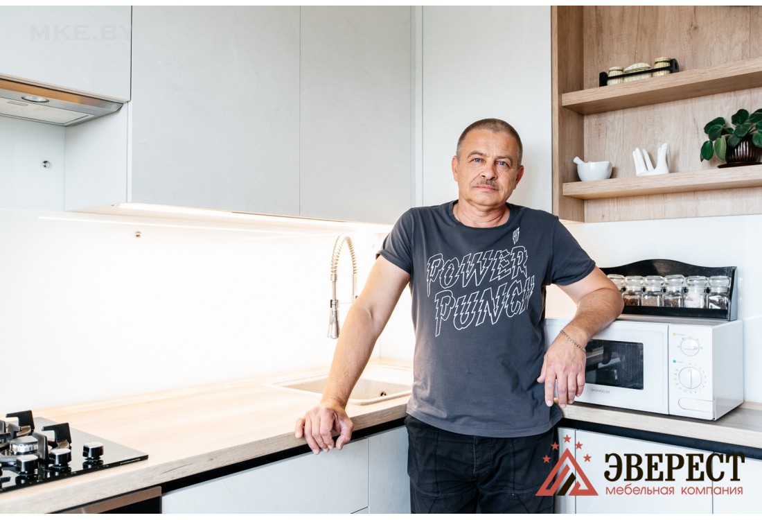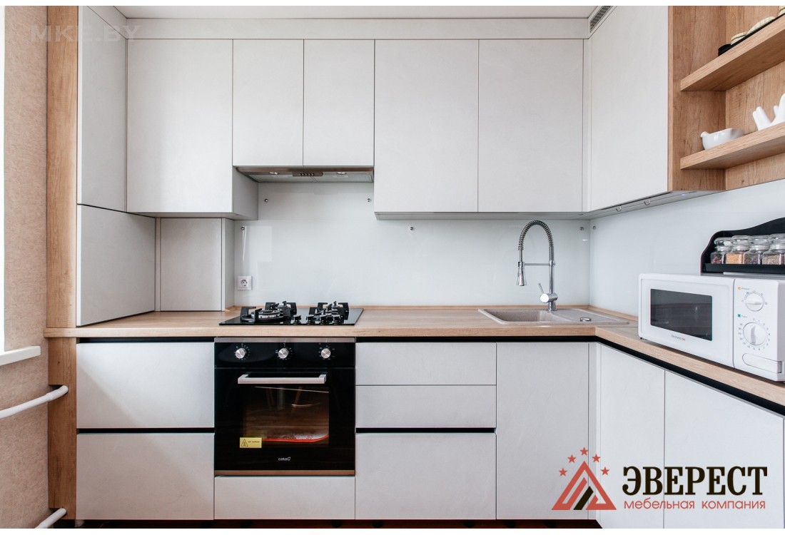 Кухонный гарнитур изготовлен без традиционных ручек, в нижних модулях установлен Gola-профиль черного цвета. Столешница и видимые части корпуса произведены из ДСП Egger в цвете дуб небраска натуральный. Скинали из закаленного стекла идеально вписывается в общую концепцию кухни. Белый цвет кухни зрительно увеличивает пространство помещения. Установлены петли, выдвижные ящики с доводчиками от компании GTV.