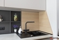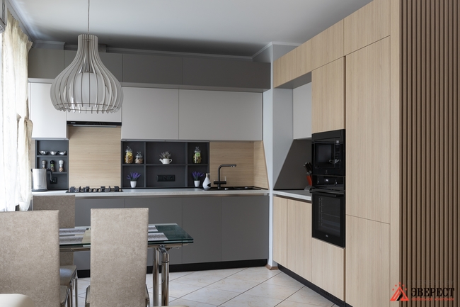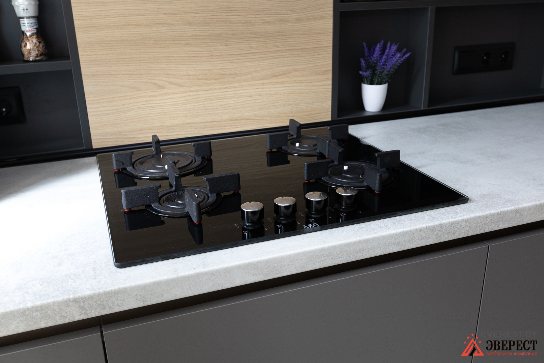 код 111119Материал: Акрил, ЛДСП EGGER, FENIX NTM. Имеется подсветка и открытые полки для кухонной утвари.