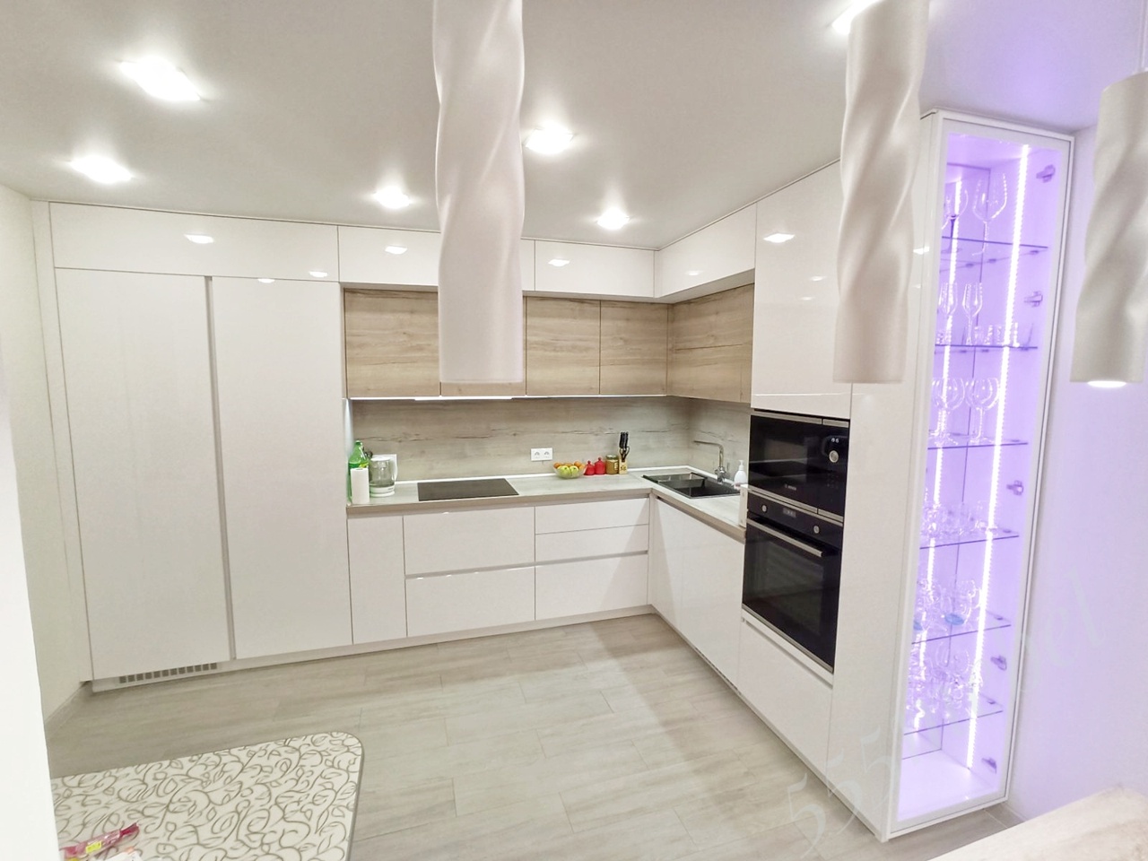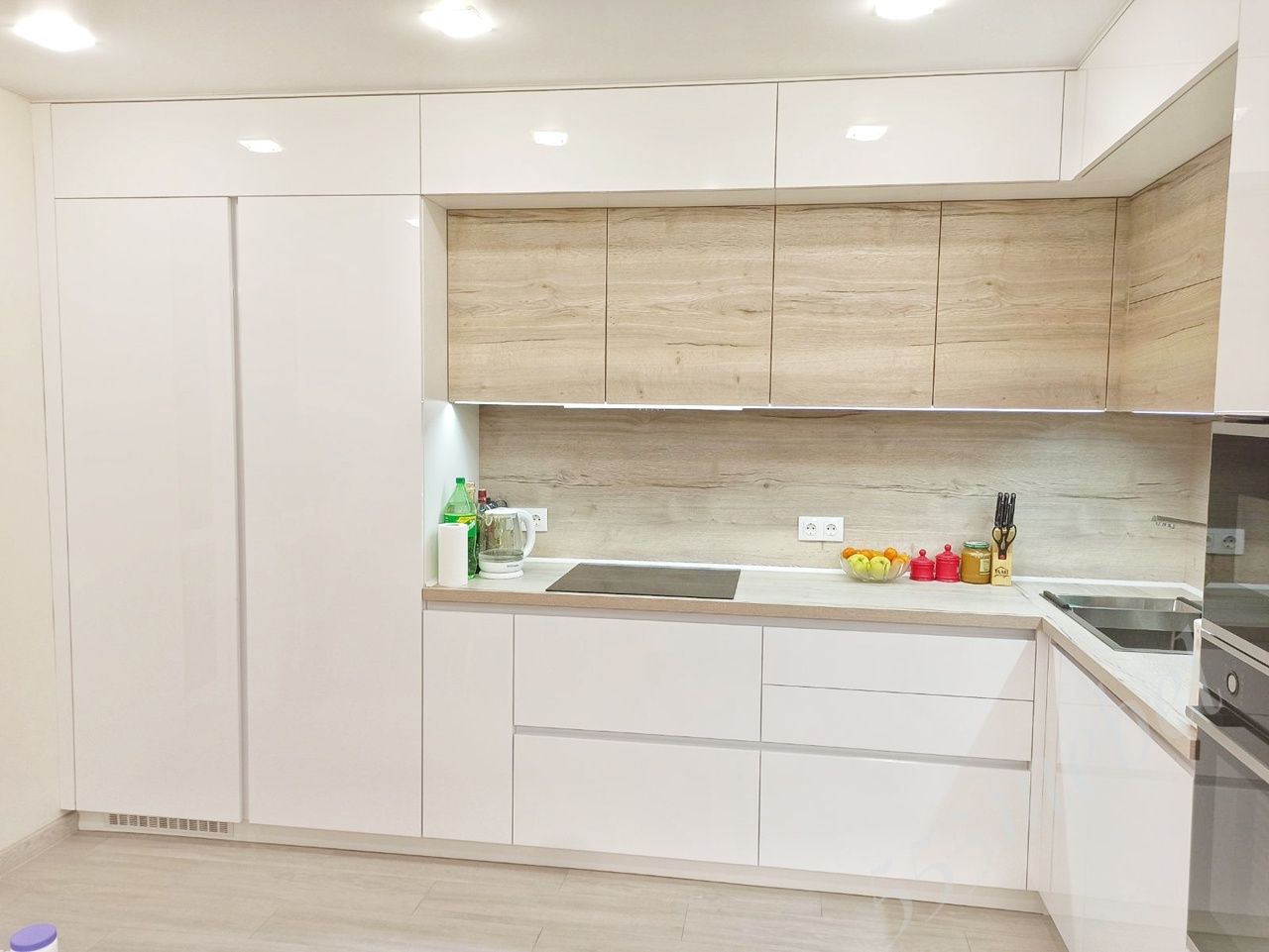 Угловая кухня до потолка с белыми глянцевыми фасадами