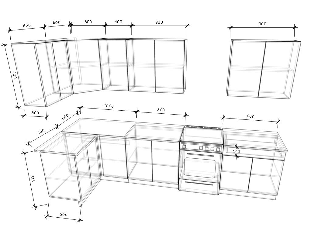 Материал фасада и корпуса: ЛДСП 16 мм. Ширина кухни 180 см.
