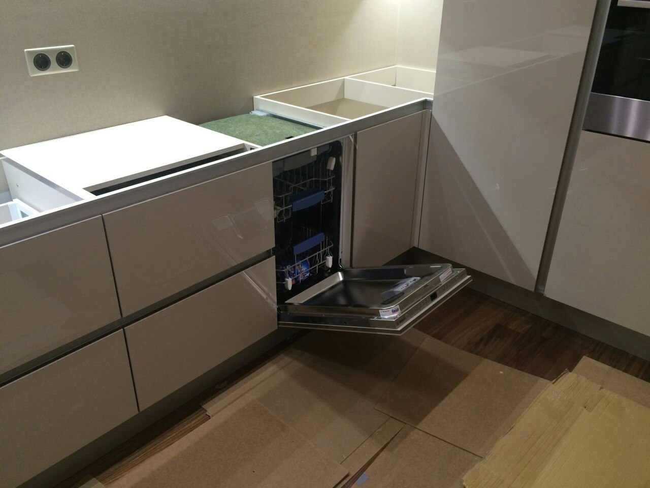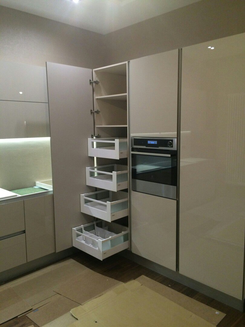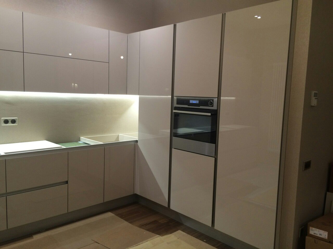 Минималистичная белая глянцевая кухня без ручек. Современная и функциональная фурнитура.