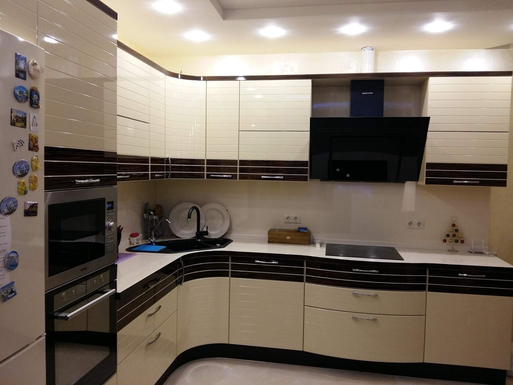 Угловая кухня «Хайтек» с радиусным фасадом станет отличным акцентом дизайна комнаты средней либо большой по размерам. Фасады выполнены в молочном цвете в сочетании с черными элементами. Поверхность украшена линейным декором и глянцем.