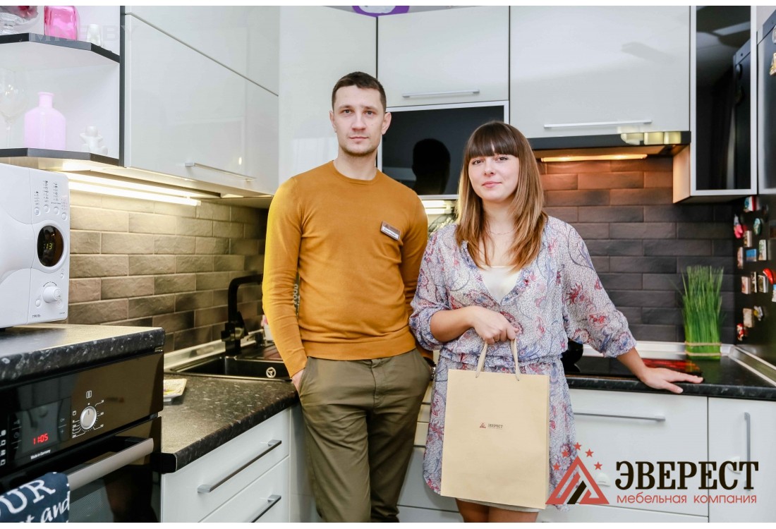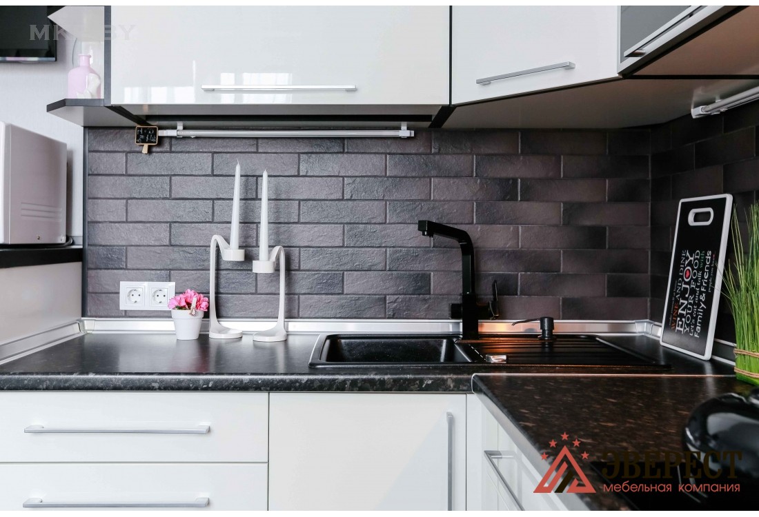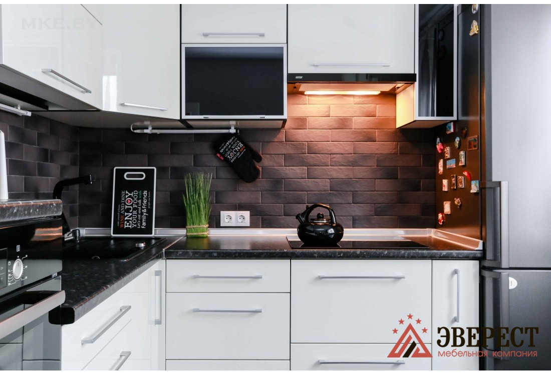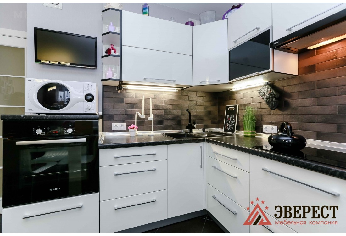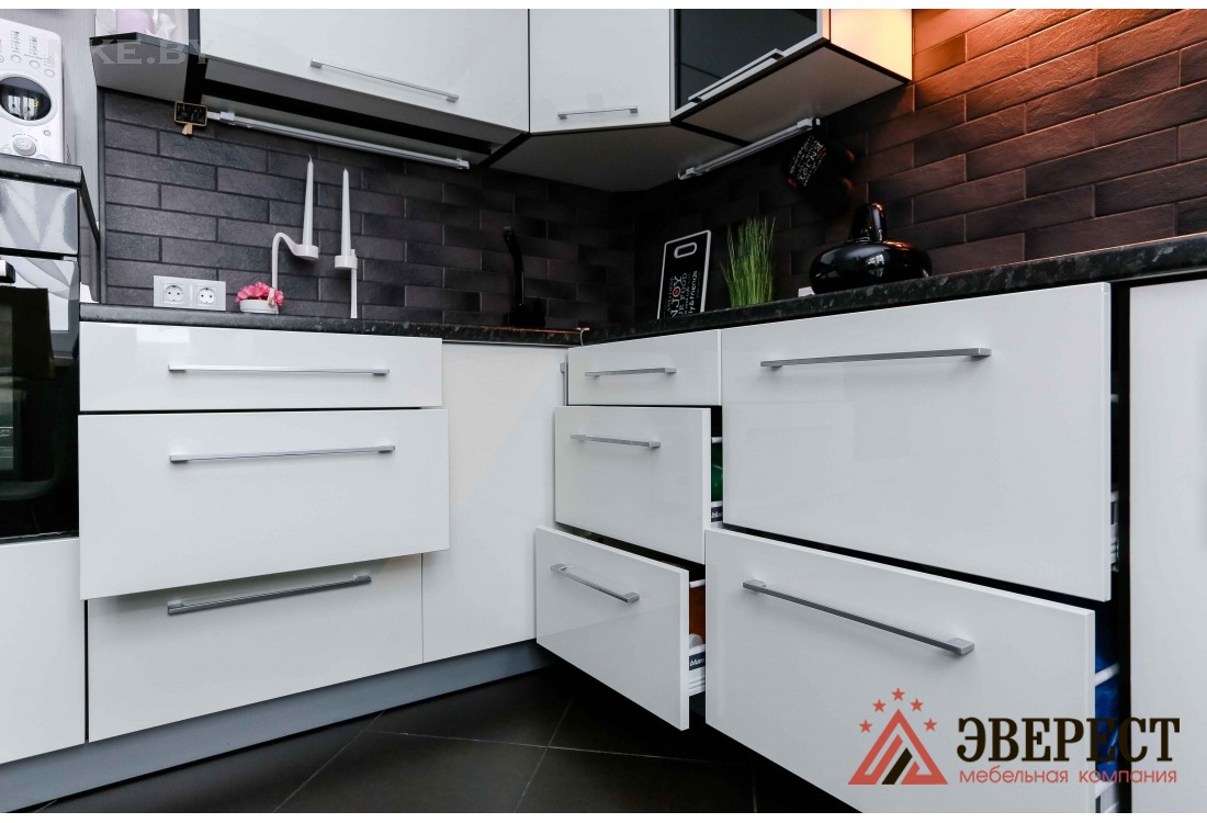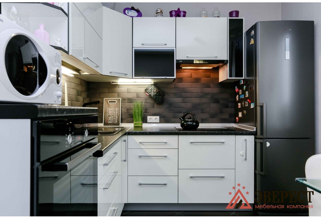 Белая кухня с черной столешницей. Фасады кухни изготовлены из глянцевого МДФ и алюминиевых Z - профилей со стеклом. Кухни из крашенного МДФ имеют равномерную гладкую поверхность, устойчивы к влаге и не впитывают запахи. Глянцевая кухня оснащена подсветкой рабочей зоны. Благодаря установленной качественной европейской фурнитуре открытие/закрытие шкафов осуществляется гладко и бесшумно. Встроенная кухня оснащена небольшим пеналом для встроенного духового шкафа.