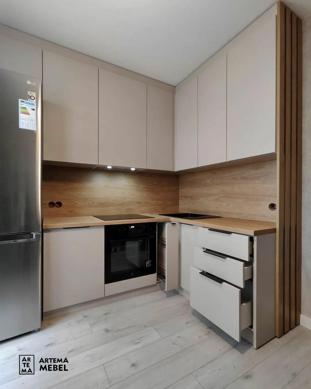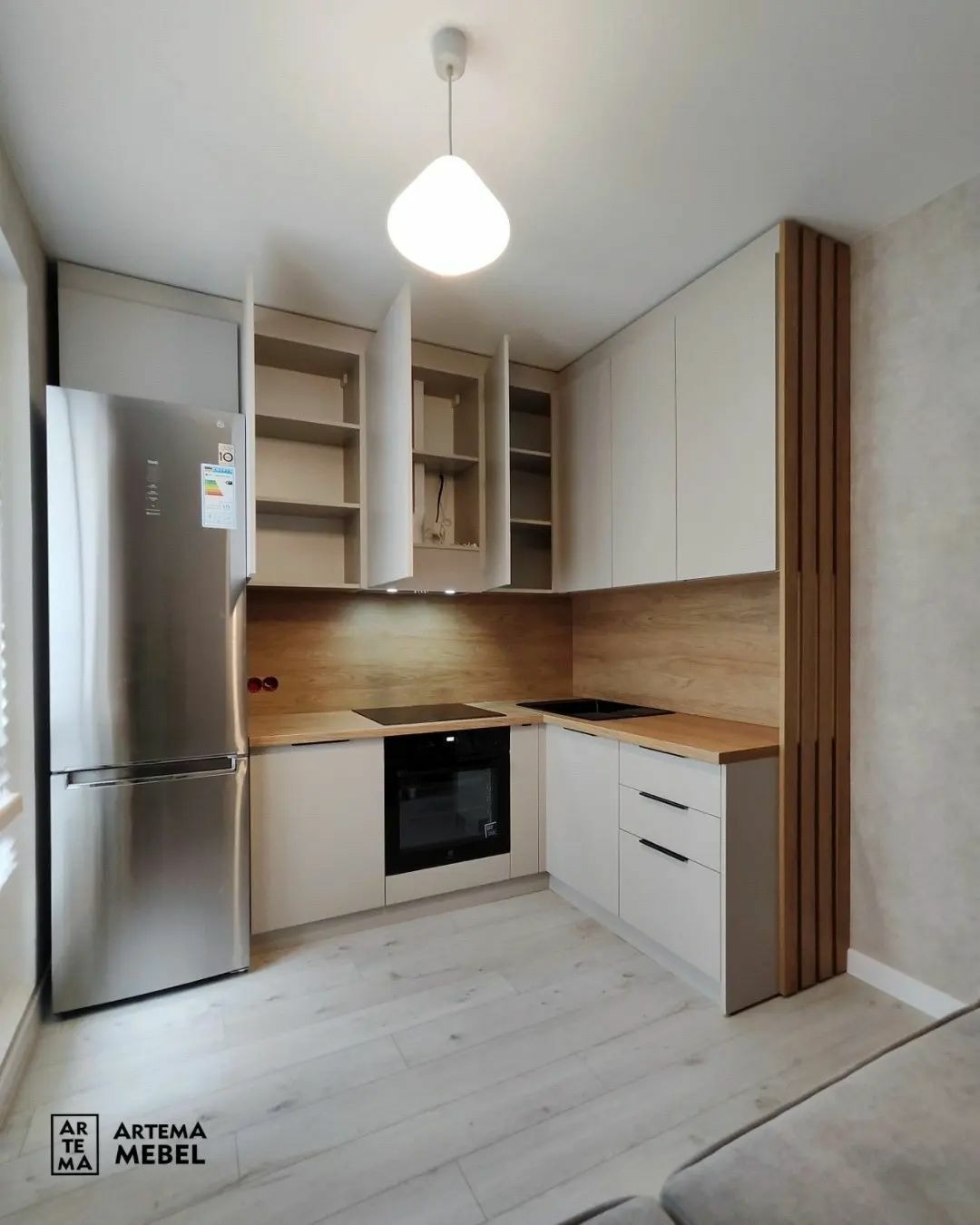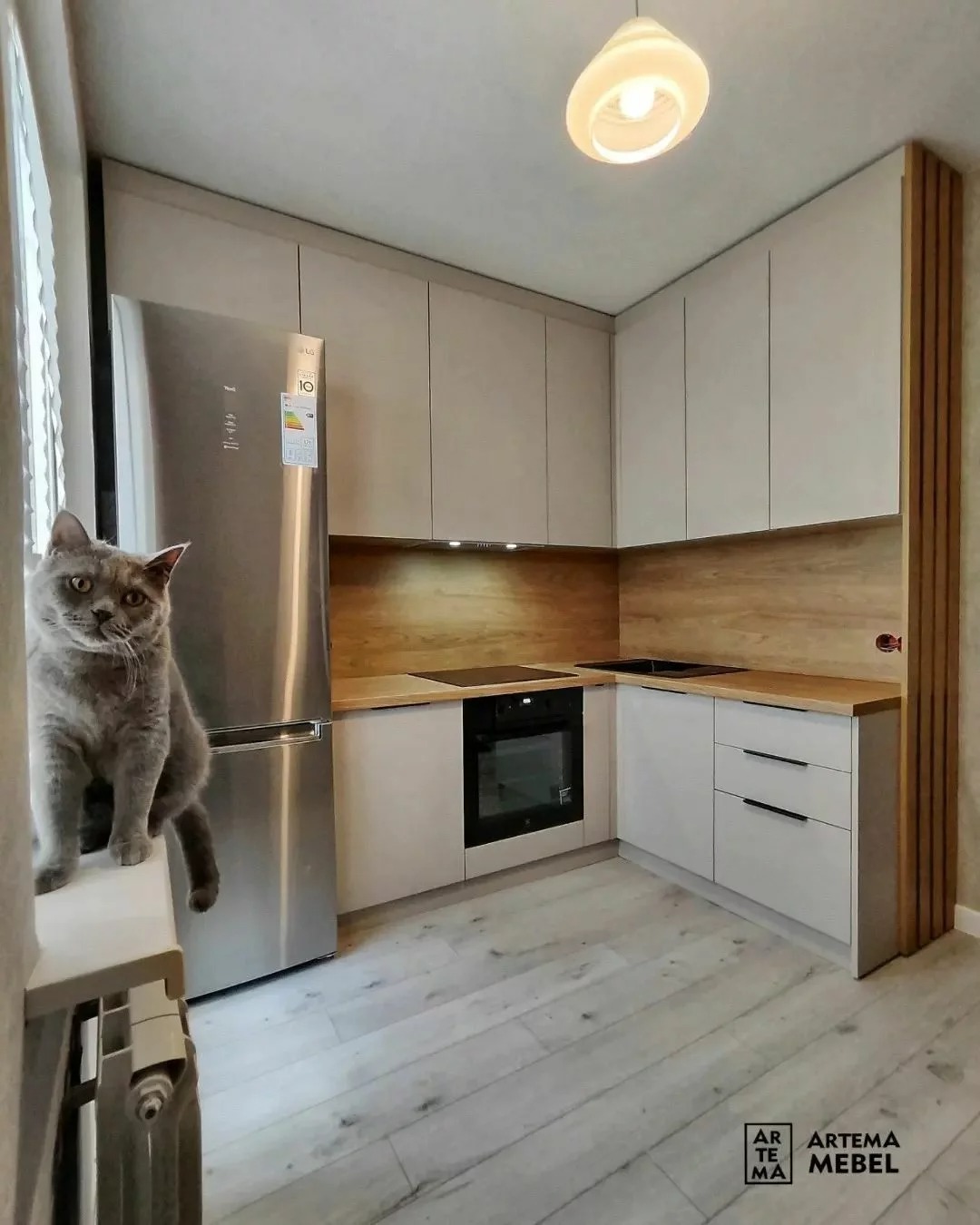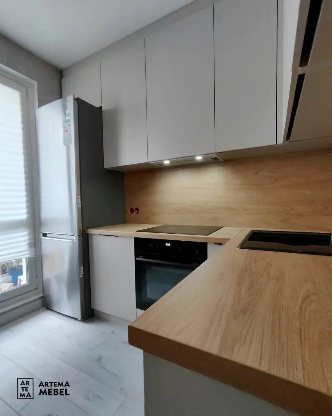 Комбинированные фасады из МДФ. Ширина кухни 150 см.