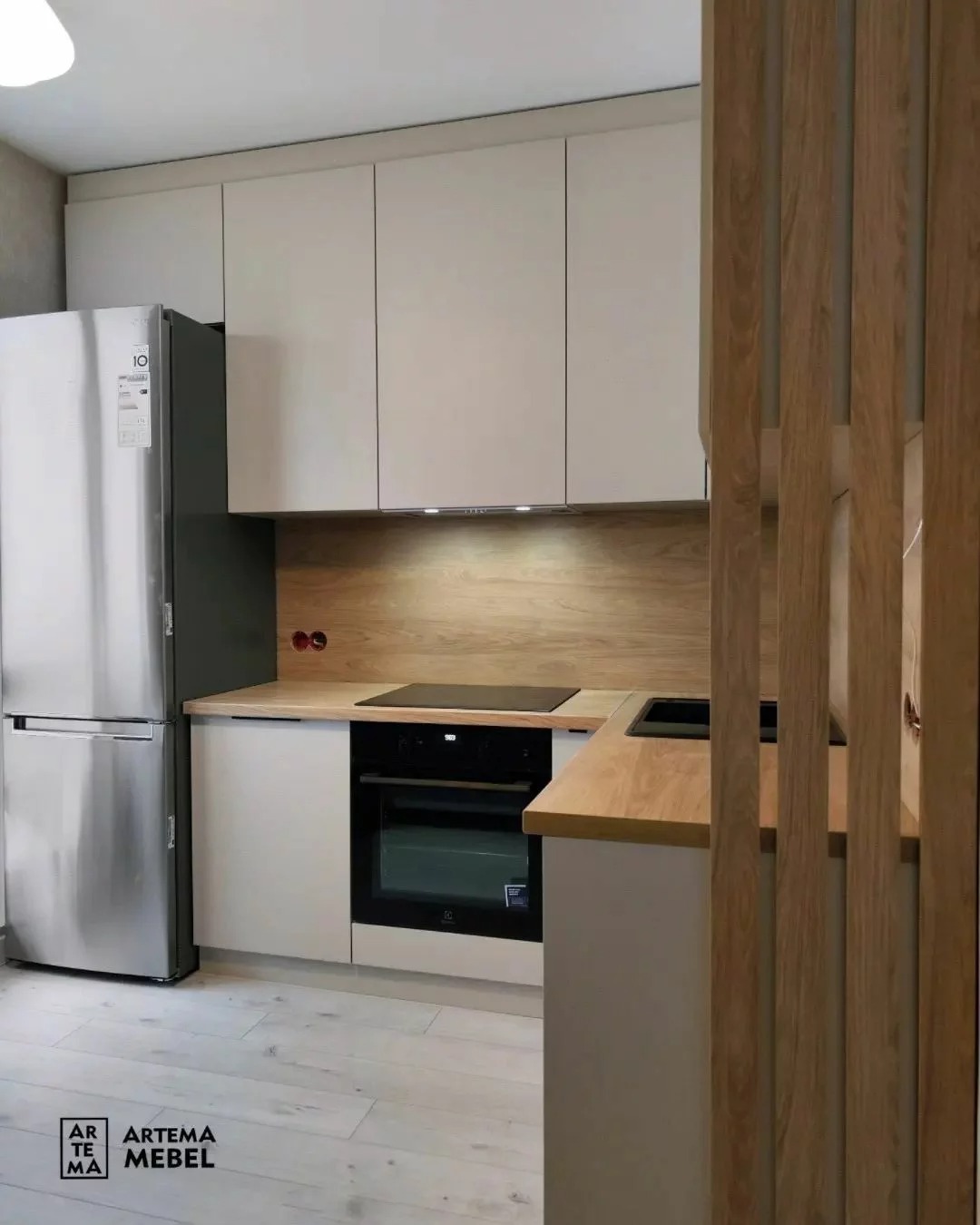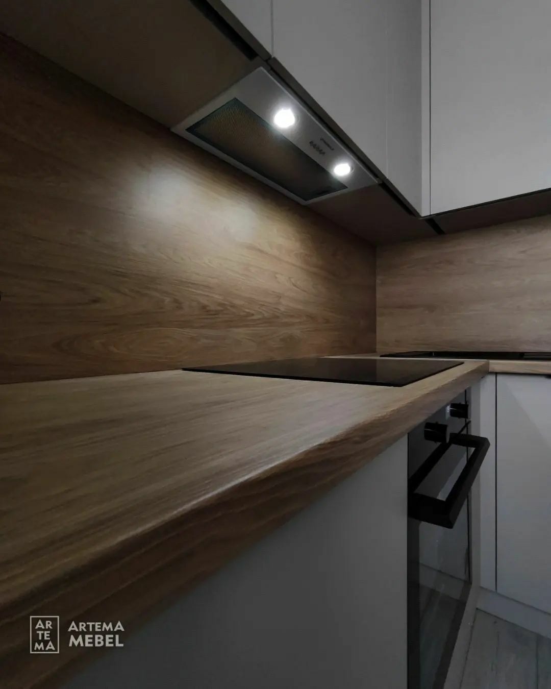 Кухня длиной 180 см. Стильное сочетание цветов фасада.