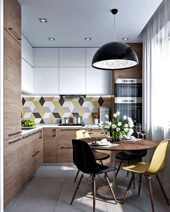Угловая кухня с модульными шкафами. Комбинированные цвета.