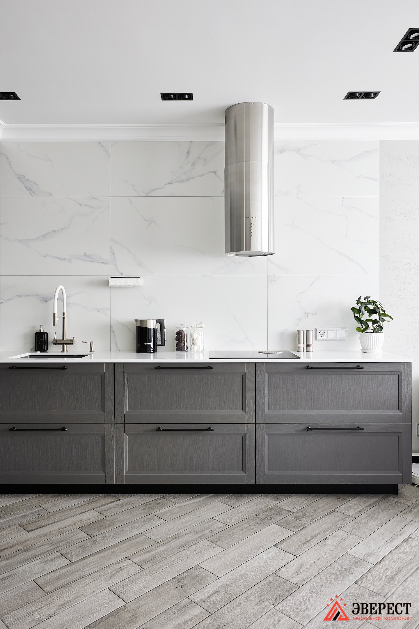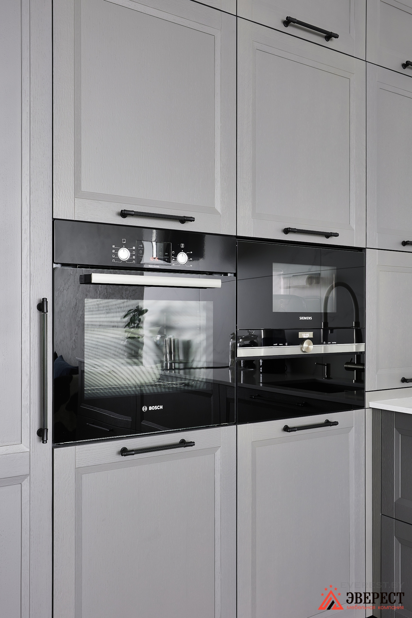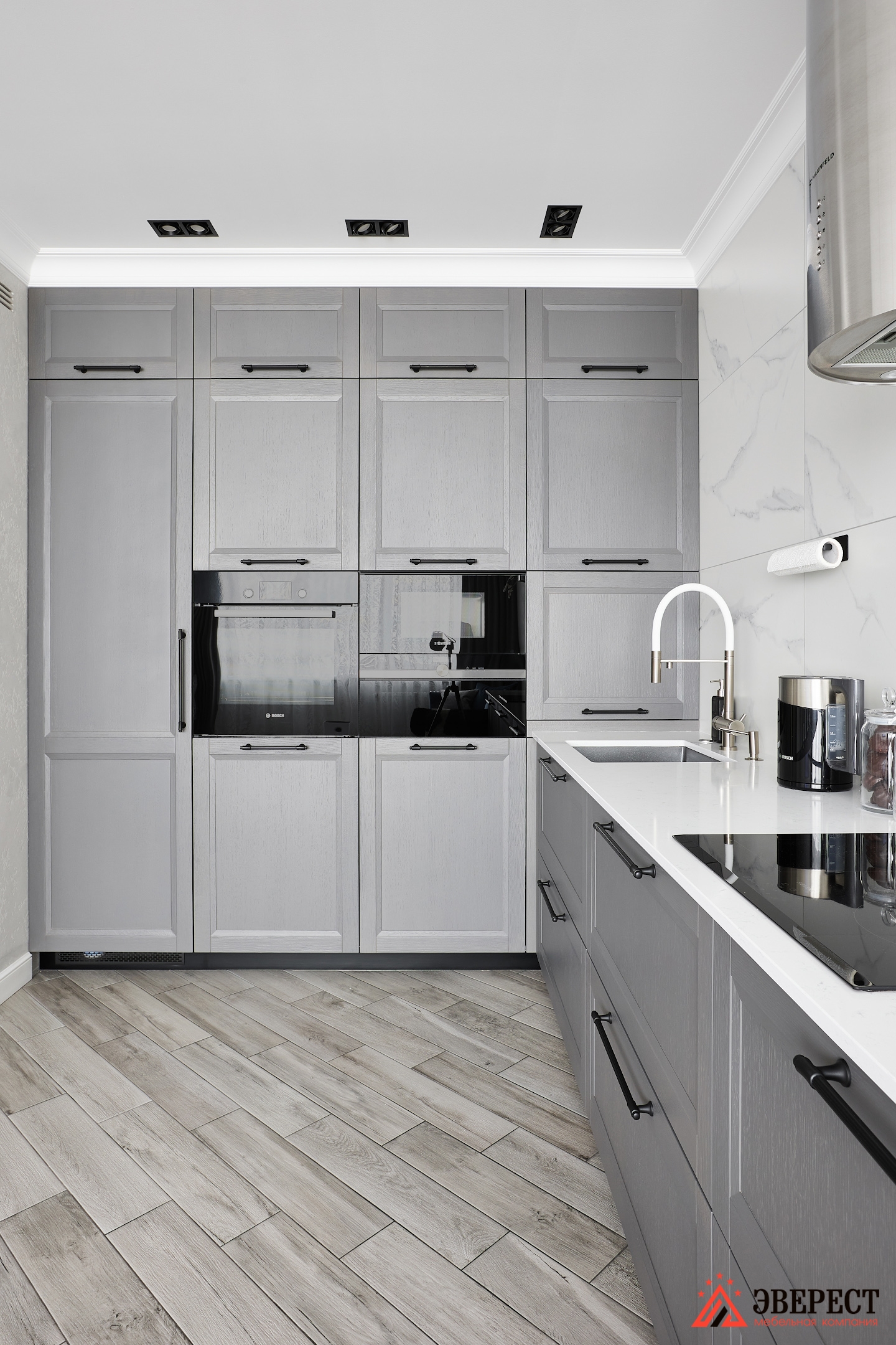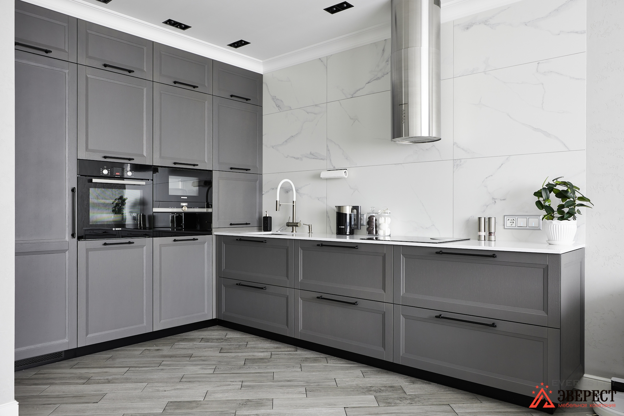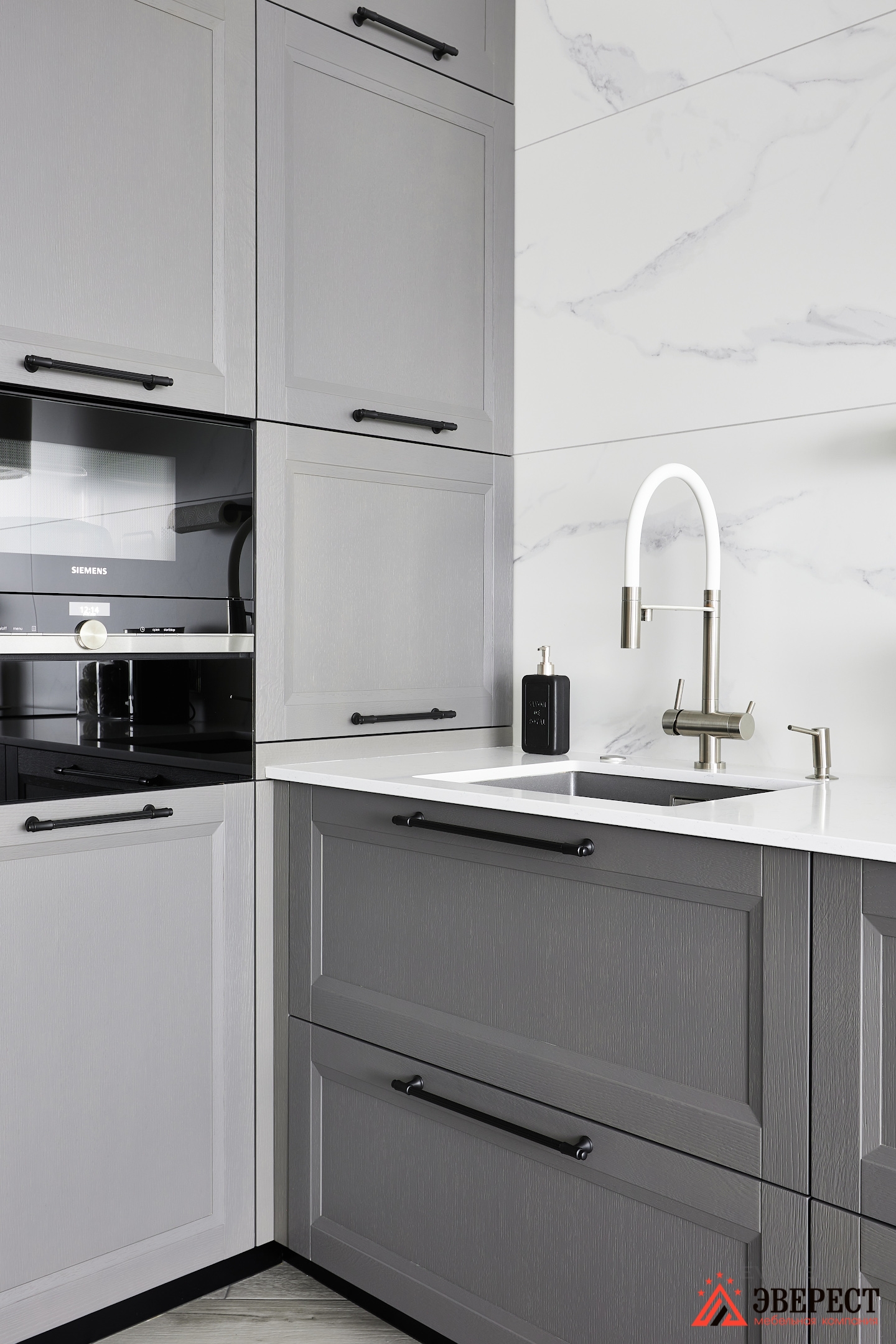 Темные и светлые фасады из пленочной МДФ. Ширина кухни 230 см.