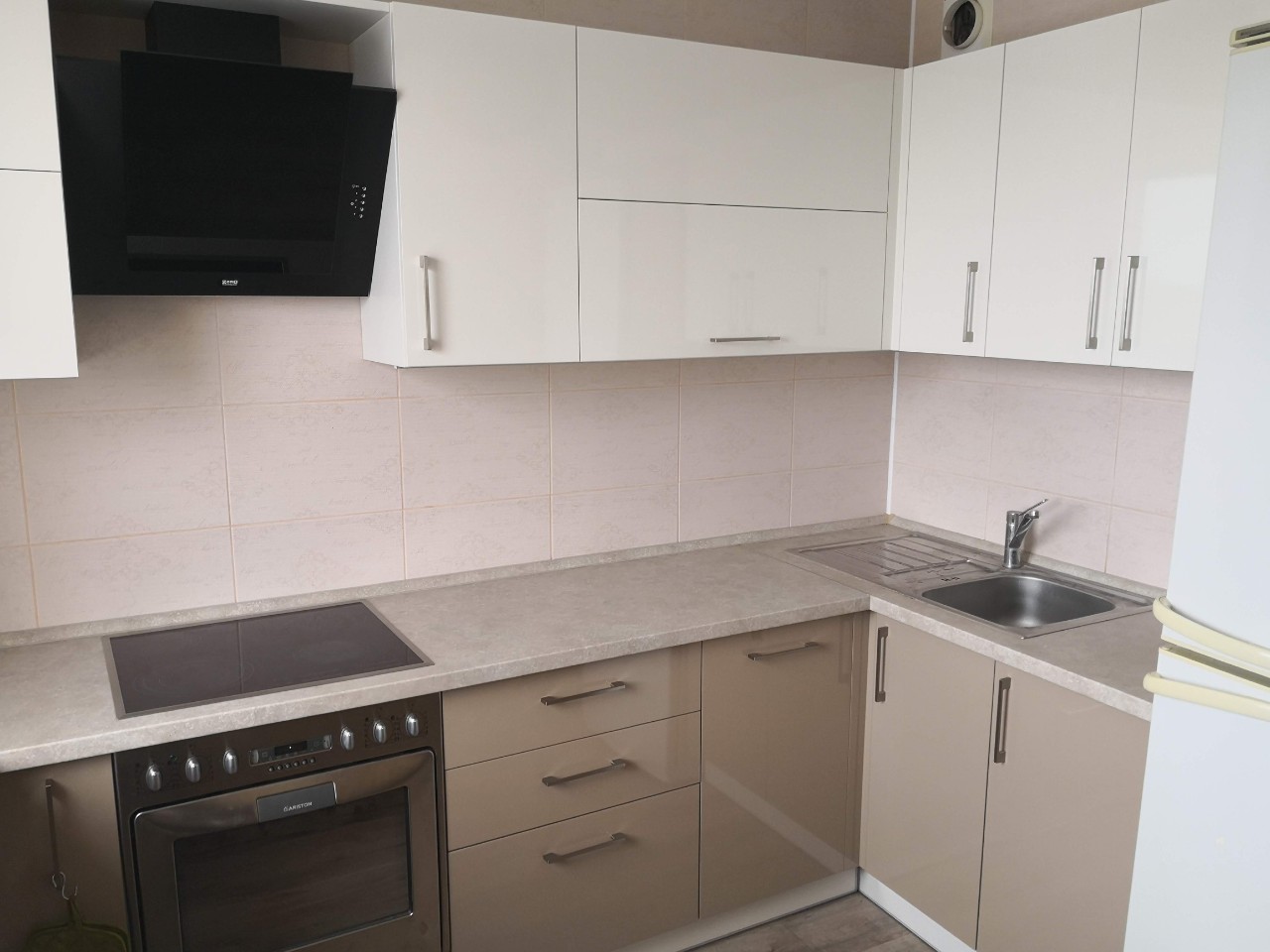Угловая кухня из пластика с комбинированными светлыми фасадами