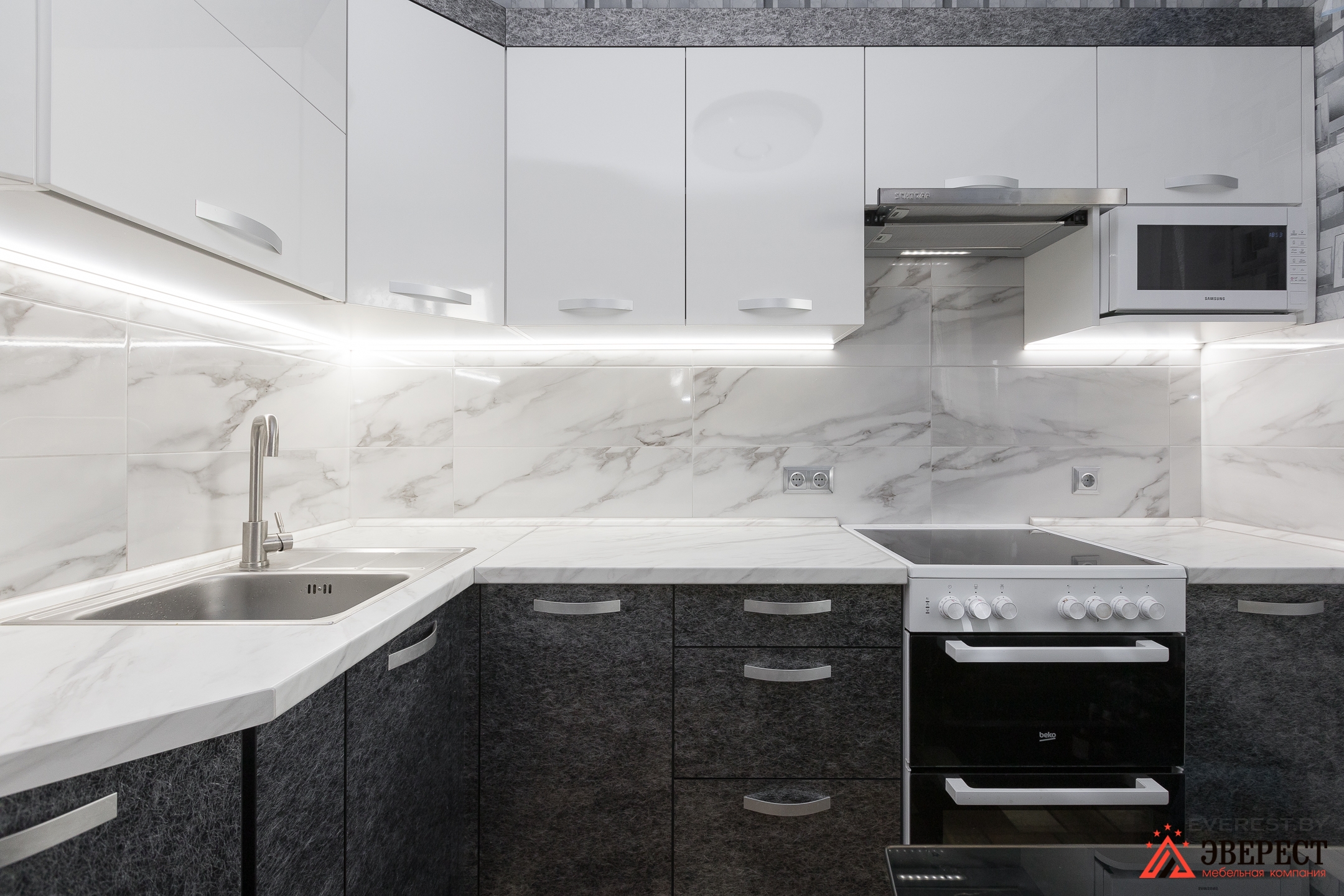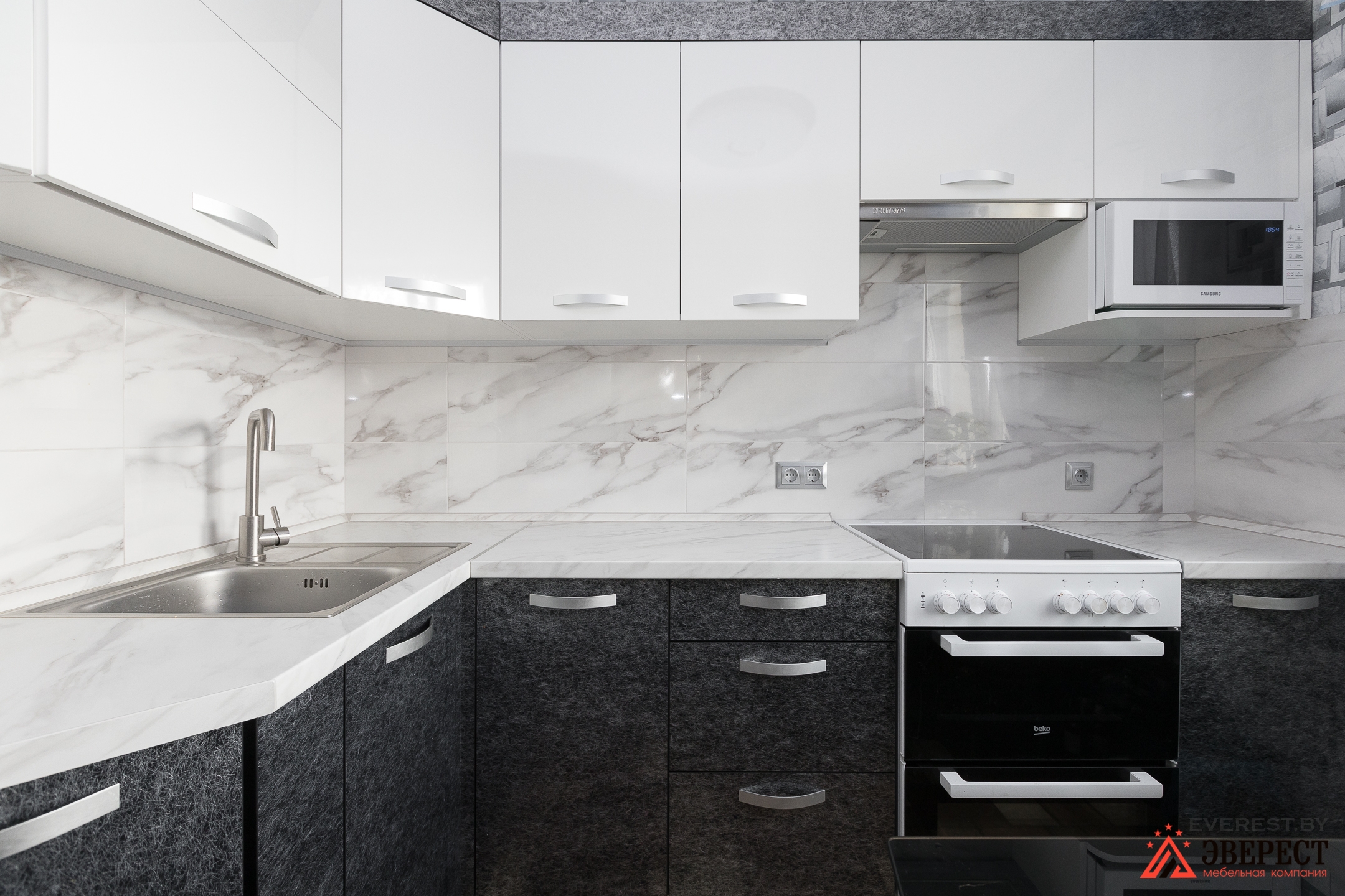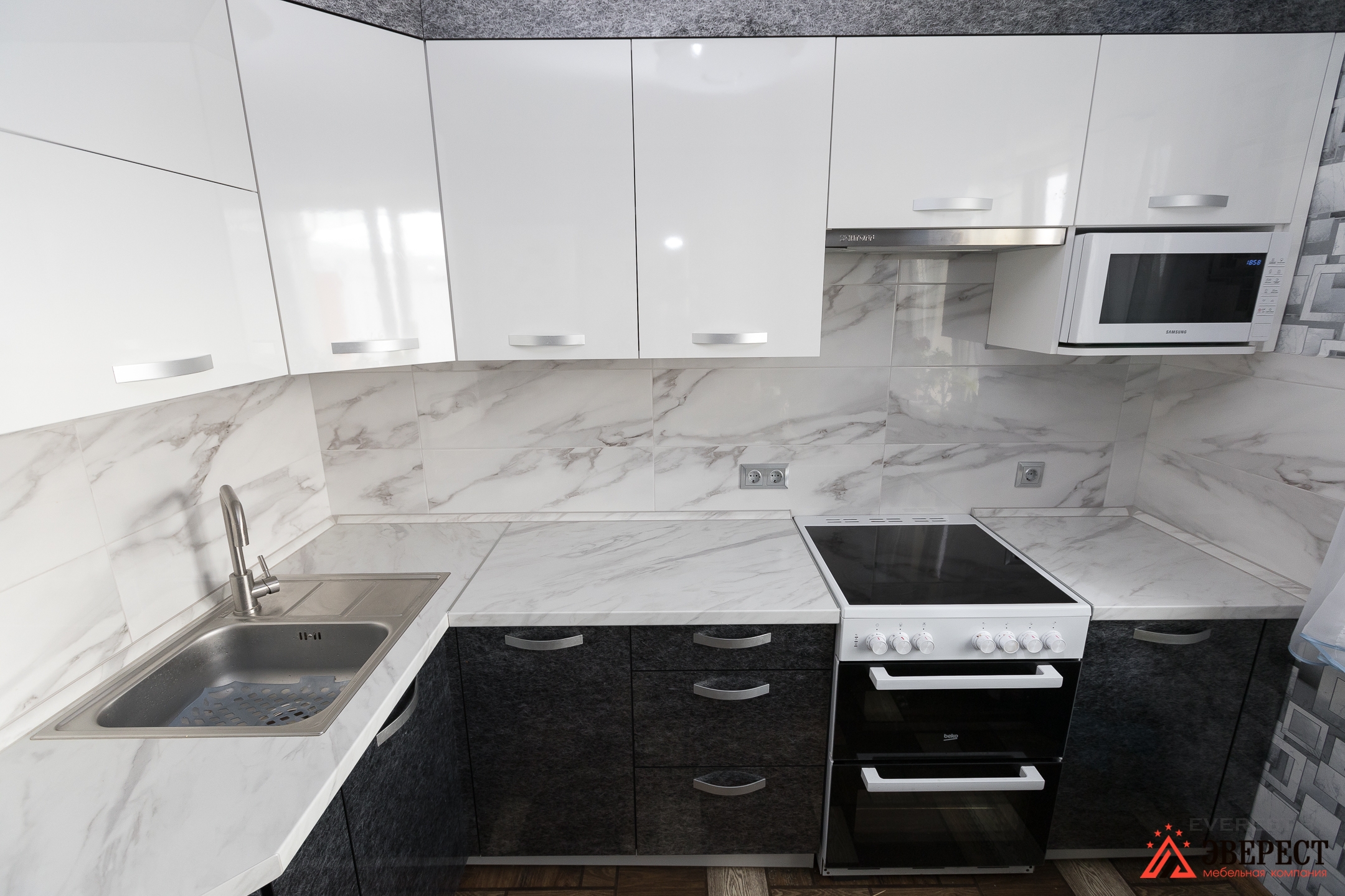 Оригинальная угловая кухня в контрастной расцветке. Комбинированные фасады.