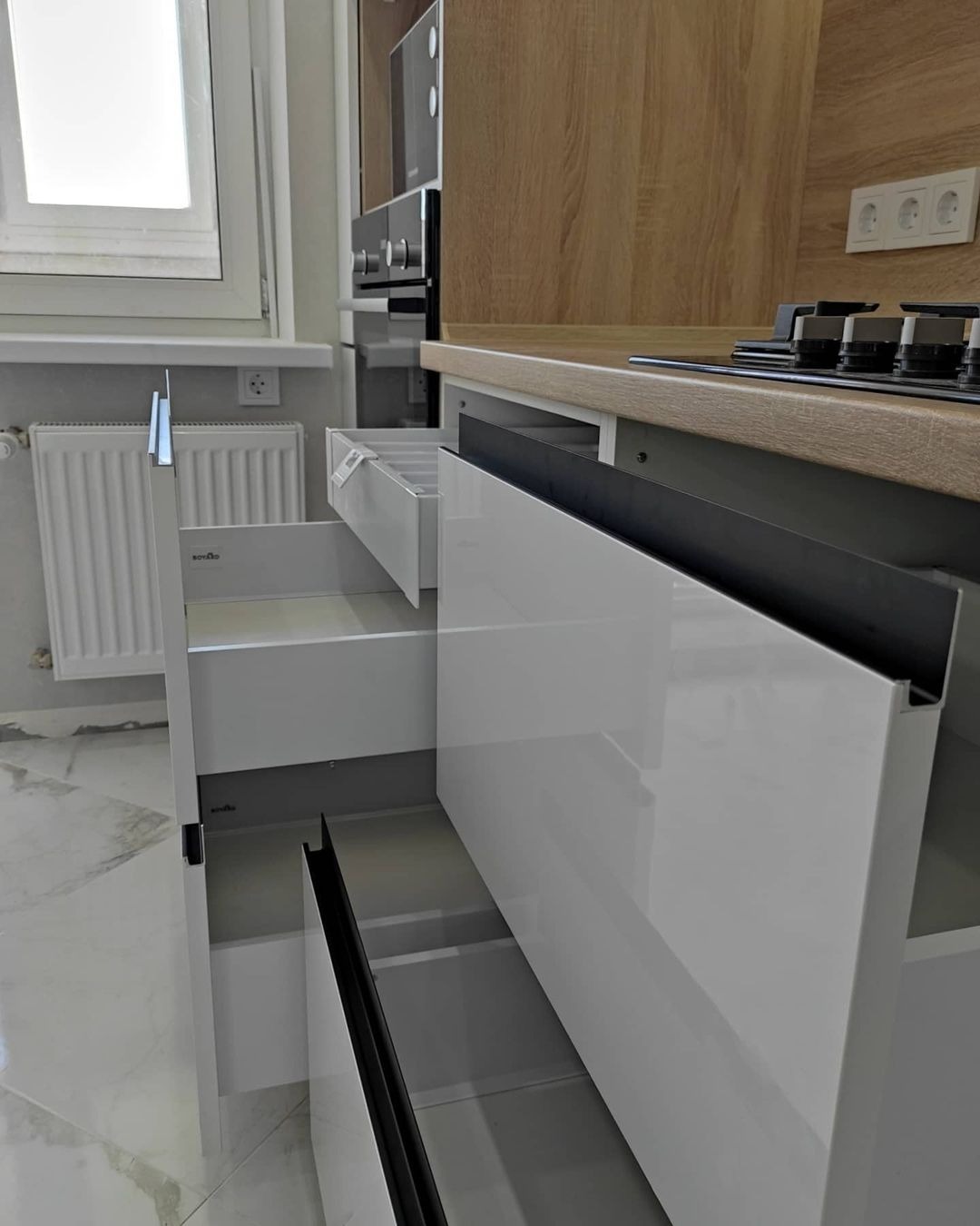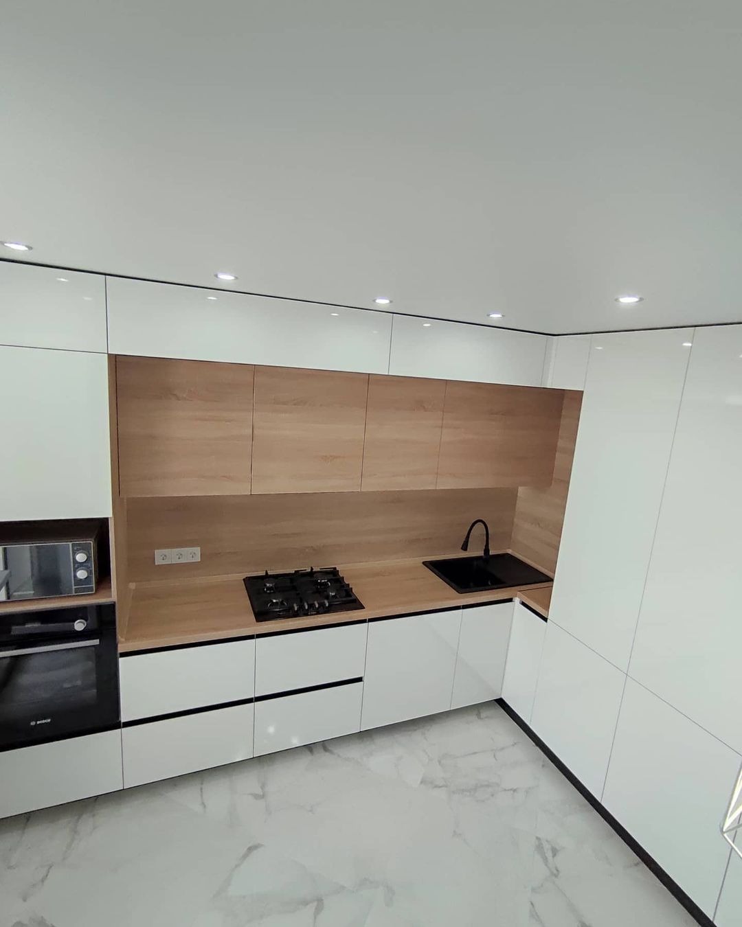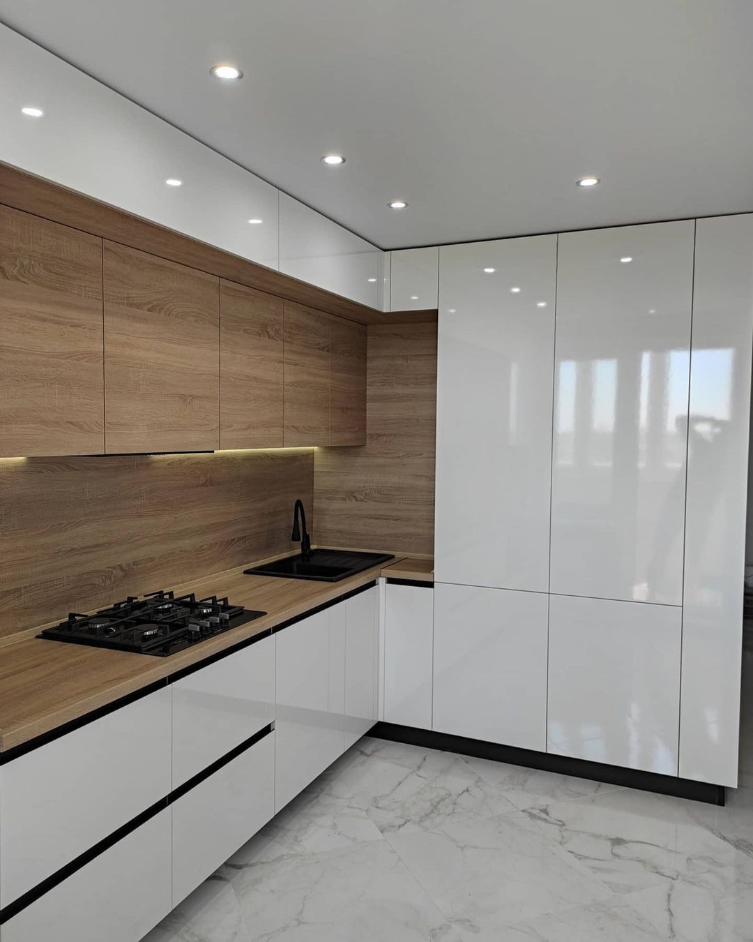 Сочетание глянцевой поверхности и древесной текстуры фасадов.