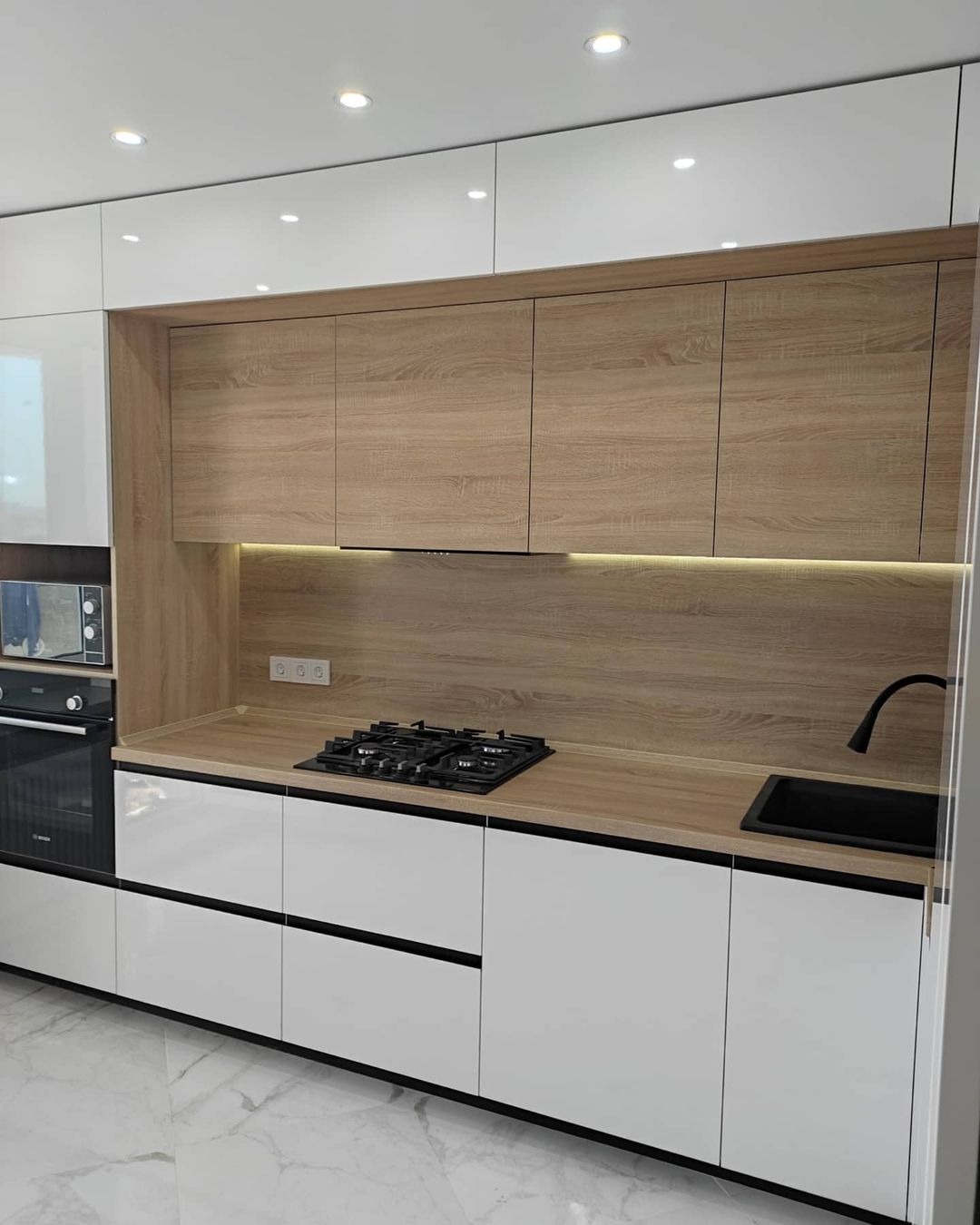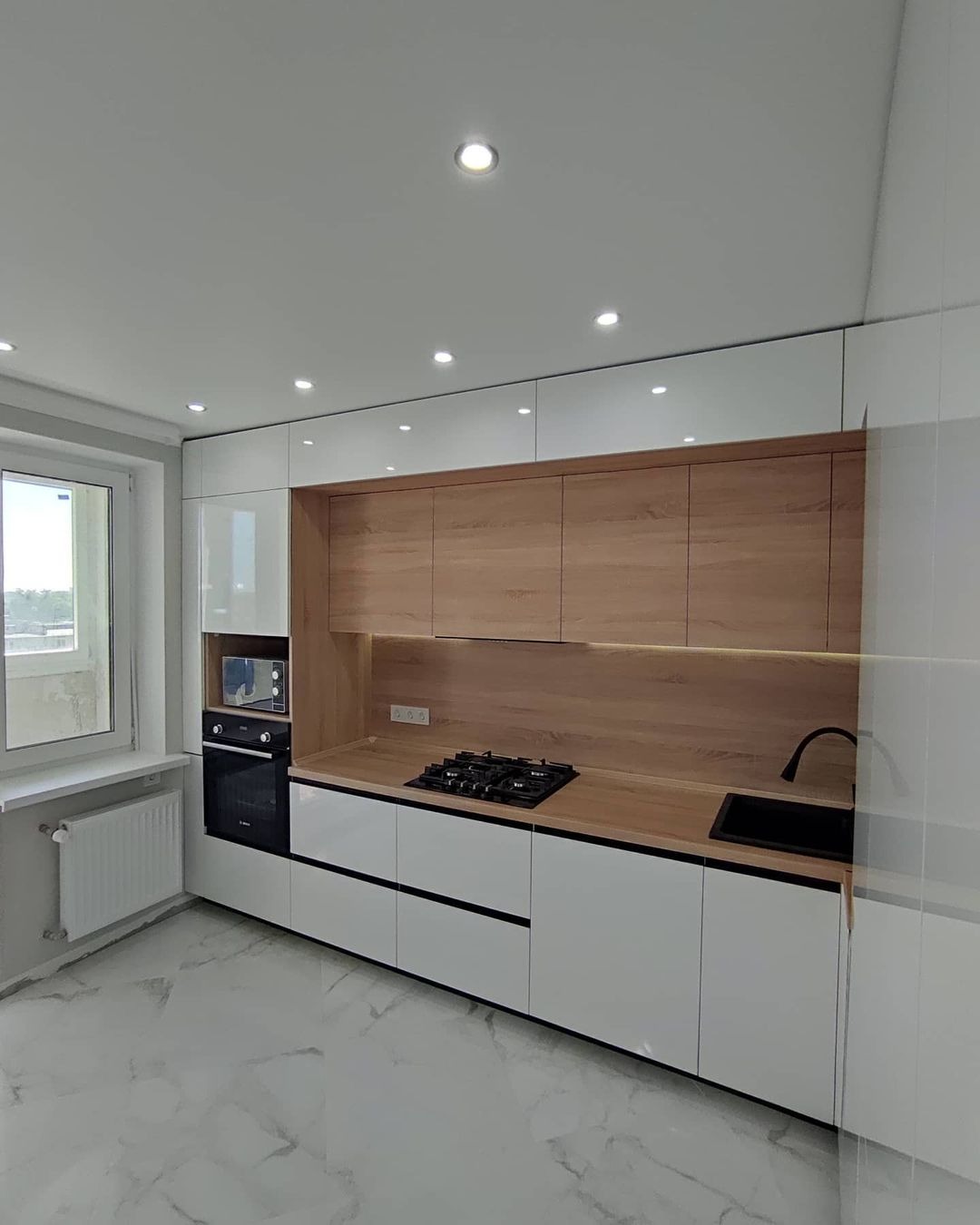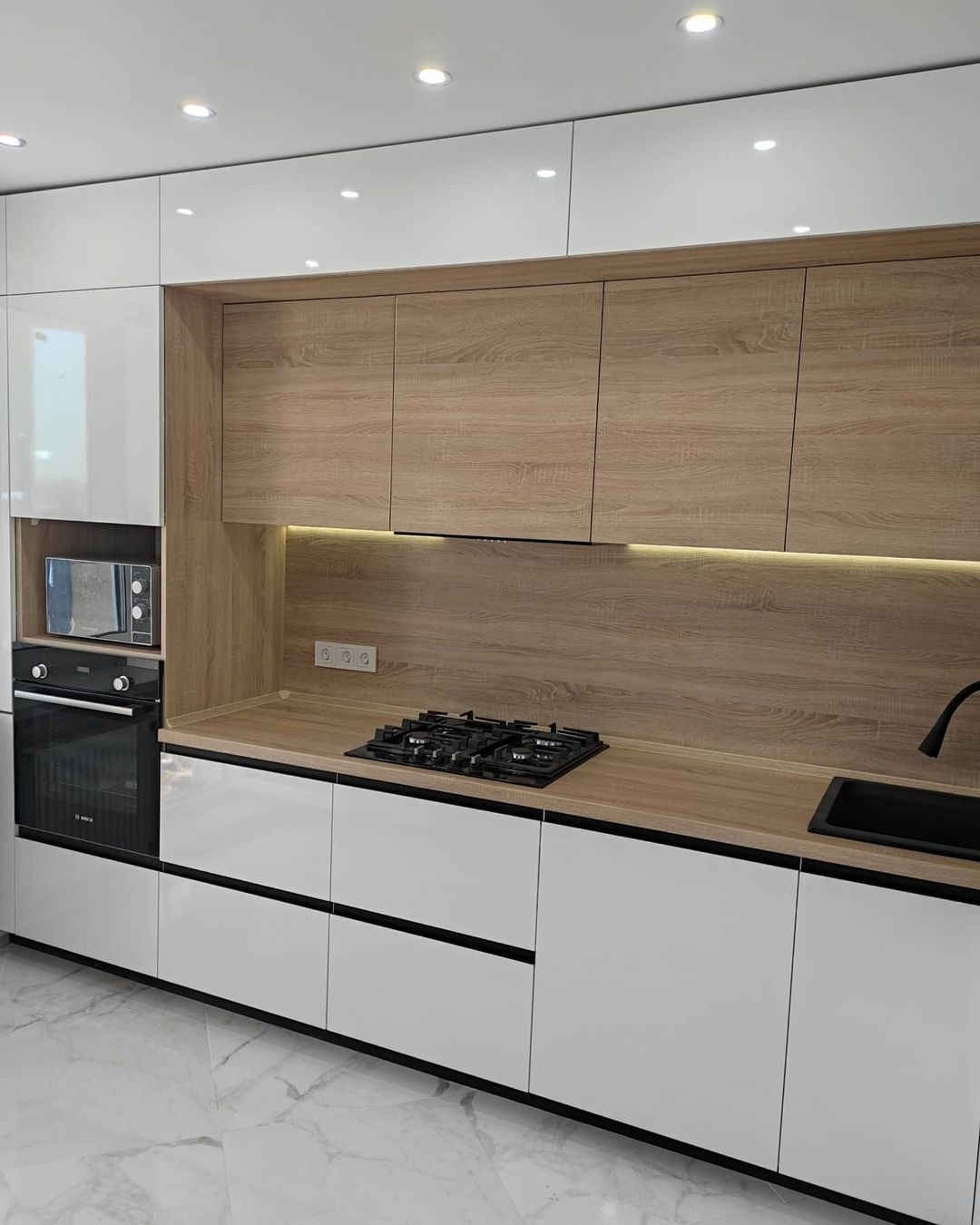 Современная линейная кухня. Разные цветовые решения фасадов и столешницы.