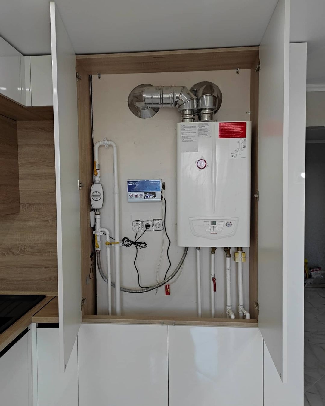 Линейная конструкция, в распашных шкафах закрытые полки.