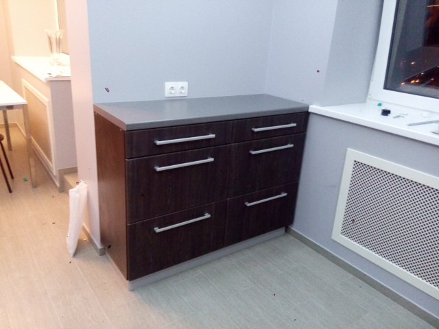 Массивные ручки. Наличие отделений для варочной панели и духовки.
