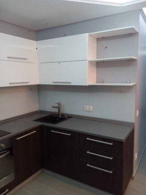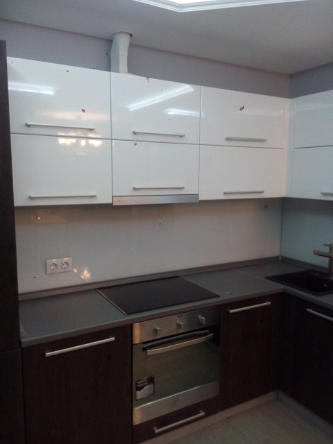Кухня угловая из пластика с вынесенным рабочим местом.