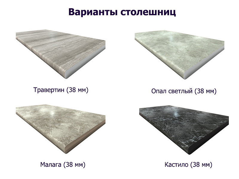 Цвет столешницы на фото: "кастило темный". Иные доступные цвета столешниц для данной модели кухни: "травертин", "опал светлый", "малага" (см. фото 4 в галерее).