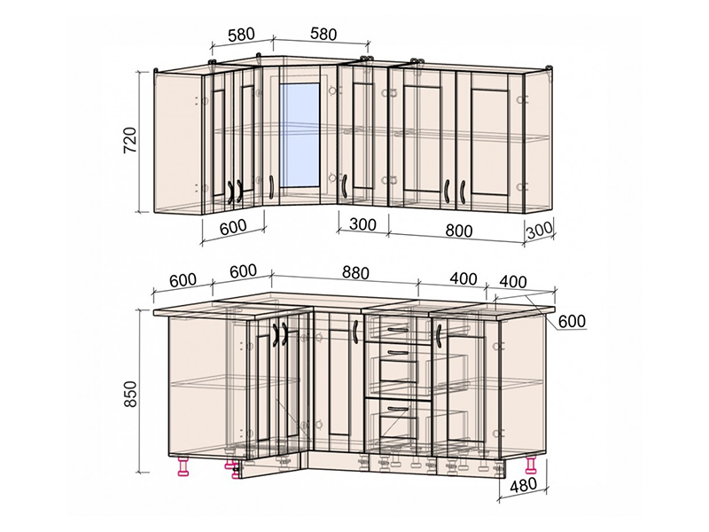 Материал фасада и корпуса: ЛДСП 16 мм. Ширина кухни 150 см.
