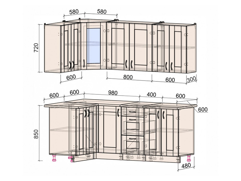 Цвет фасада (низ/верх): дуб венге/дуб молочный.