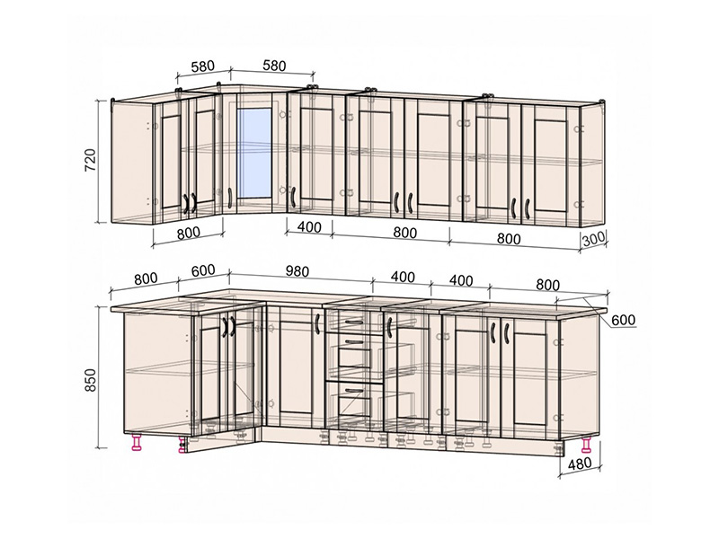 Общая ширина кухни: 2800 мм.