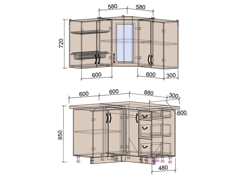 Фурнитура: дверные петли с доводчиками, шариковые направляющие, мебельная опора, кухонные навесы, ручка "Апрель", ручка "Верона", сушка для посуды.