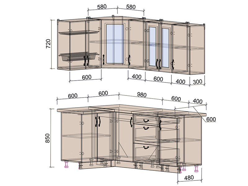 Фурнитура: дверные петли с доводчиками, шариковые направляющие, мебельная опора, кухонные навесы, ручка "Апрель", ручка "Верона", сушка для посуды.