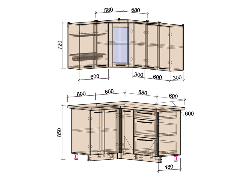 Гарнитур со шкафом-пеналом и двумя шухлядами для посуды.