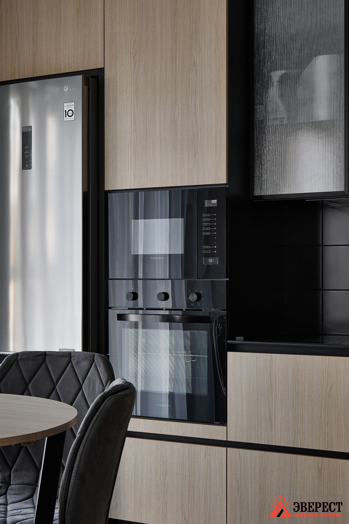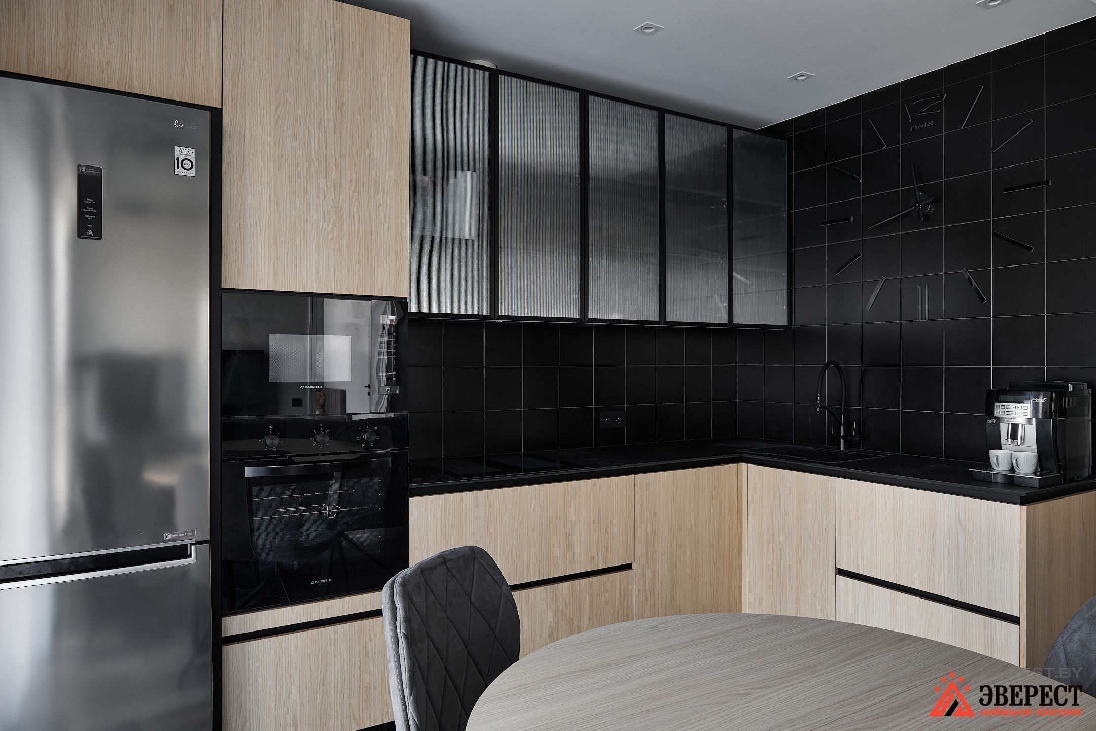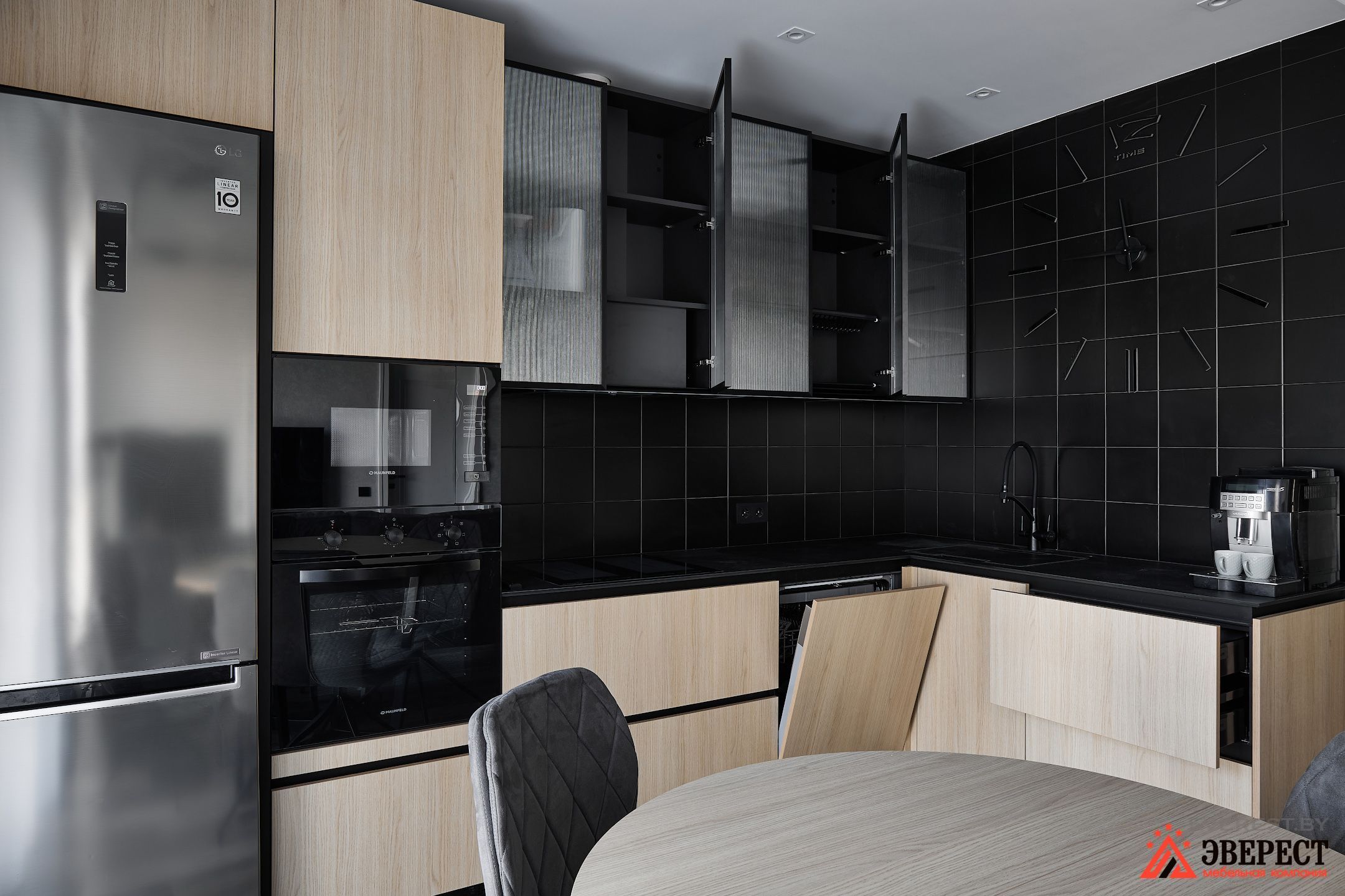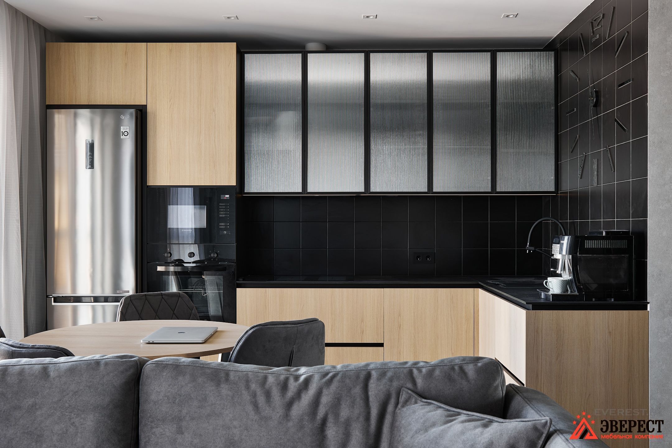 Несмотря на обилие черного цвета, благодаря светлым фасадам кухня не кажется меньше, а само сочетание покоряет своей необычностью.