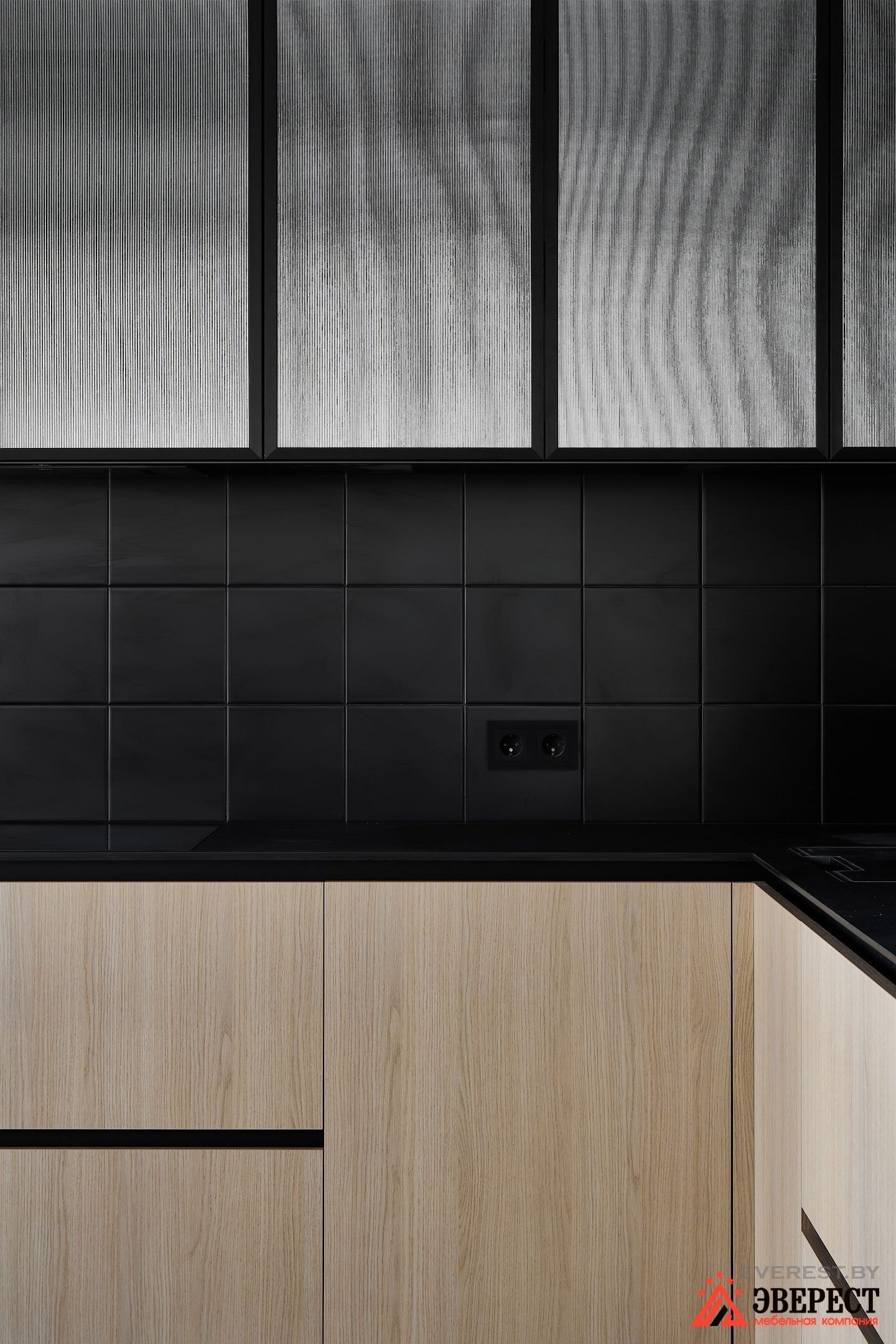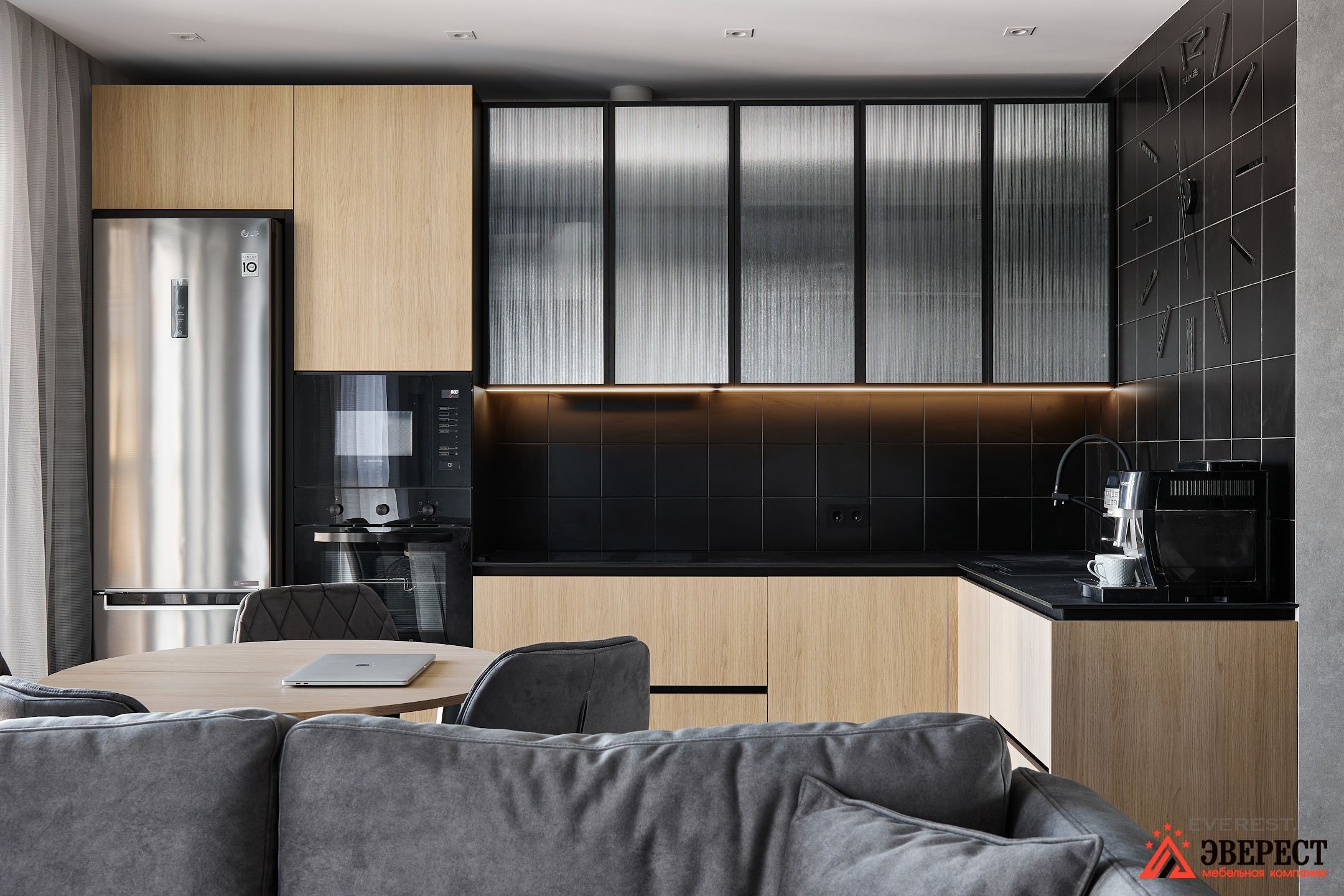 и верхние шкафы с фасадами из рельефного стекла в алюминиевом профиле.