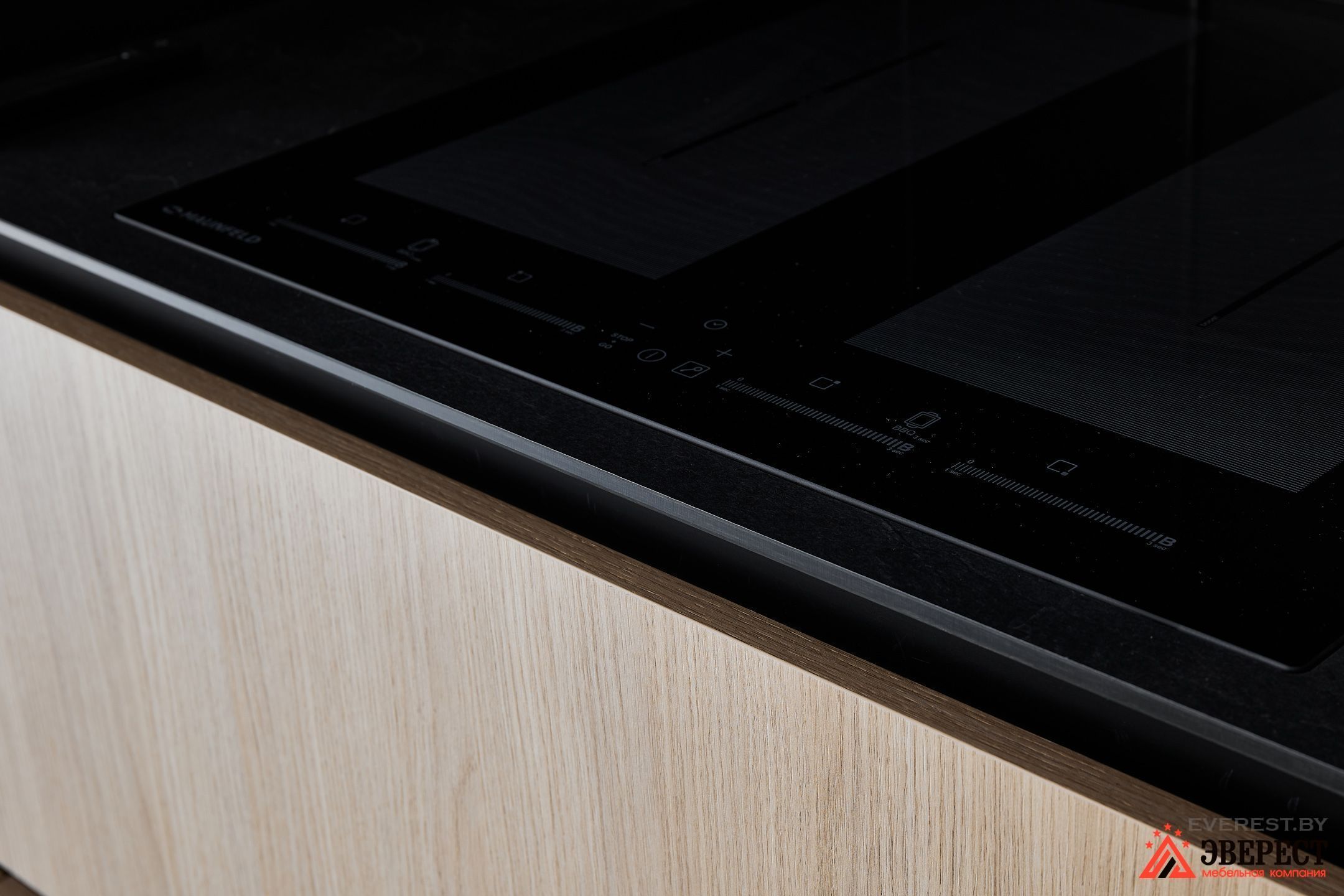 код 139410Фасадами из ЛДСП EGGER и рельефного стекла в алюминиевом профиле. Темная столешница выполнена из компакт-плиты.