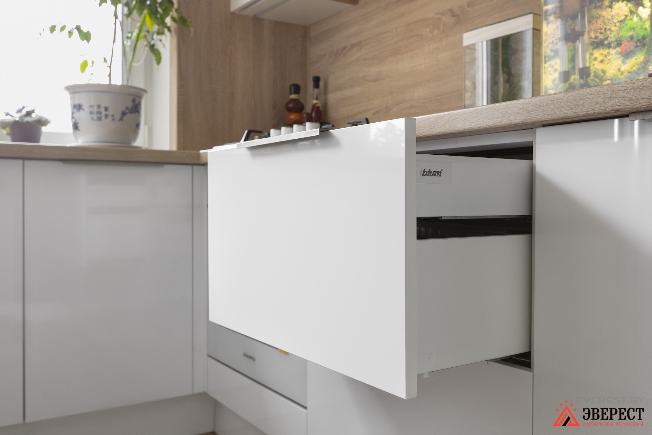 Фасады: акрил. Фурнитура: BLUM с доводчиками. Столешница: постформинг. Врезная подсветка.
