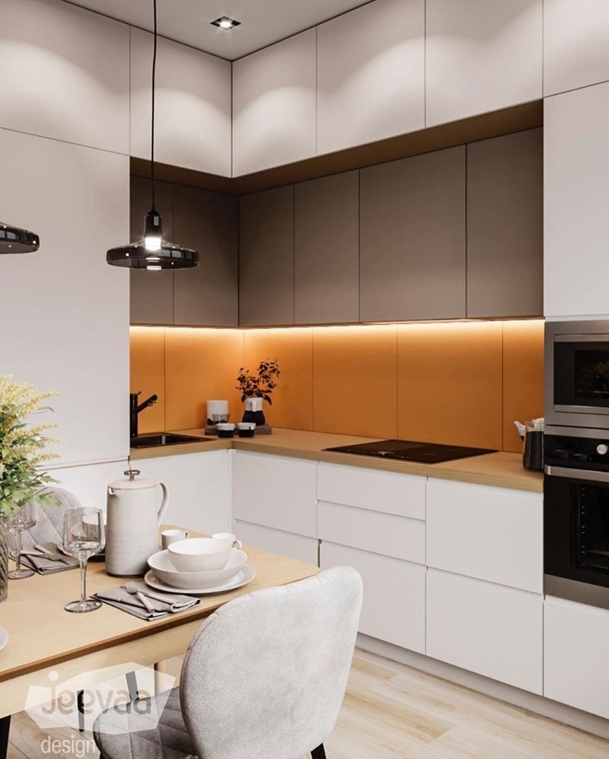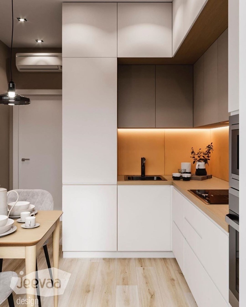 Комбинированные матовые фасады без ручек, ниши для техники,