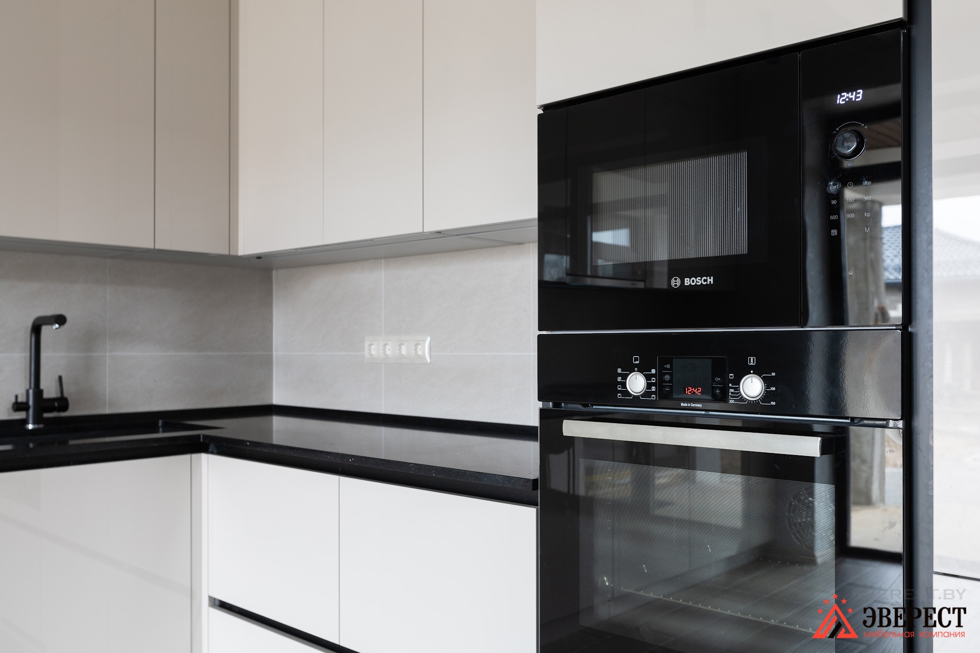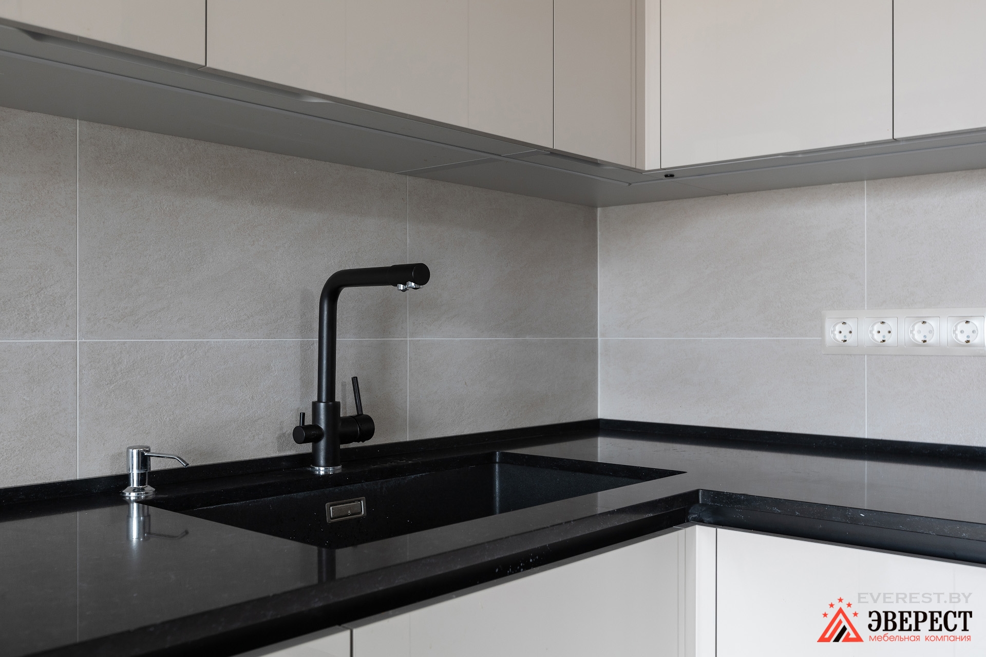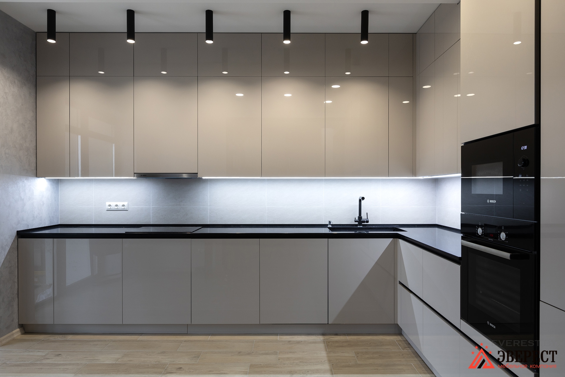 Угловая кухня с большим пеналом. Подсветка. Подвесные верхние шкафы.