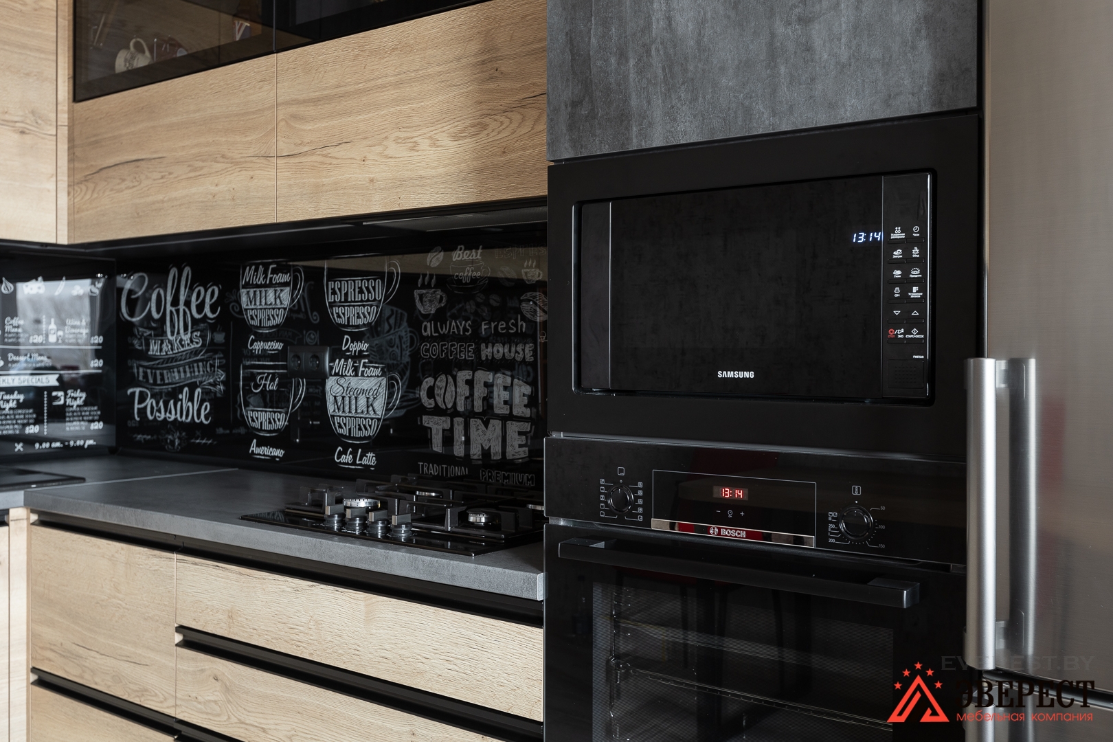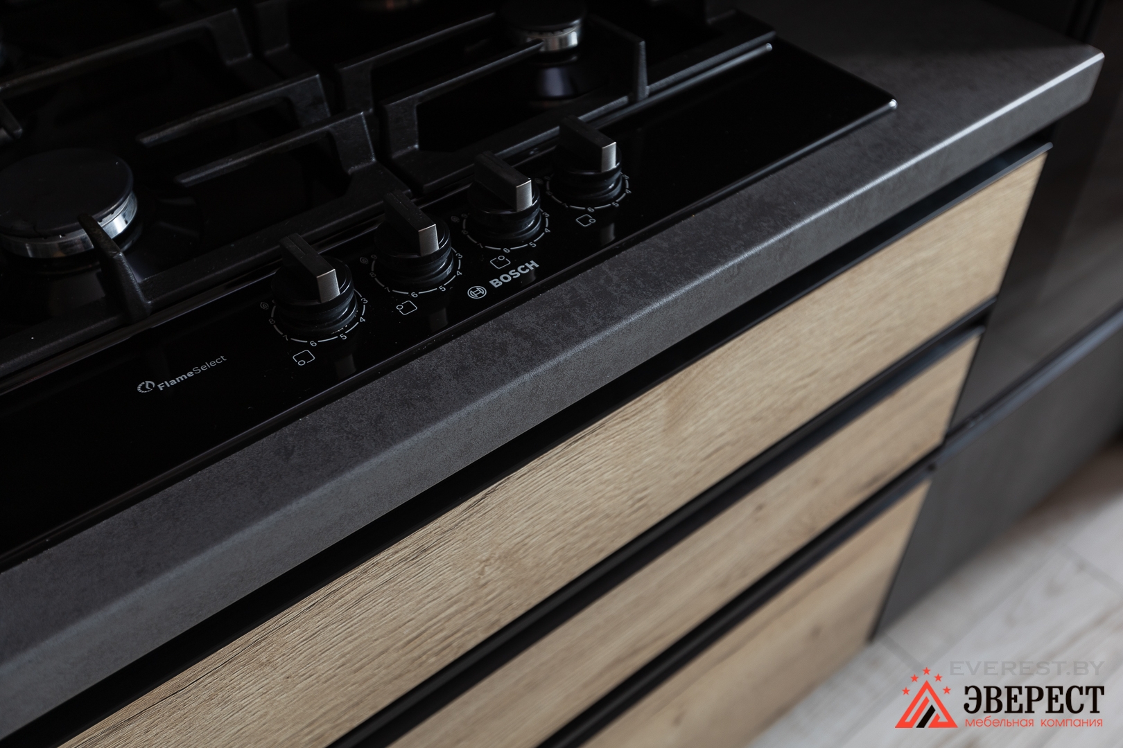 Практичный и надежный гарнитур в сочетании темного и светлого цветов фасада.