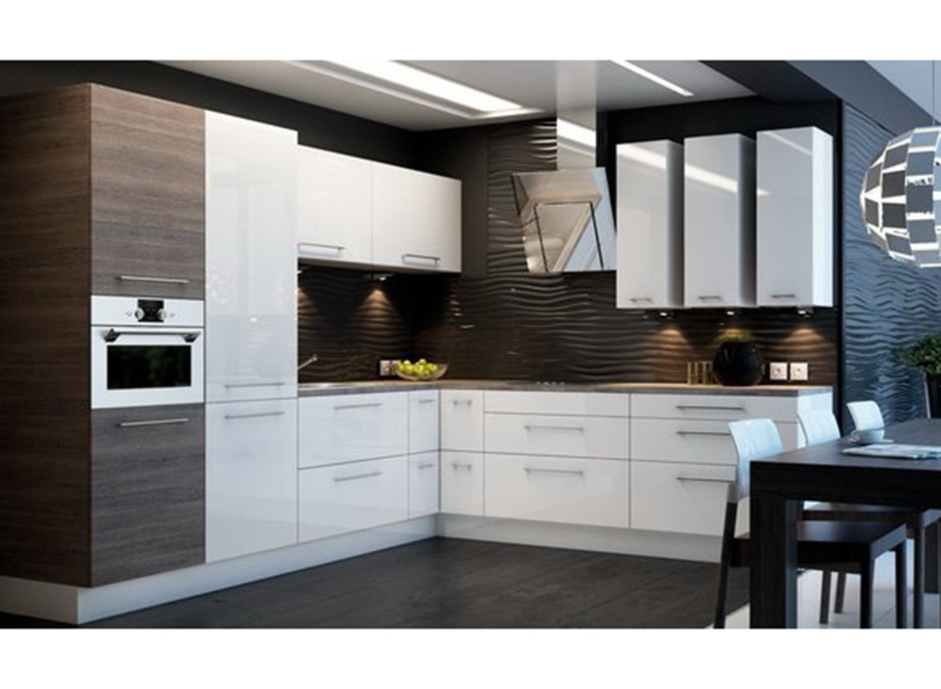 Рациональное использование пространства, вместительные места хранения. Подходит для просторной кухни. Столешница и духовой шкаф цвета темного дерева. Стильный и лаконичный комплект. Возможно изменение размера, комплектации и цвета. Подъемные механизмы верхних шкафов «Blum», петли с доводчиком, выдвижные ящики «GTV MB», ручки профиль «Gola», угловые выдвижные ящики «Space Corner».