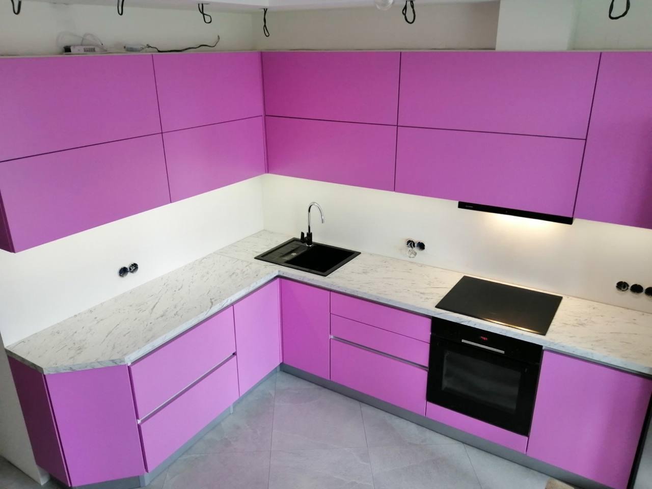 Угловая кухня с открытыми и закрытыми полками. Матовые фасады.
