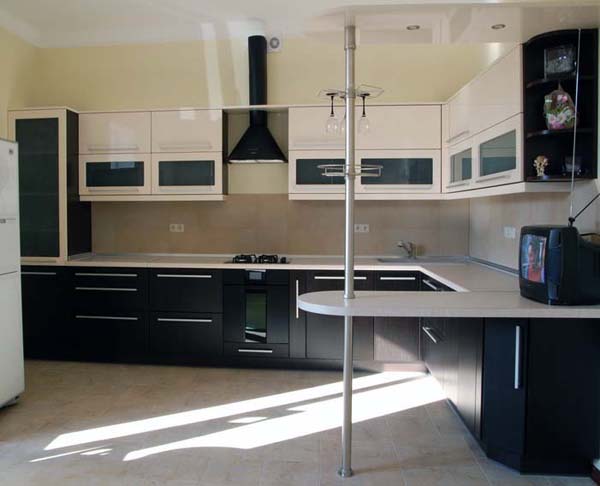 Представленная угловая кухня имеет темные стеклянные вставки в створках шкафчиков. Также гарнитур оснащен барной стойкой с шестом, который служит одновременно и его опорой, и держателем для бокалов. Барную стойку можно использовать как обеденное пространство.