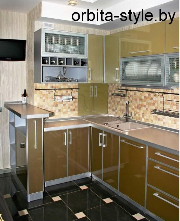 Угловая кухня с барной стойкой и хромированной фурнитурой